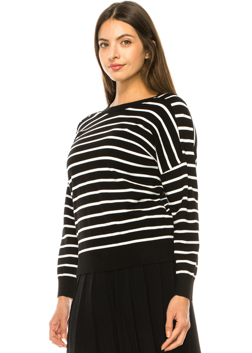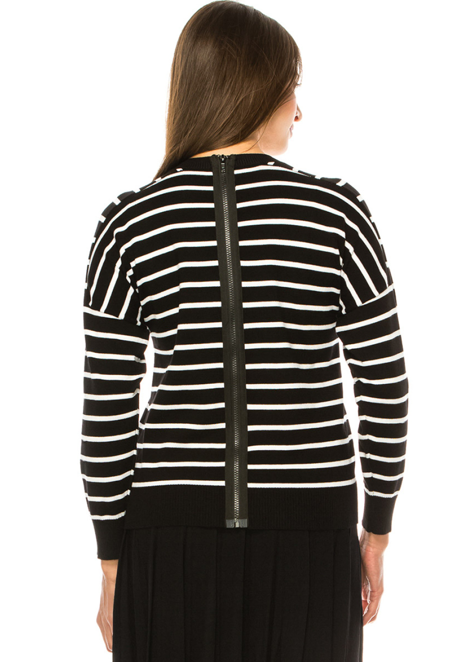 Stay ahead of the fashion curve with our trendy black sweater featuring bold and stylish white stripes and a flattering dropped shoulder design. The luxurious knit fabric and unique zipper detail at the back make it a must-have for any fashion-forward wardrobe.