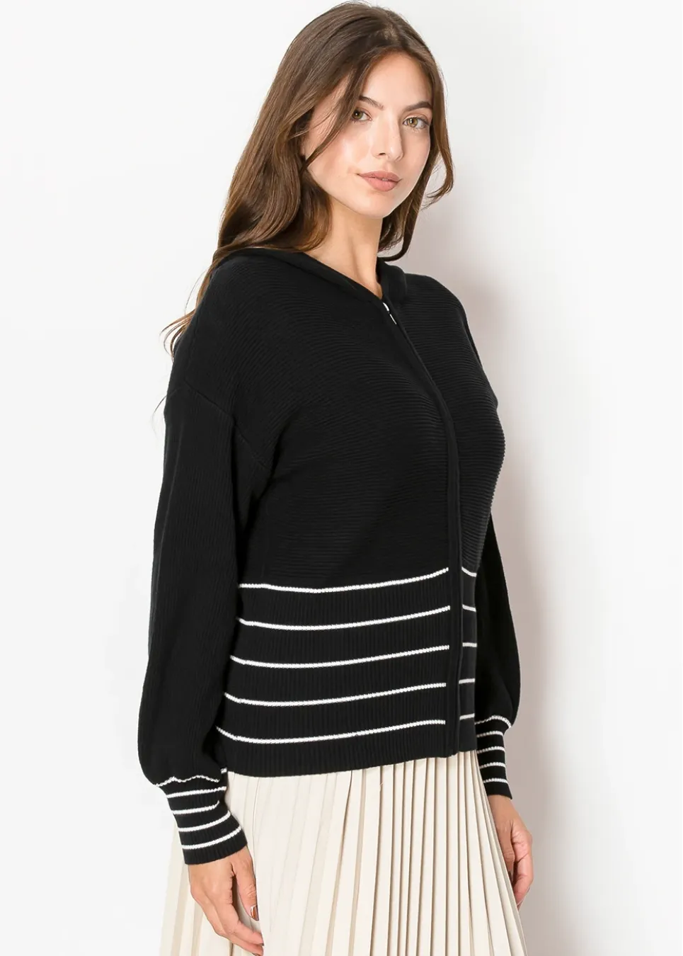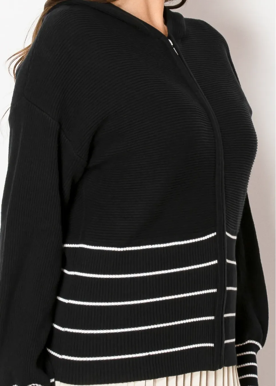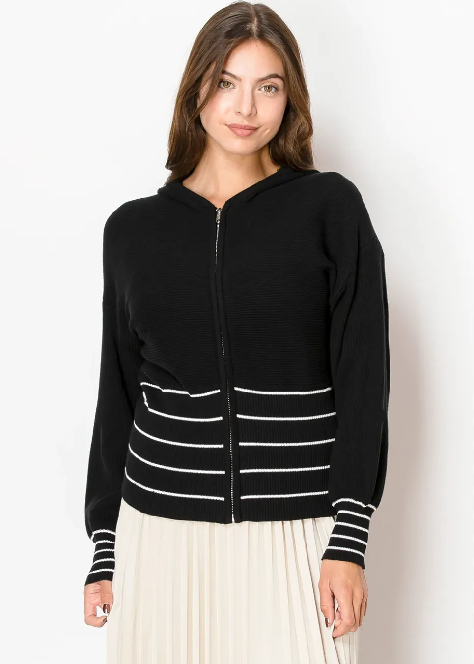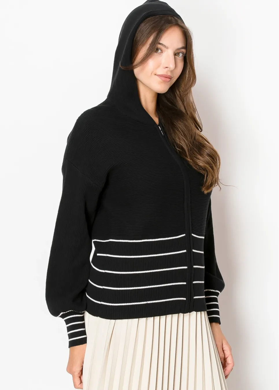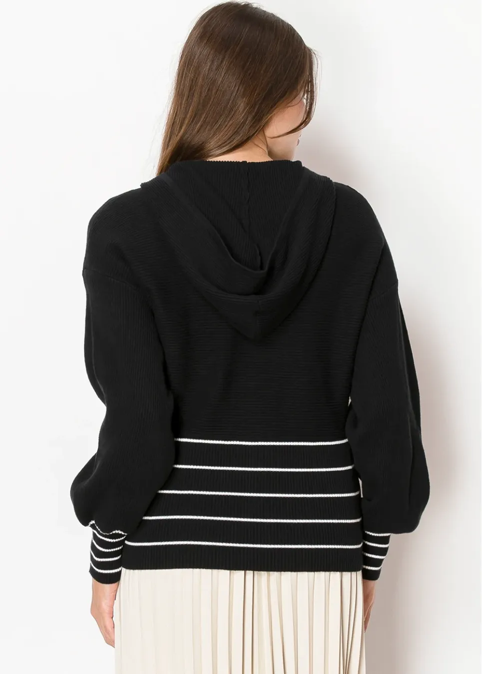 Sometimes, all you need is a classic hoodie with just the right amount of detail. The white stripes on this one add a clean contrast against the deep black knit, while the ribbed texture gives it structure. A perfect balance of comfy and polished.
