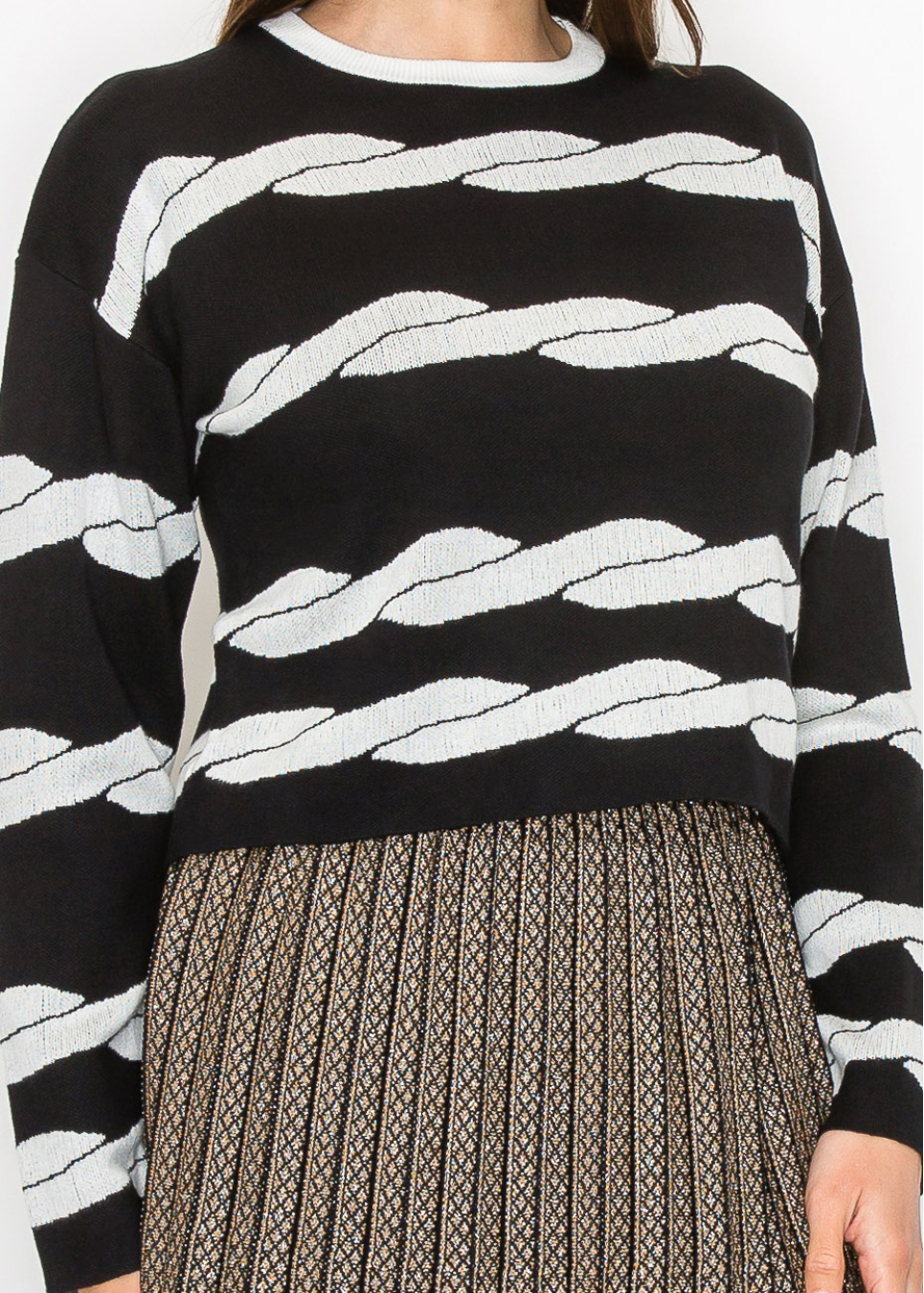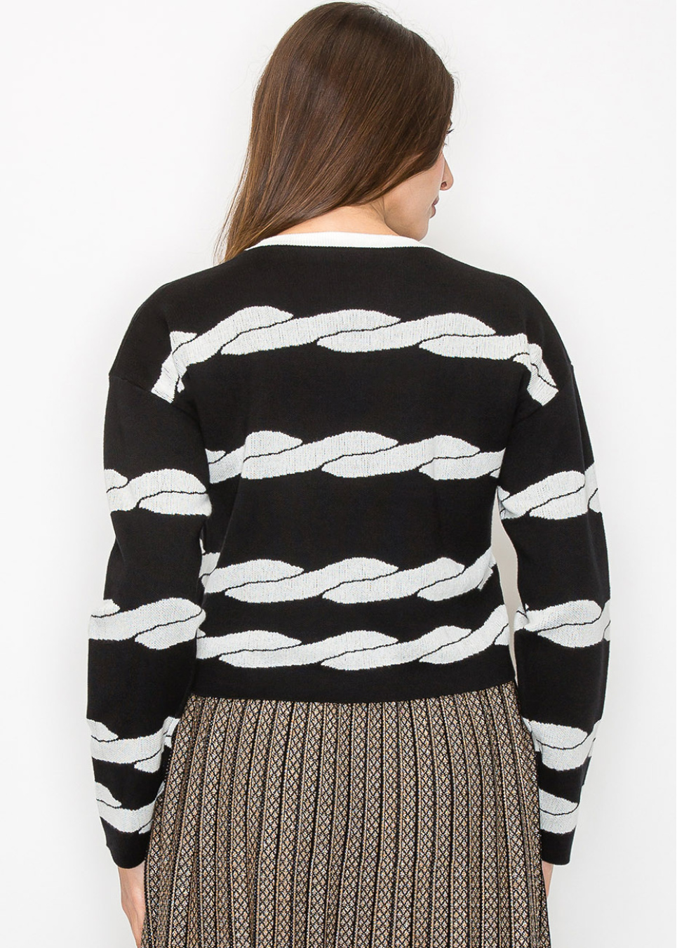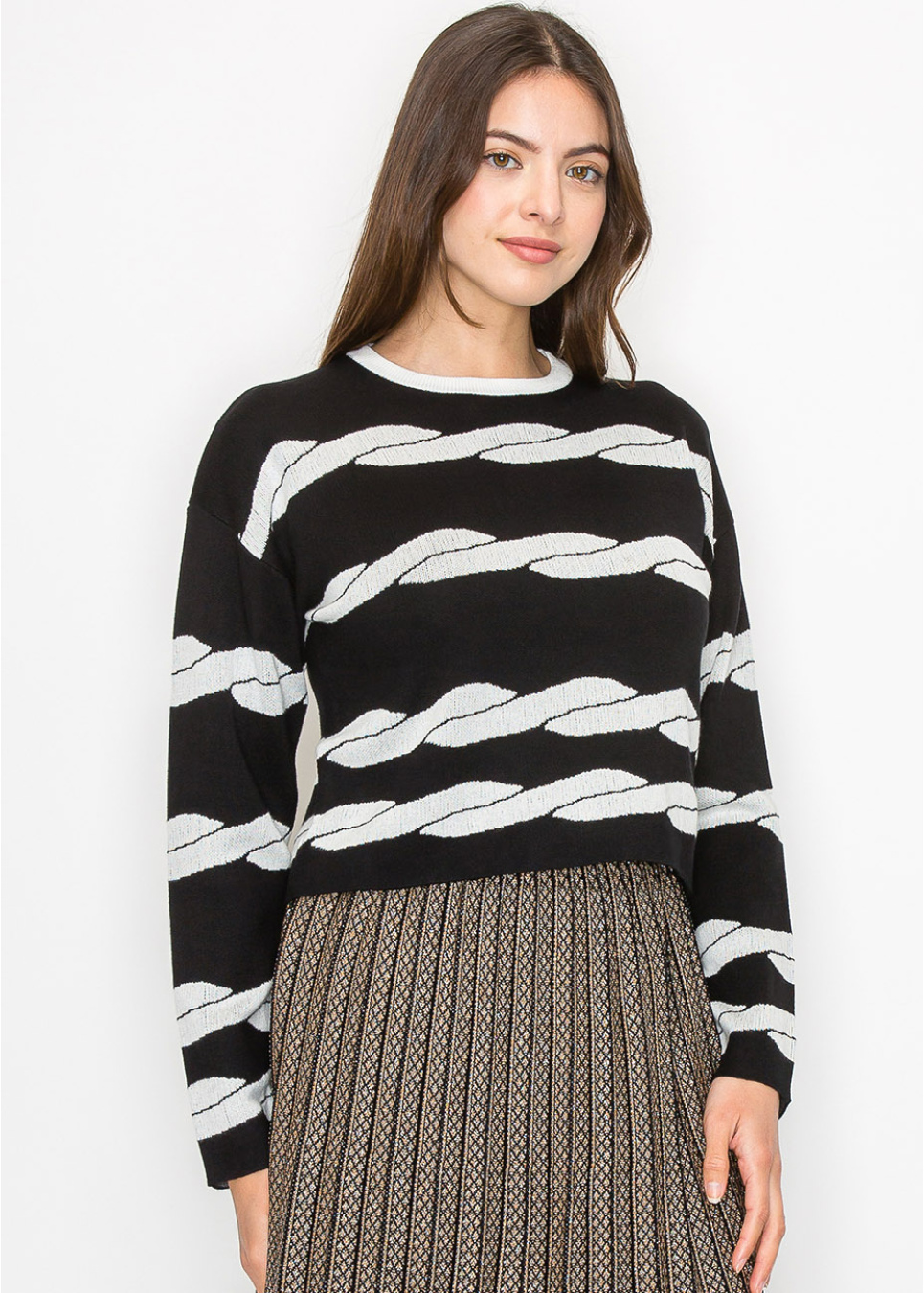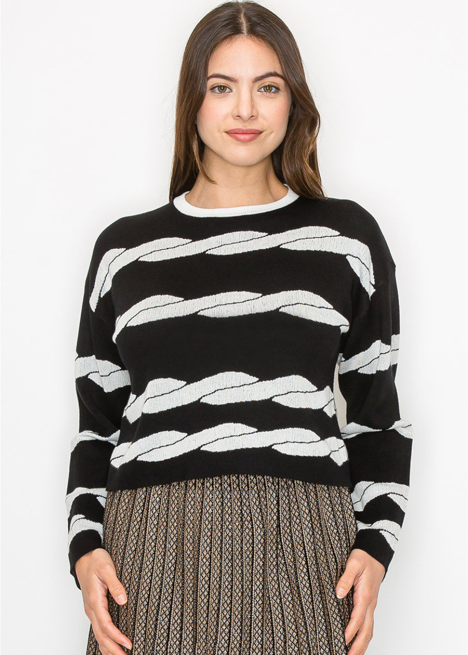 A mix of modern design and everyday comfort, this black and white swirl-patterned sweater adds flair to your outfit. The lightweight knit fabric makes it easy to wear through the seasons, and the modest cut ensures it’s a versatile choice for any occasion.
