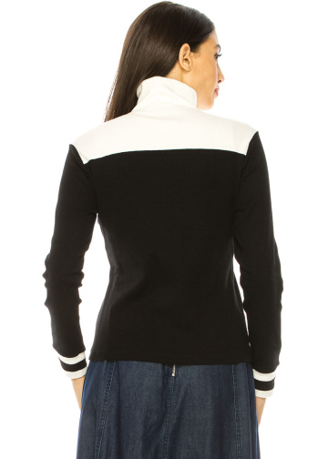 Stay comfortable and fashionable with this black and white color-blocked long sleeve t-shirt. The zip closure and high collar create a modern look, while the elastic cuffs with stripes add a sporty touch. Whether you're running errands or meeting up with friends, this shirt is the perfect choice for any casual occasion.