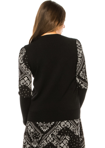 Make a statement in this black sweater featuring unique bandana accents on the sleeves. The leg-of-mutton sleeves add a touch of elegance, while the high cuffs and classic cut provide a timeless look. The ribbed cuffs and hem offer warmth and comfort, and the high-quality fabric promises a cozy and durable fit. This sweater is the perfect addition to your wardrobe, offering both style and comfort.