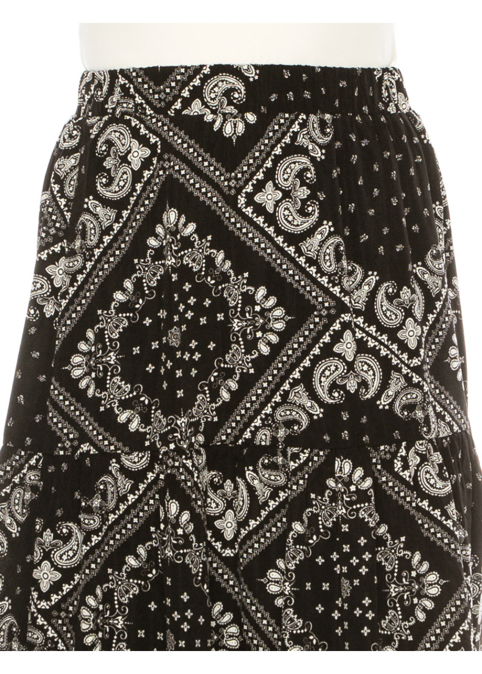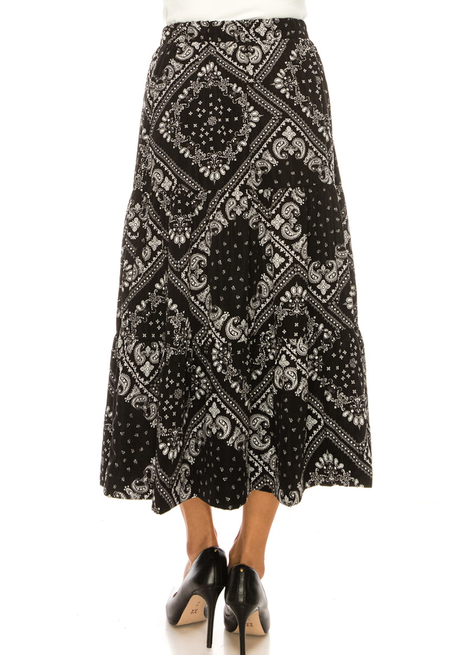 Prepare to add some attitude to your wardrobe with this stunning black bandana print midi skirt. The tiered design creates a flowy and feminine silhouette, while the elastic waist ensures a comfortable and modest fit. This versatile skirt is sure to become a favorite in your wardrobe.