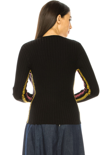 Add a touch of vintage charm to your wardrobe with this black ribbed sweater. The soft and lightweight fabric is comfortable to wear, while the delicate embroidered stripes on the sleeves and sides give it a classic touch. Pair it with a midi skirt and heels for a timeless look.