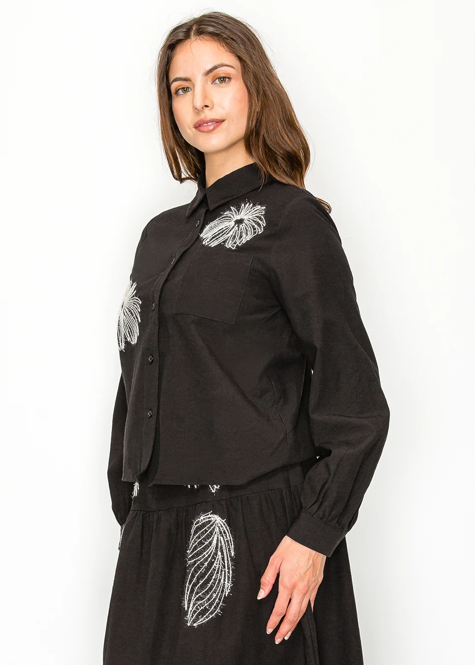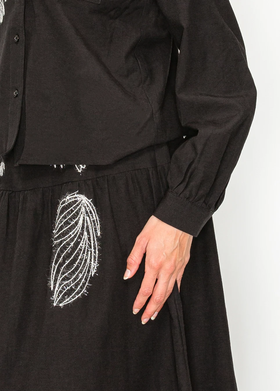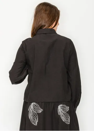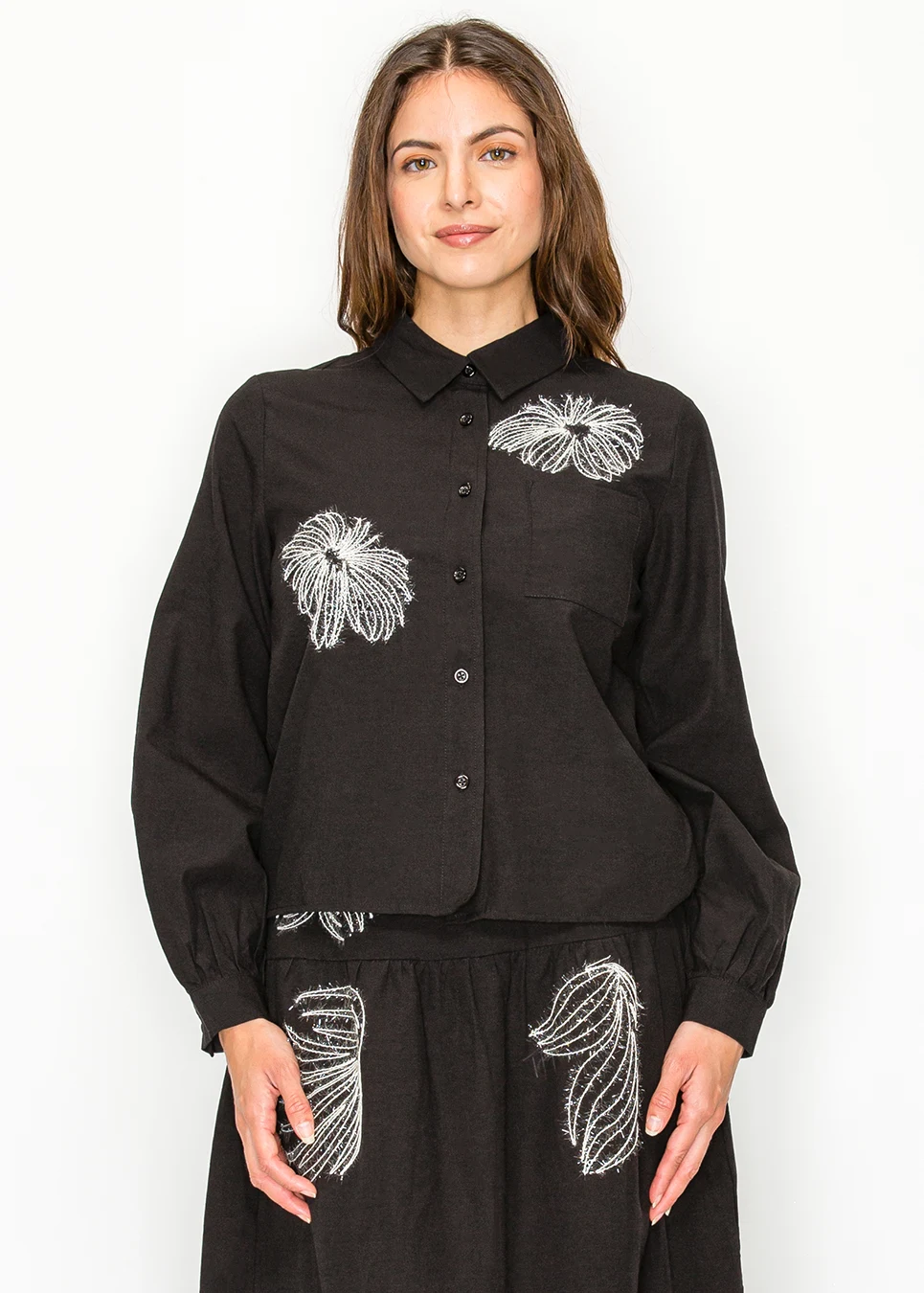 Button-front black blouse. Soft fabric, relaxed fit, elastic cuffs, curved hem. Two placed white embroidered motifs in raised abstract threadwork. That's the spec. In practice: you put it on with a black skirt and the embroidery does enough that no jewelry is required.