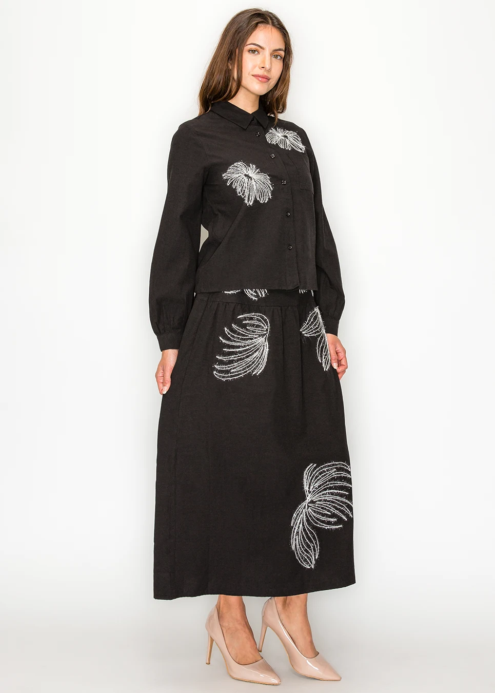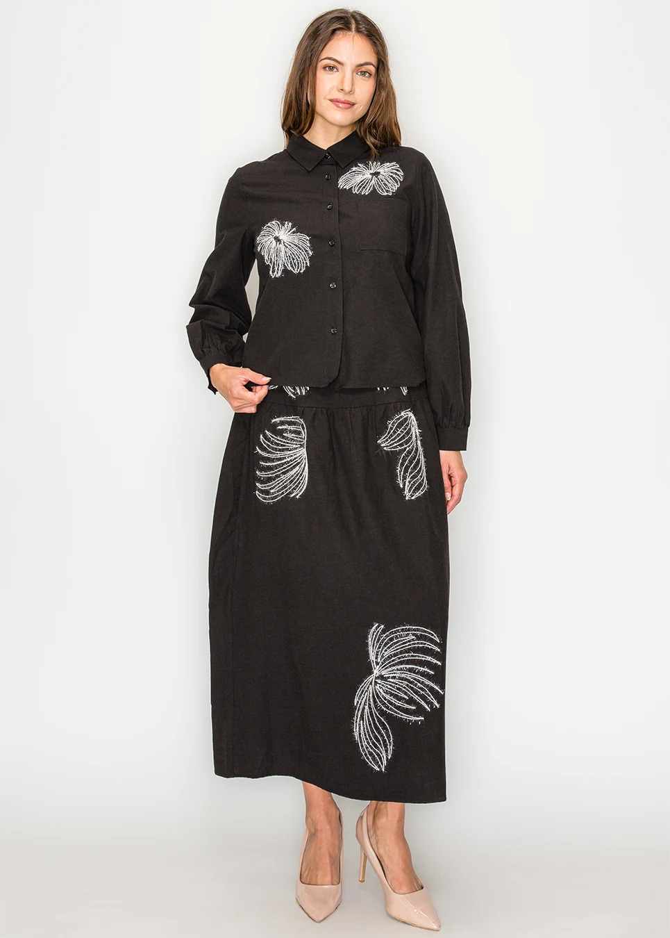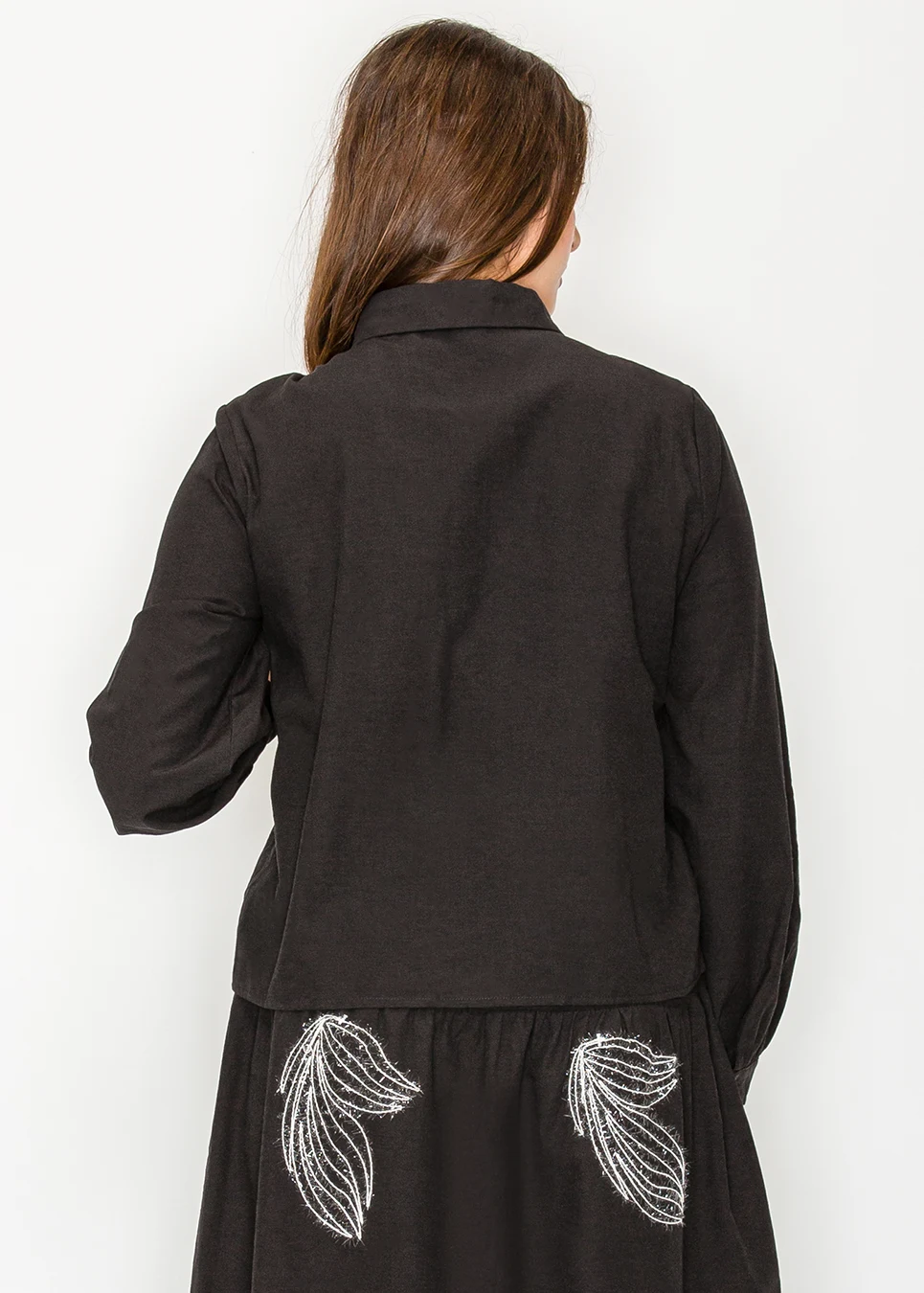 Button-front black blouse. Soft fabric, relaxed fit, elastic cuffs, curved hem. Two placed white embroidered motifs in raised abstract threadwork. That's the spec. In practice: you put it on with a black skirt and the embroidery does enough that no jewelry is required.