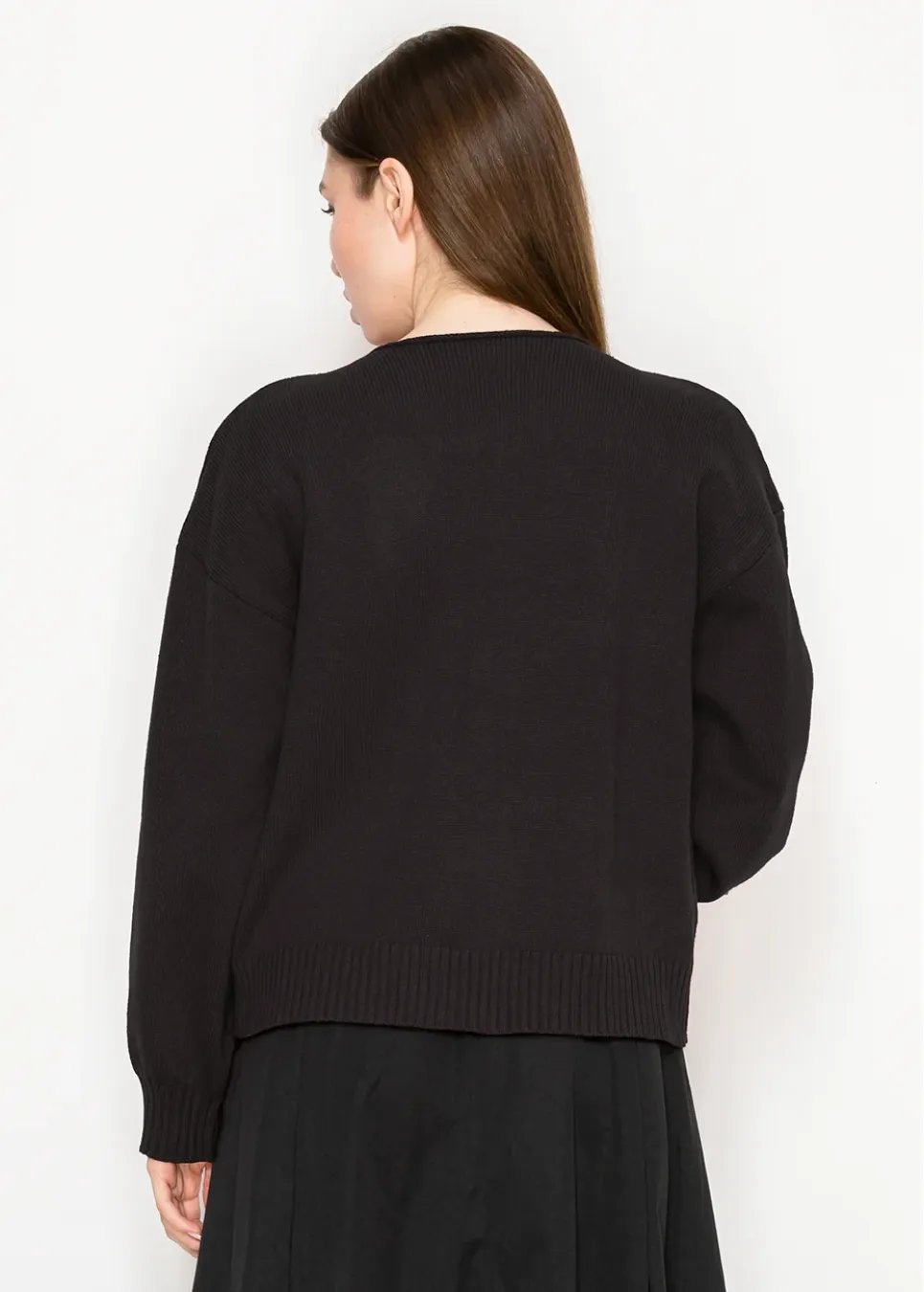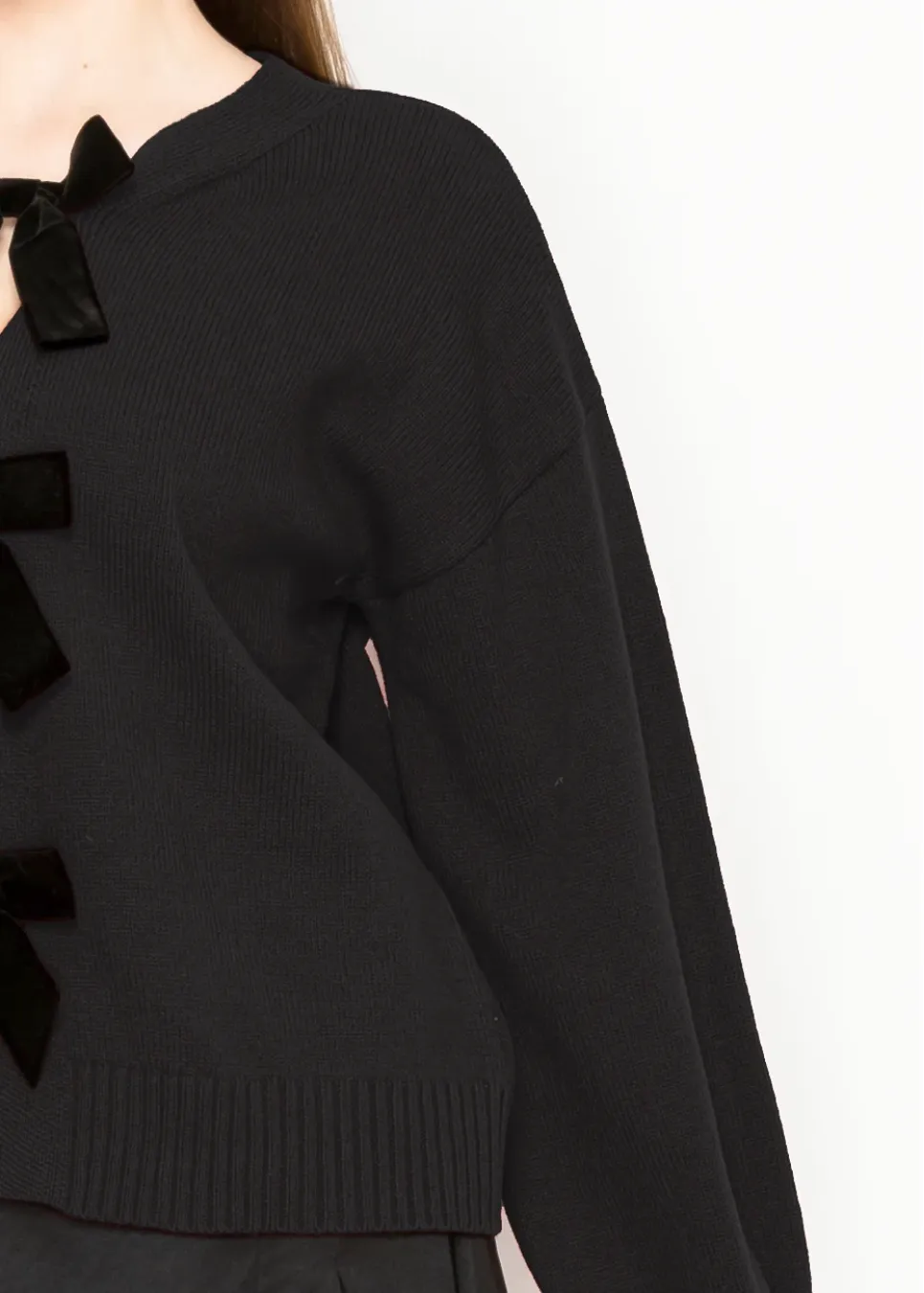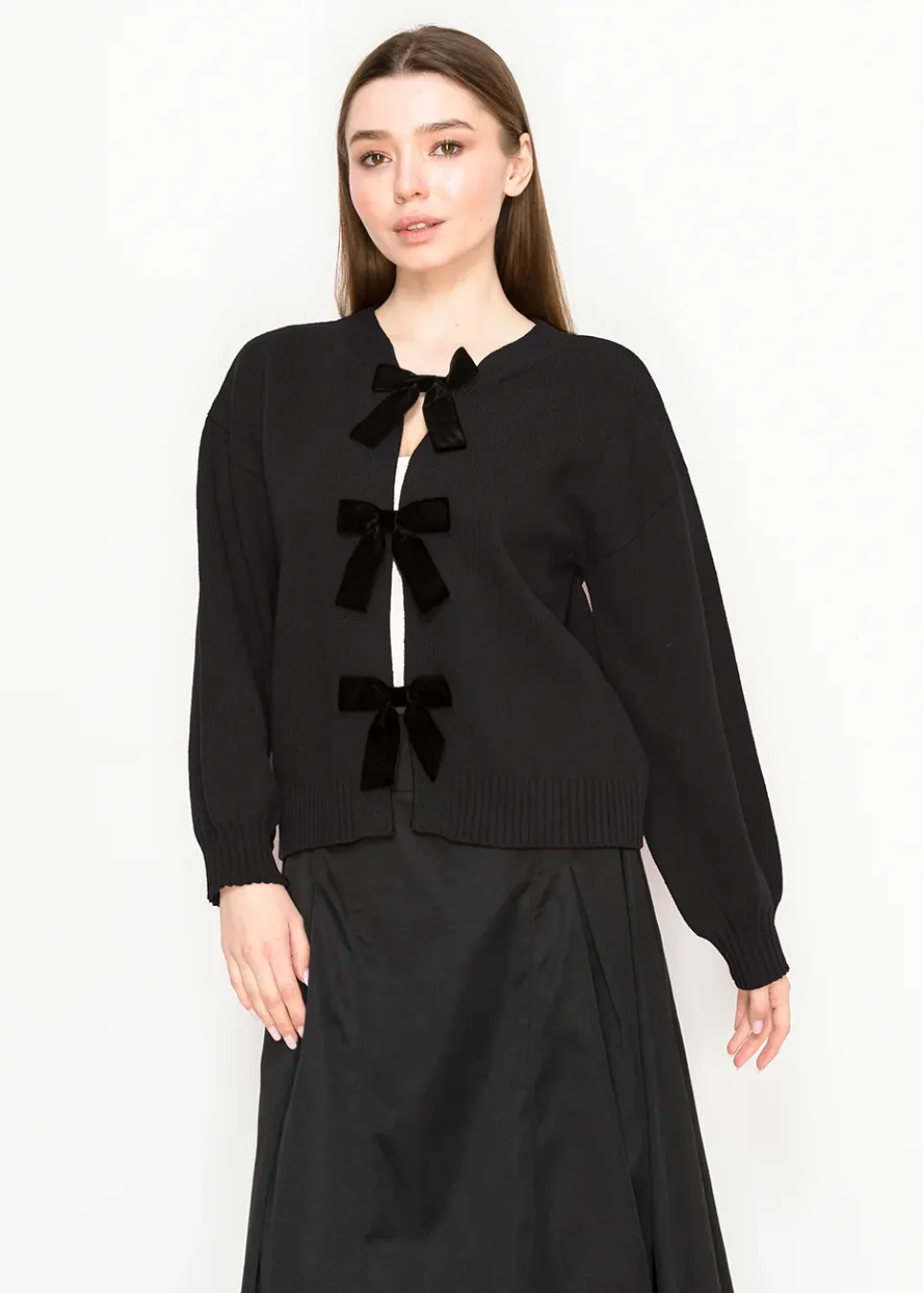 Sleek but playful, this cardigan brings unexpected charm with its bow-tie closures. The deep black tone keeps it refined for layering or wearing solo.
