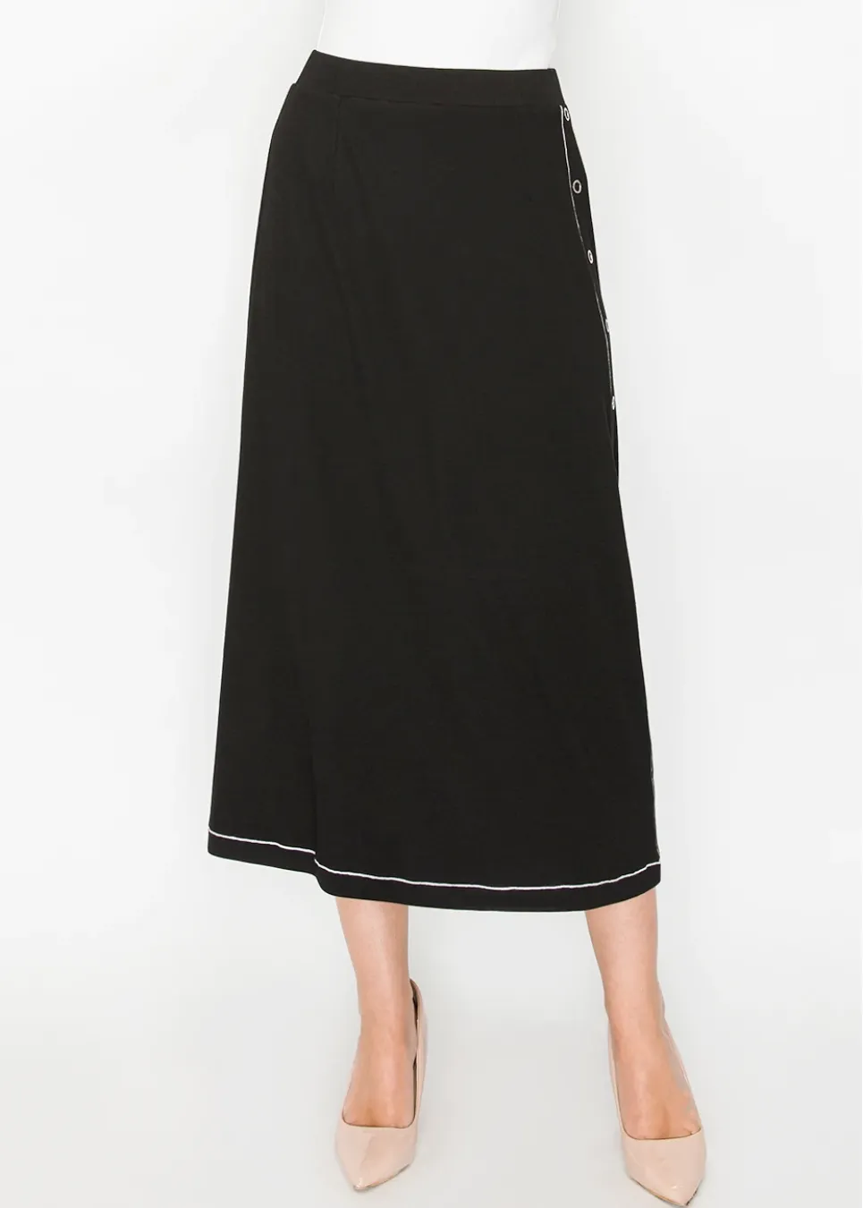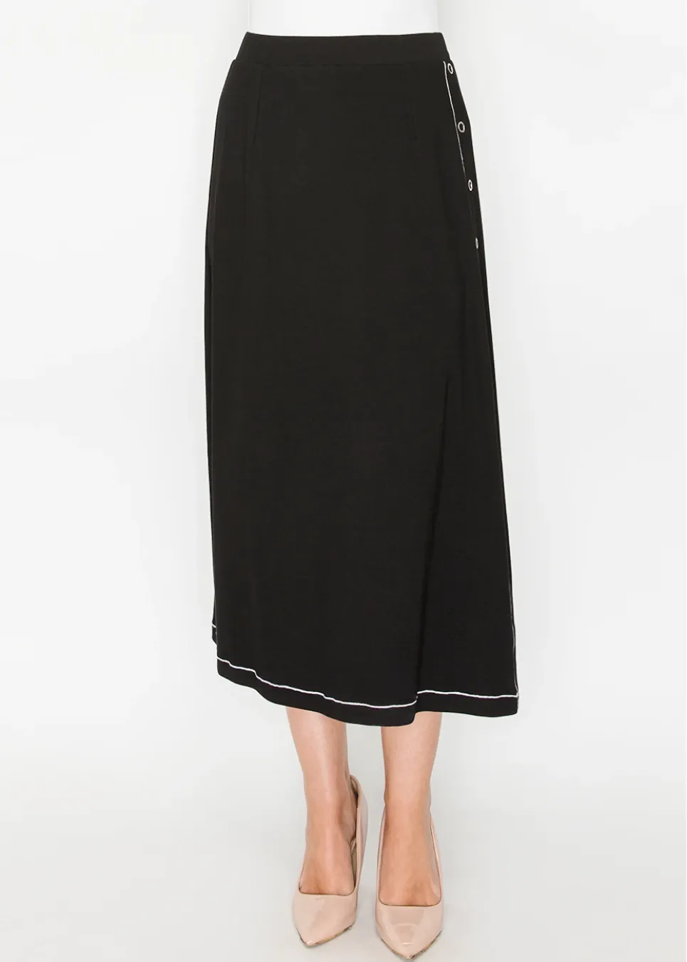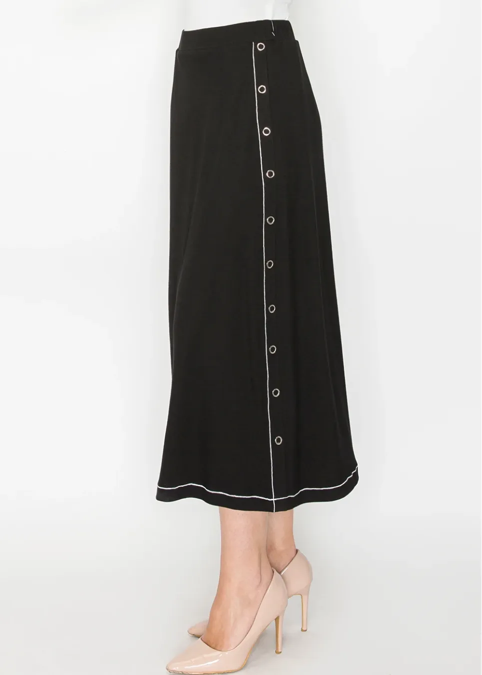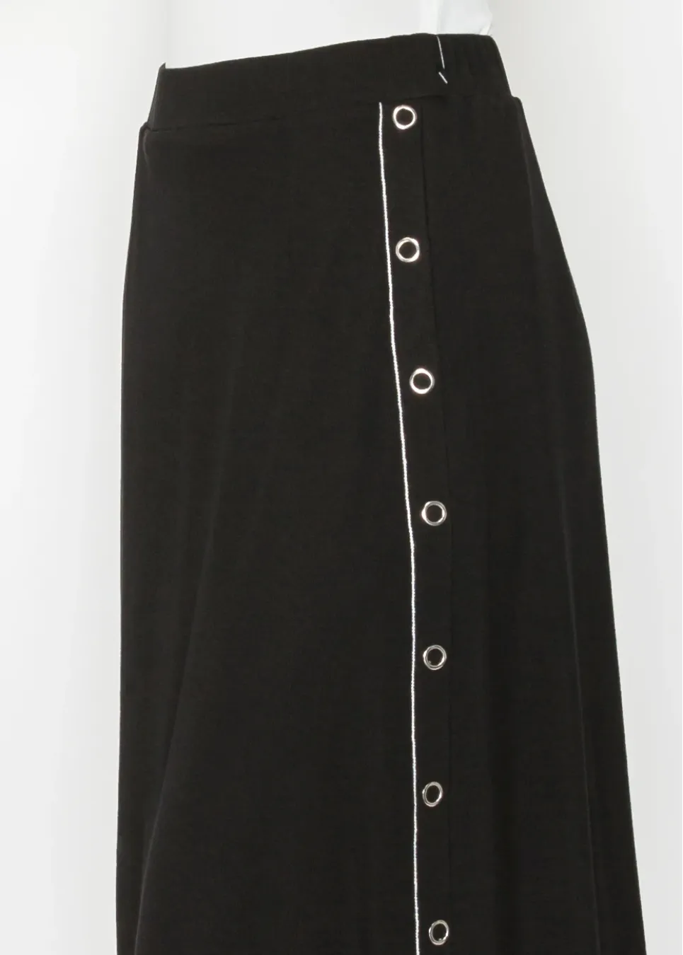 Minimalist with a twist. This black skirt features button-like eyelet details along the side for a hint of modern edge. The flattering A-line shape makes it a staple for any wardrobe.