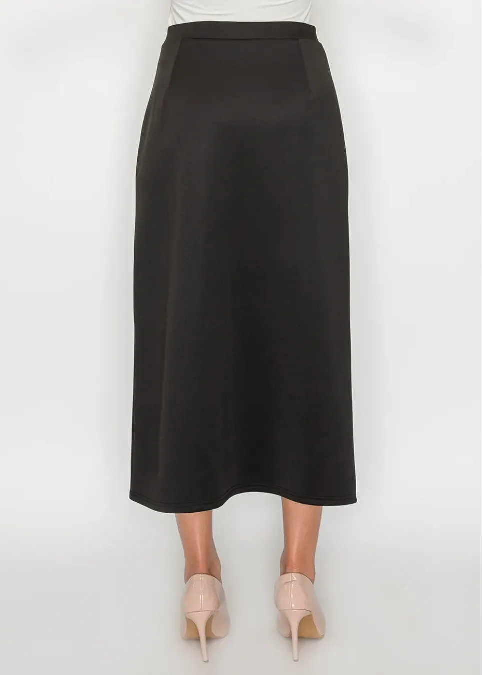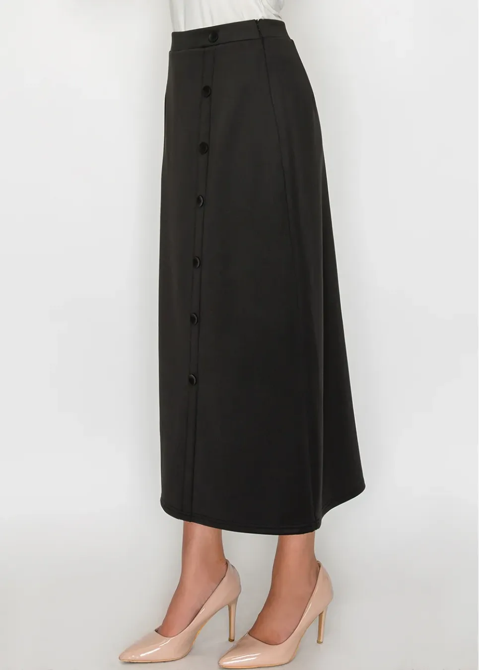 A sleek black midi skirt with a front button placket for a clean, elongating line. Easy to pair with blouses or knits for a polished look.