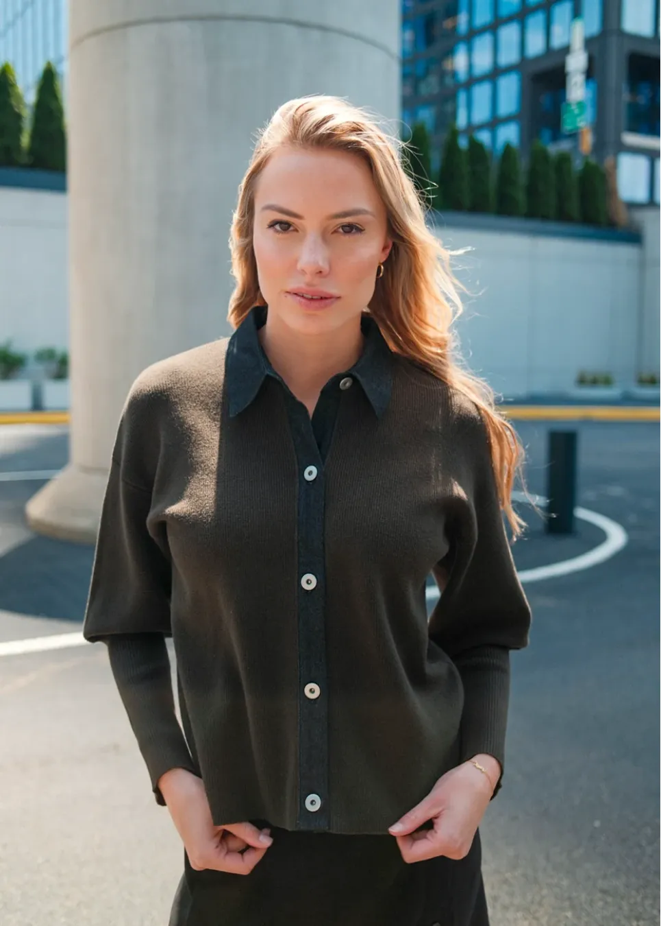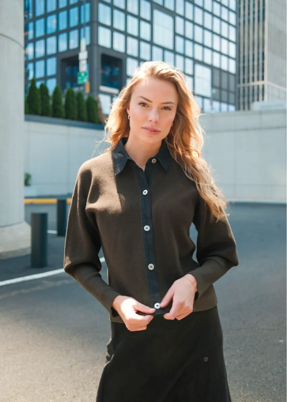 A cardigan with contrast buttons and a flowy skirt - it’s that perfect “grab-and-go” look you’ll keep coming back to. Easy, comfortable, and city-ready.