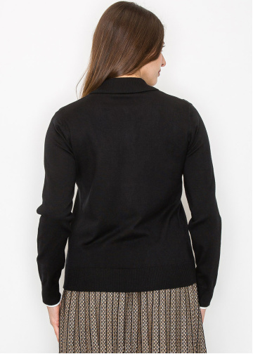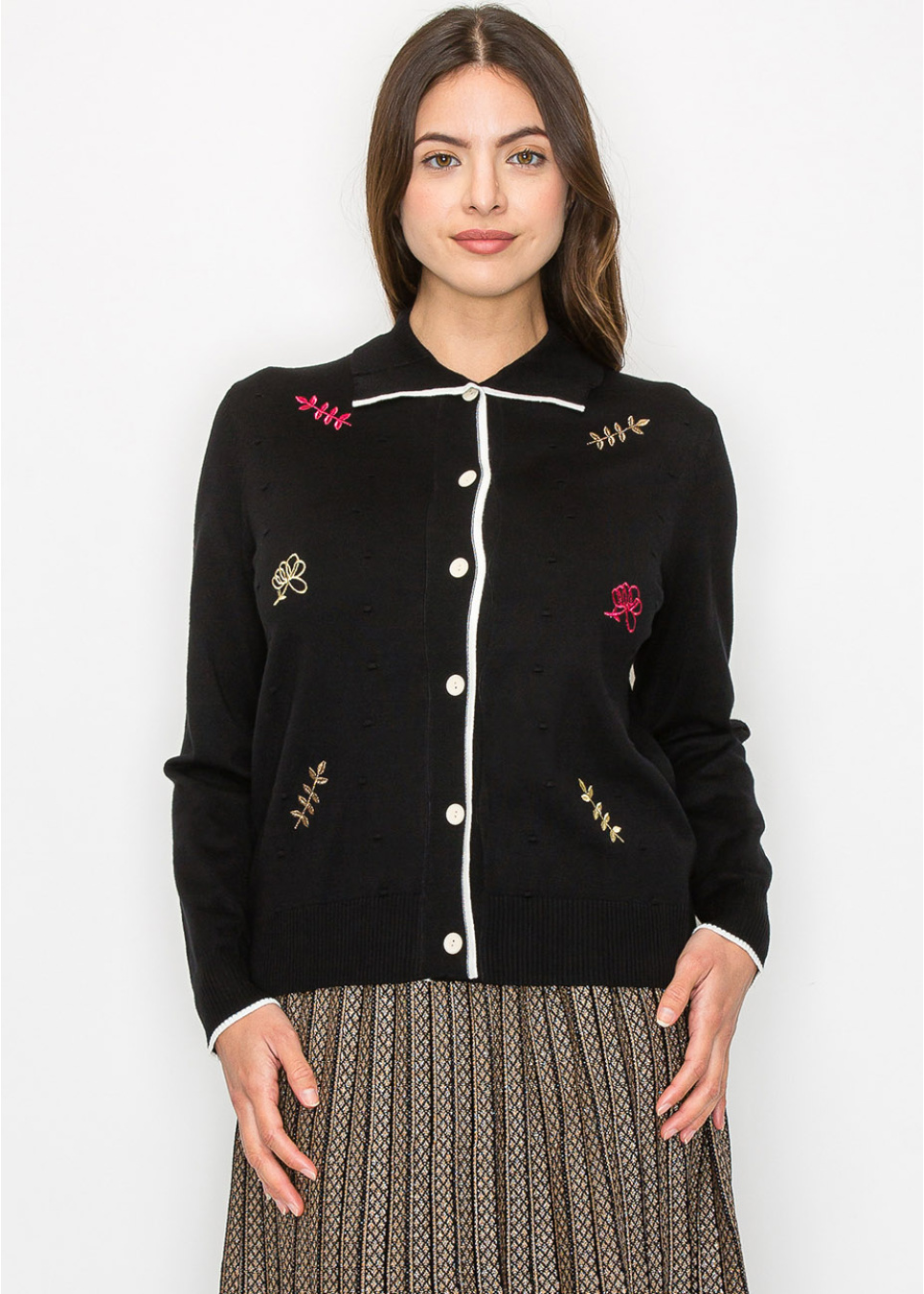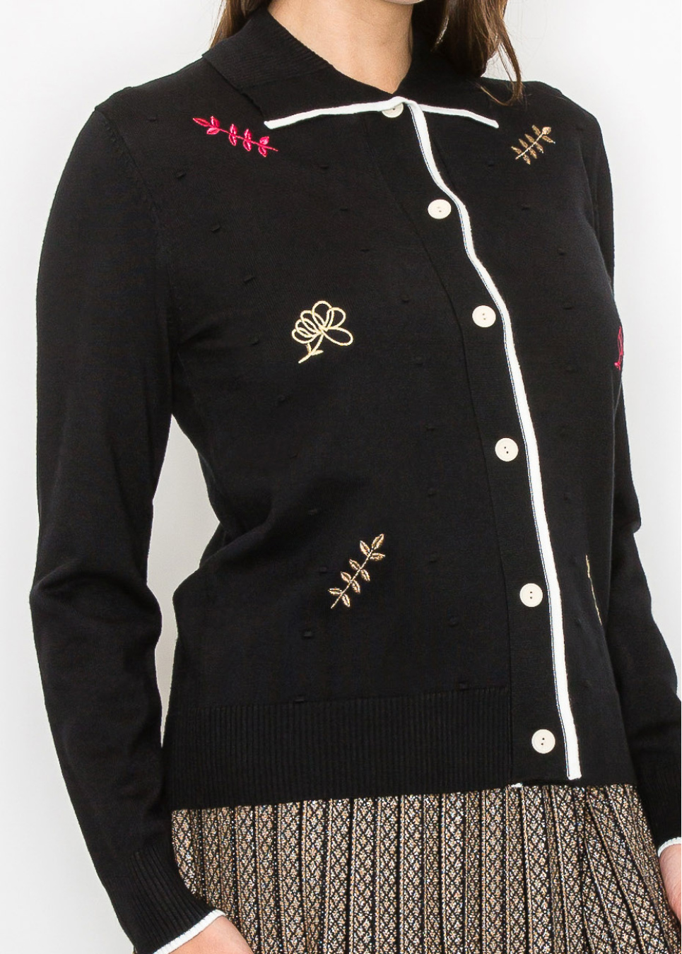 Soft floral embroidery scattered across this black cardigan creates a unique look that’s both playful and elegant. The white piping detail around the collar and down the front adds a crisp contrast, while the buttons give it a classic feel. It’s an ideal layering piece for when you want a hint of fun in your outfit.