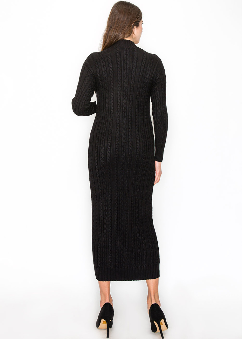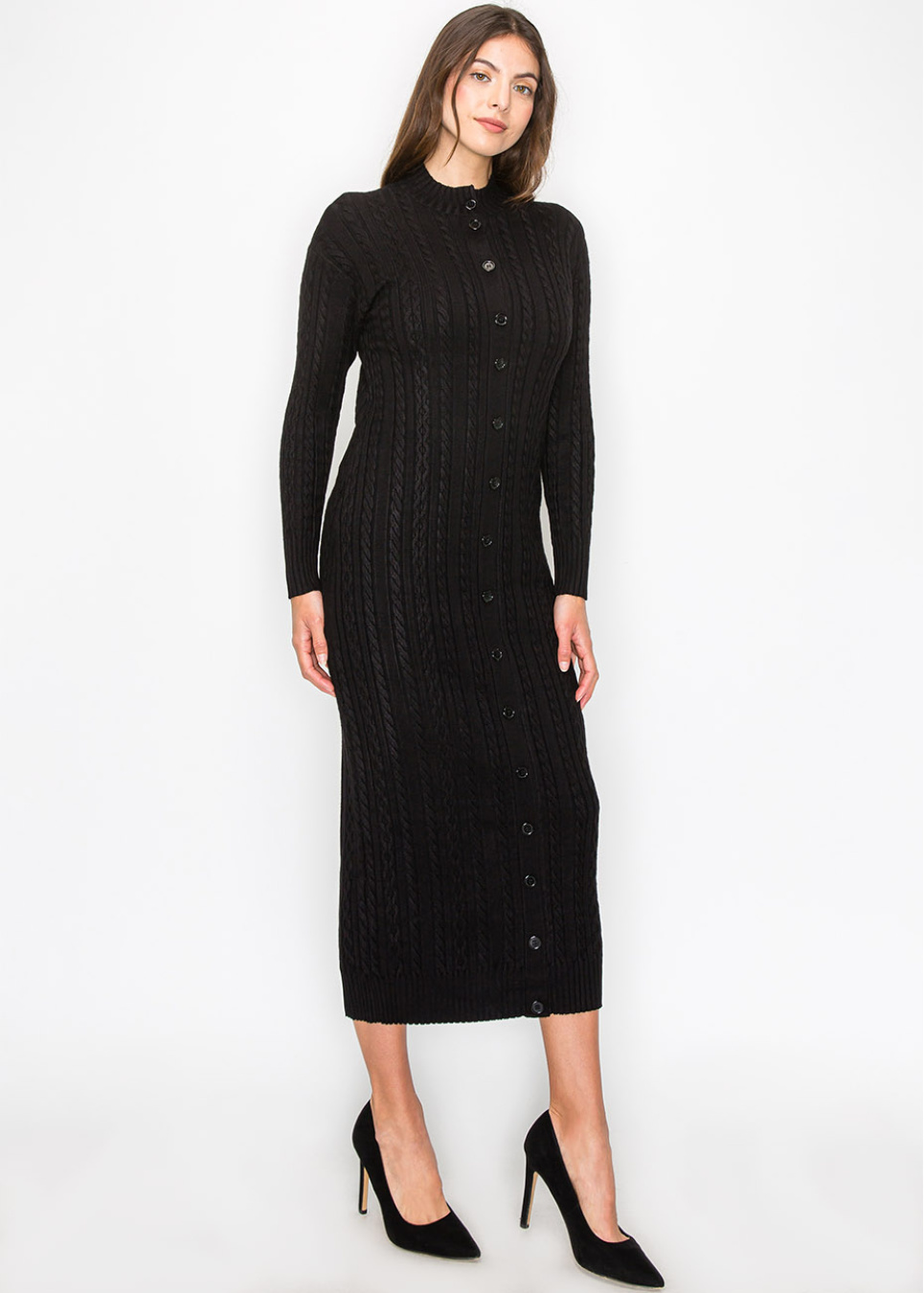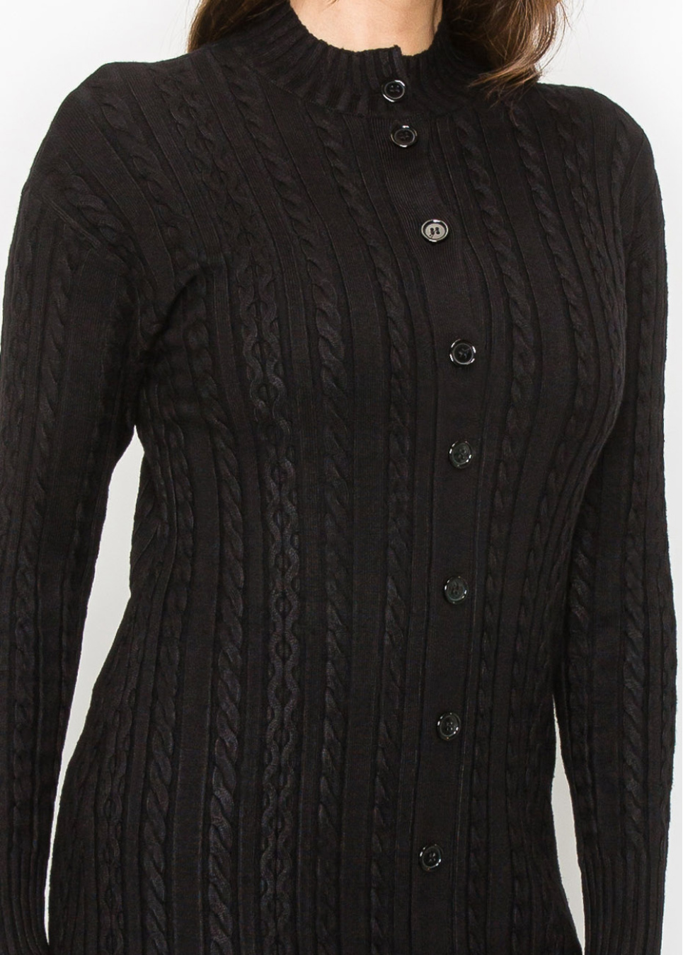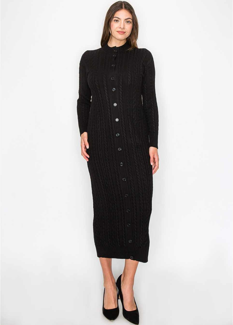 Step into timeless elegance with this classic black cable knit dress. The intricate texture and sleek buttons create a polished look, while the longline silhouette offers comfort and modesty. Perfect for any occasion where you want to feel both stylish and cozy.