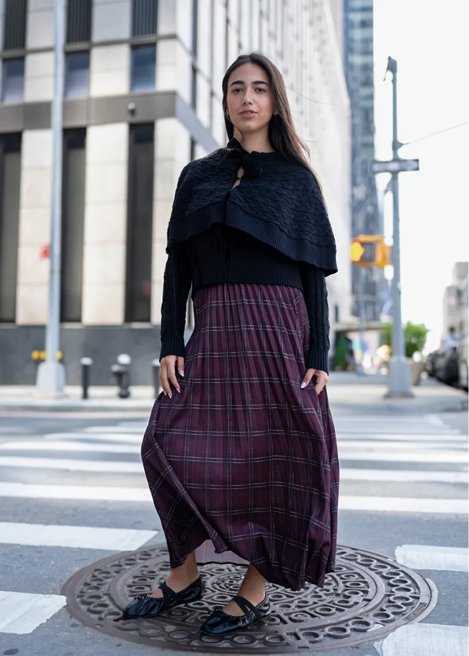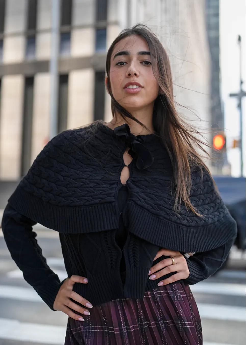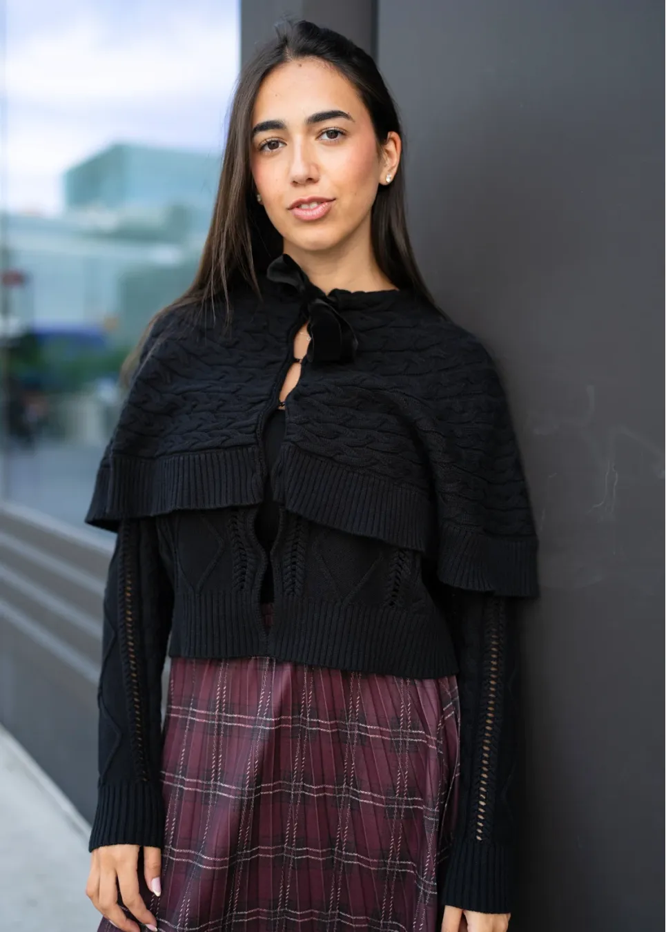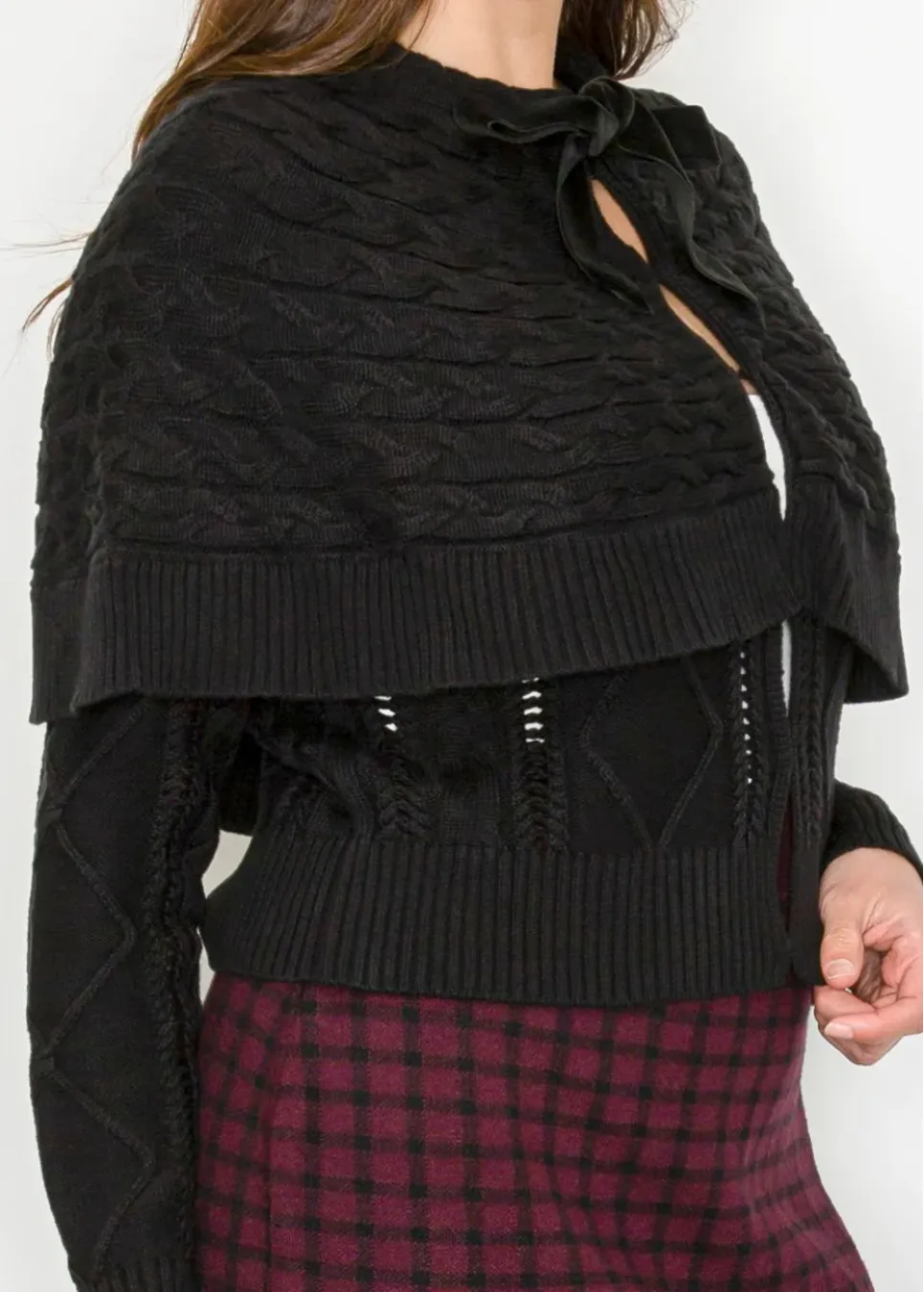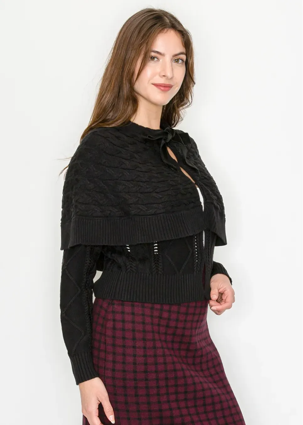 A unique layered look. This black cable knit sweater features an attached cape overlay and velvet bow tie for an elegant, vintage-inspired touch.