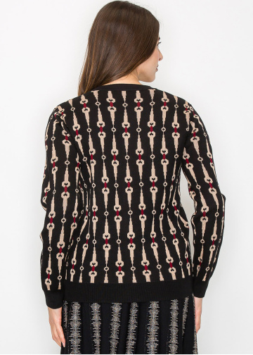 This black knit cardigan stands out with its beige and red geometric pattern. The button-front design makes it easy to wear, while the soft knit fabric ensures all-day comfort. It’s a stylish choice for adding some interest to your modest wardrobe.