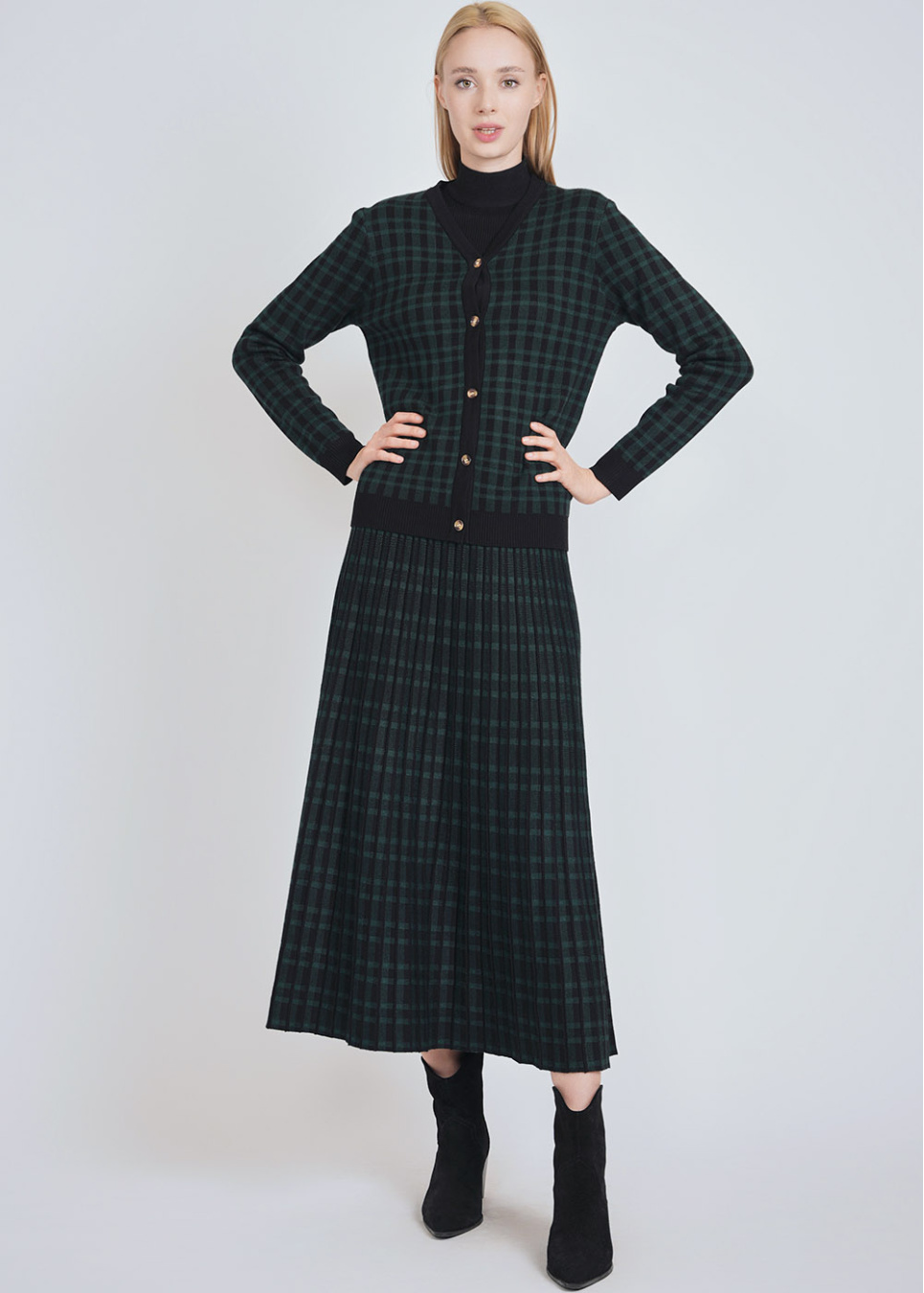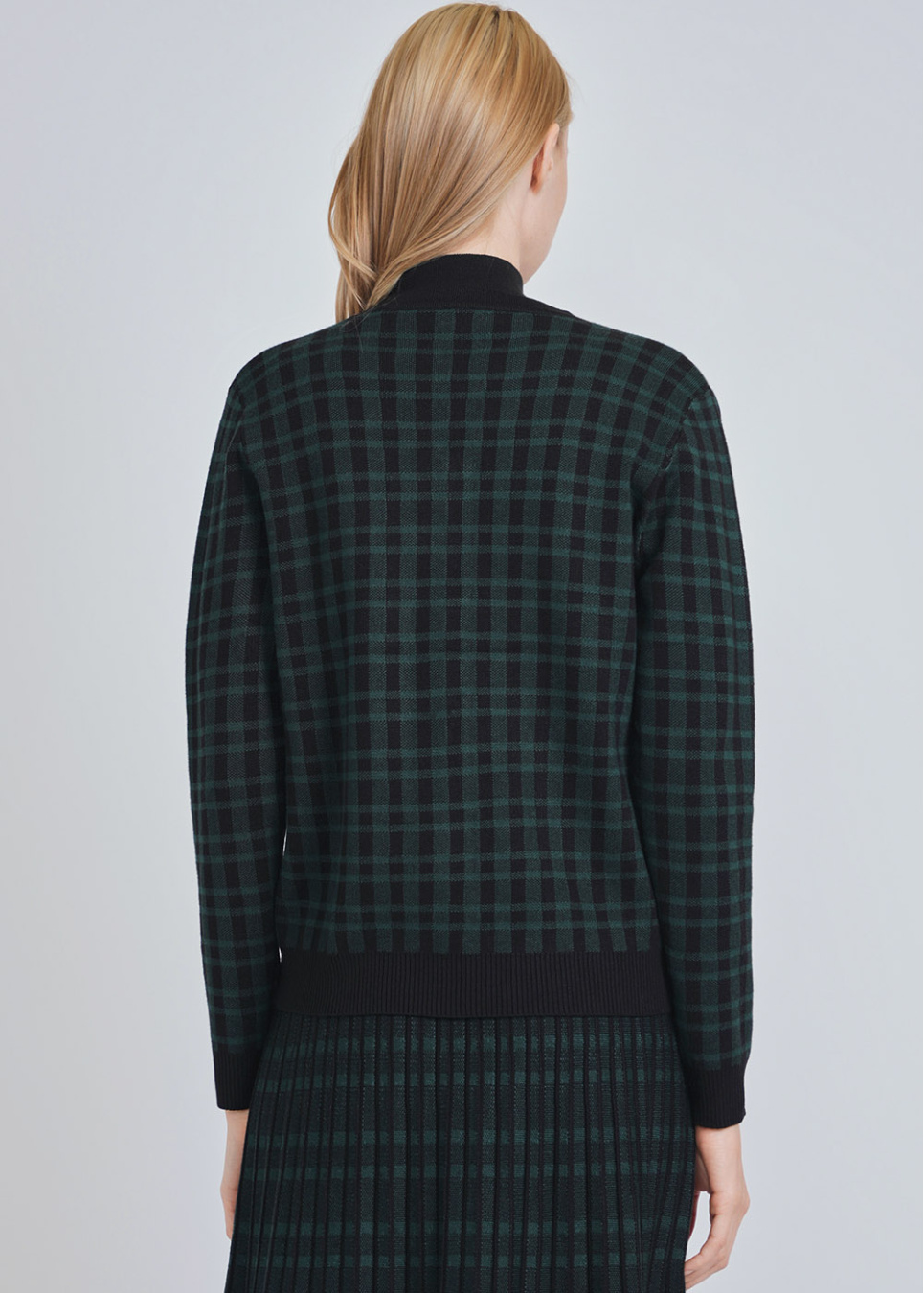 Black Cardigan with Green Plaid & V-Neck Detail