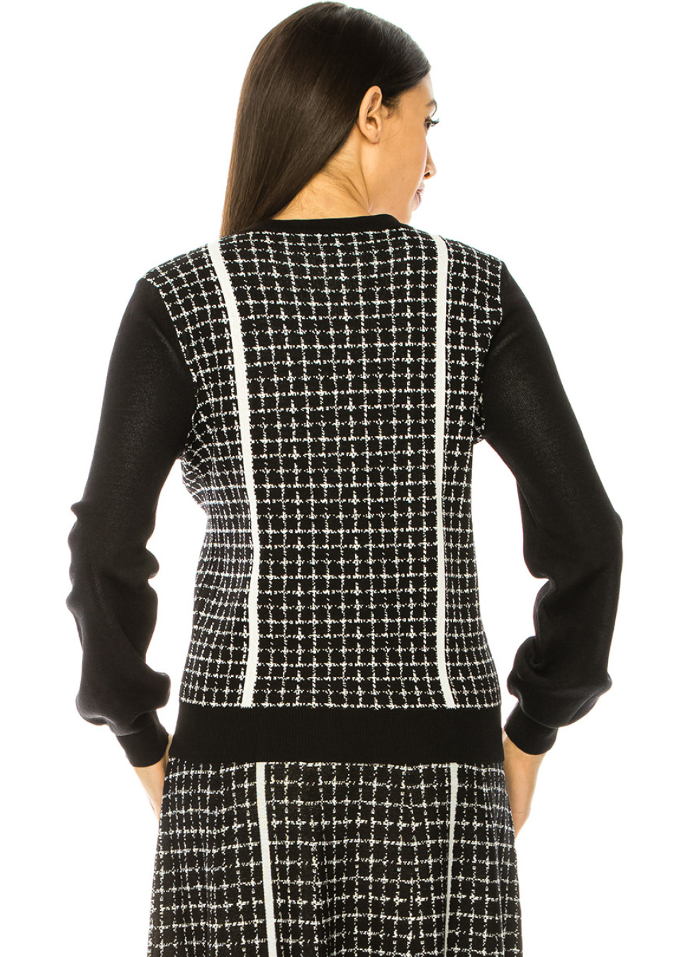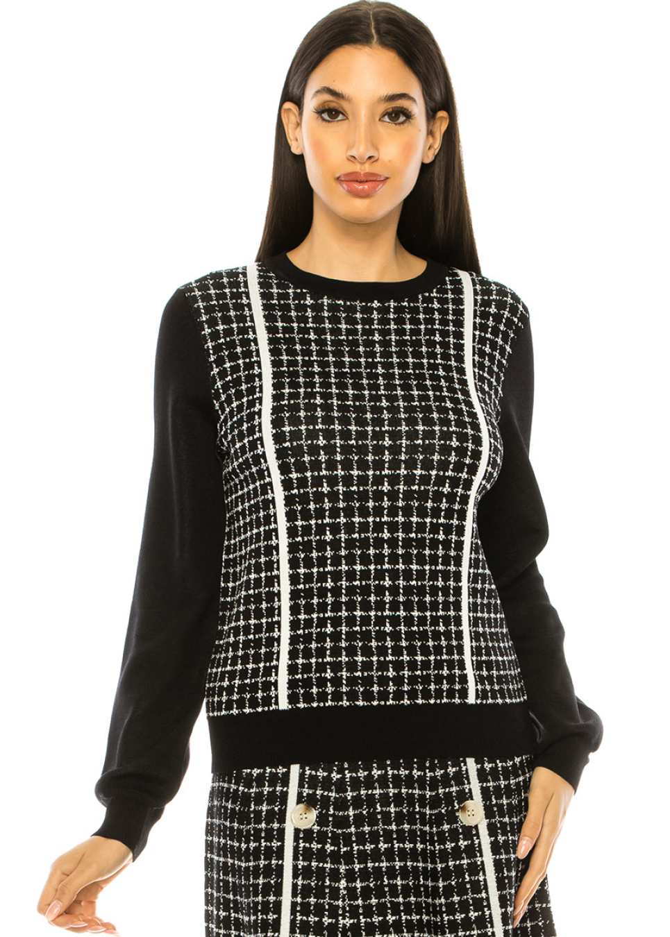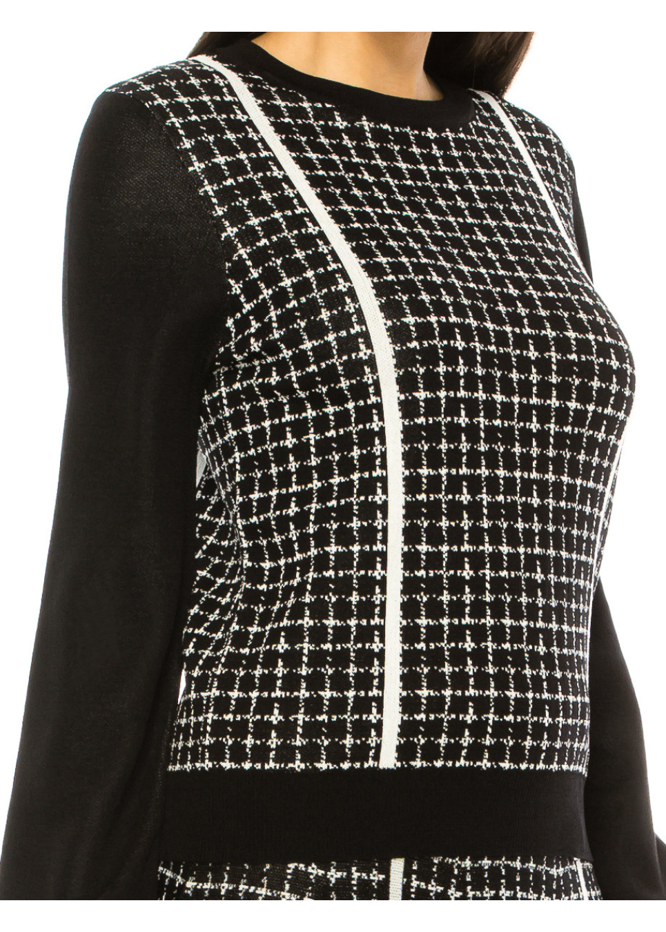 Make a bold statement with this stylish black sweater featuring a plaid print with two vertical white stripes. The high-quality fabric provides a cozy and comfortable feel, while the relaxed fit makes it perfect for layering. This versatile outfit comes with a matching skirt, making it ideal for any occasion. Whether you're running errands, attending a meeting, or meeting up with friends, you can stay effortlessly chic and comfortable all day long.