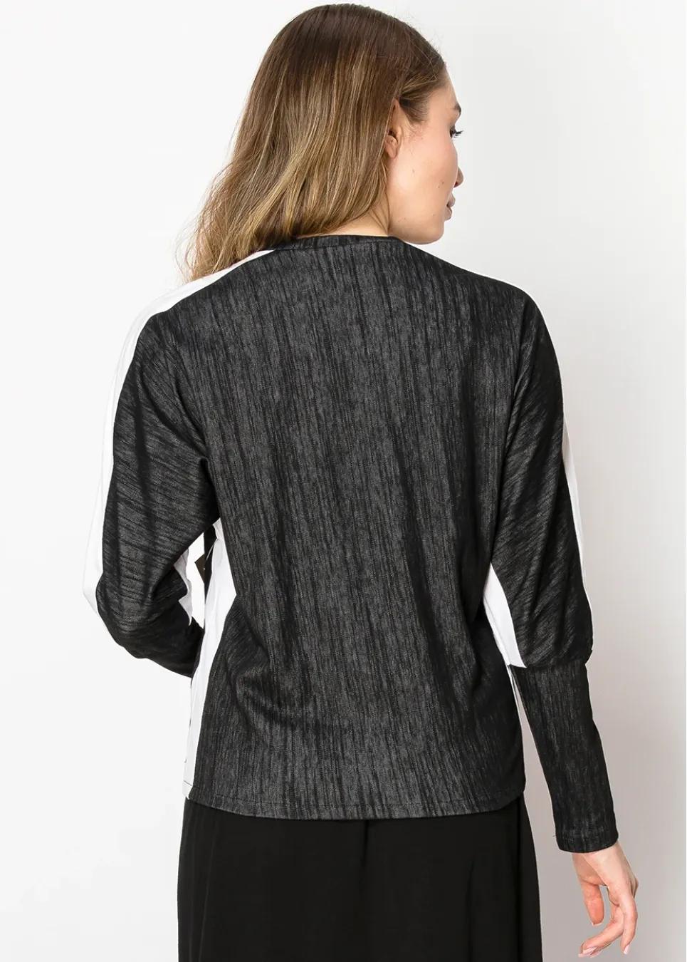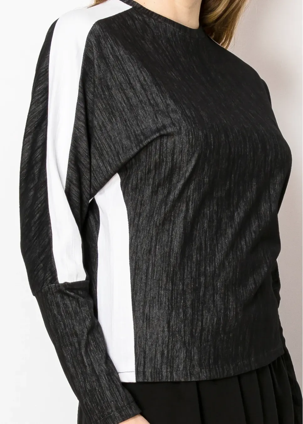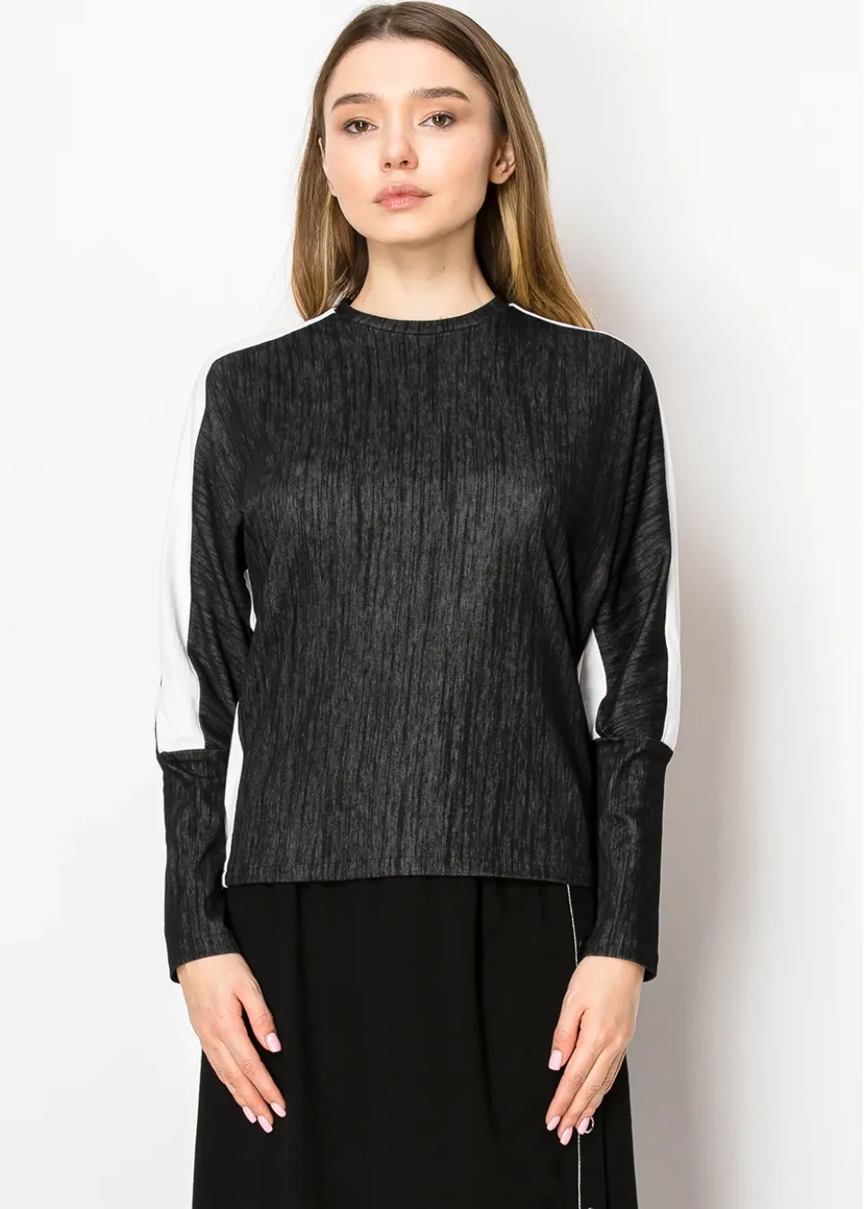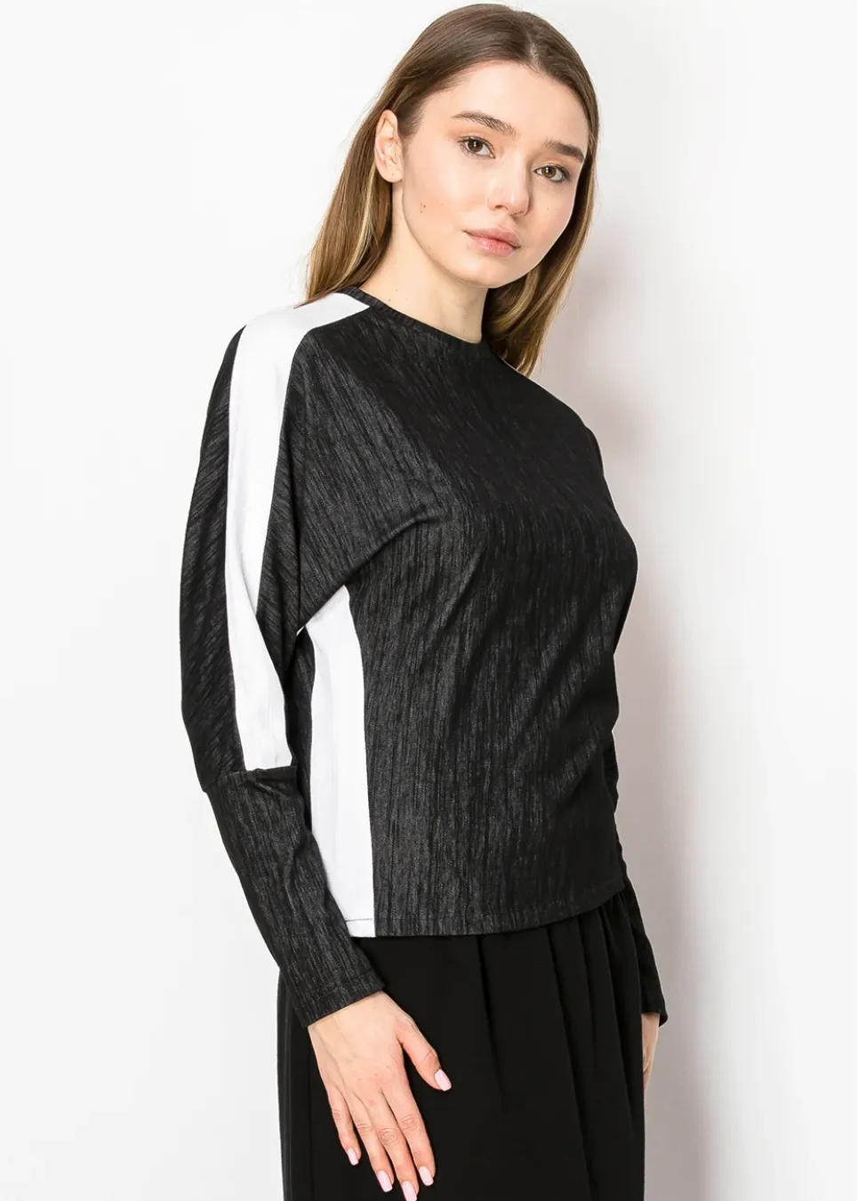 A fresh take on a wardrobe essential, this black long-sleeve tee stands out with its bold white trim along the arms. The relaxed fit and high neckline ensure it’s both comfortable and versatile, perfect for creating monochrome or contrast-based outfits.