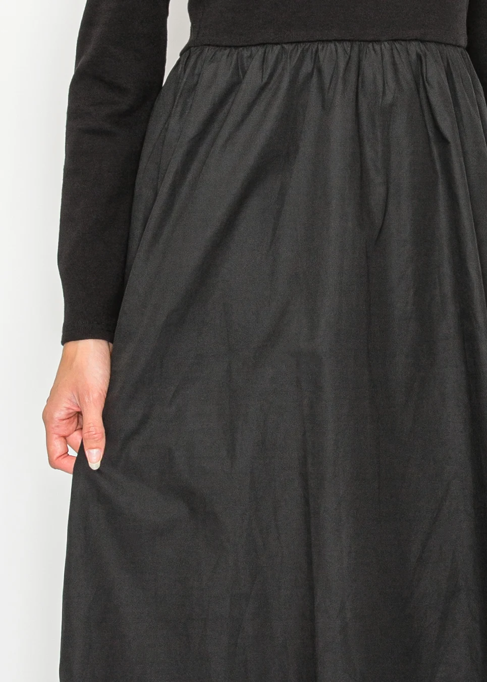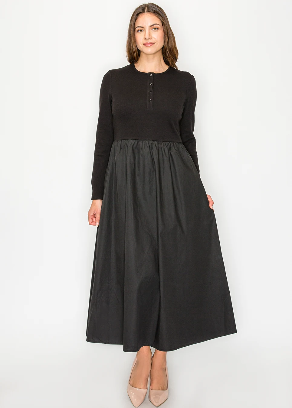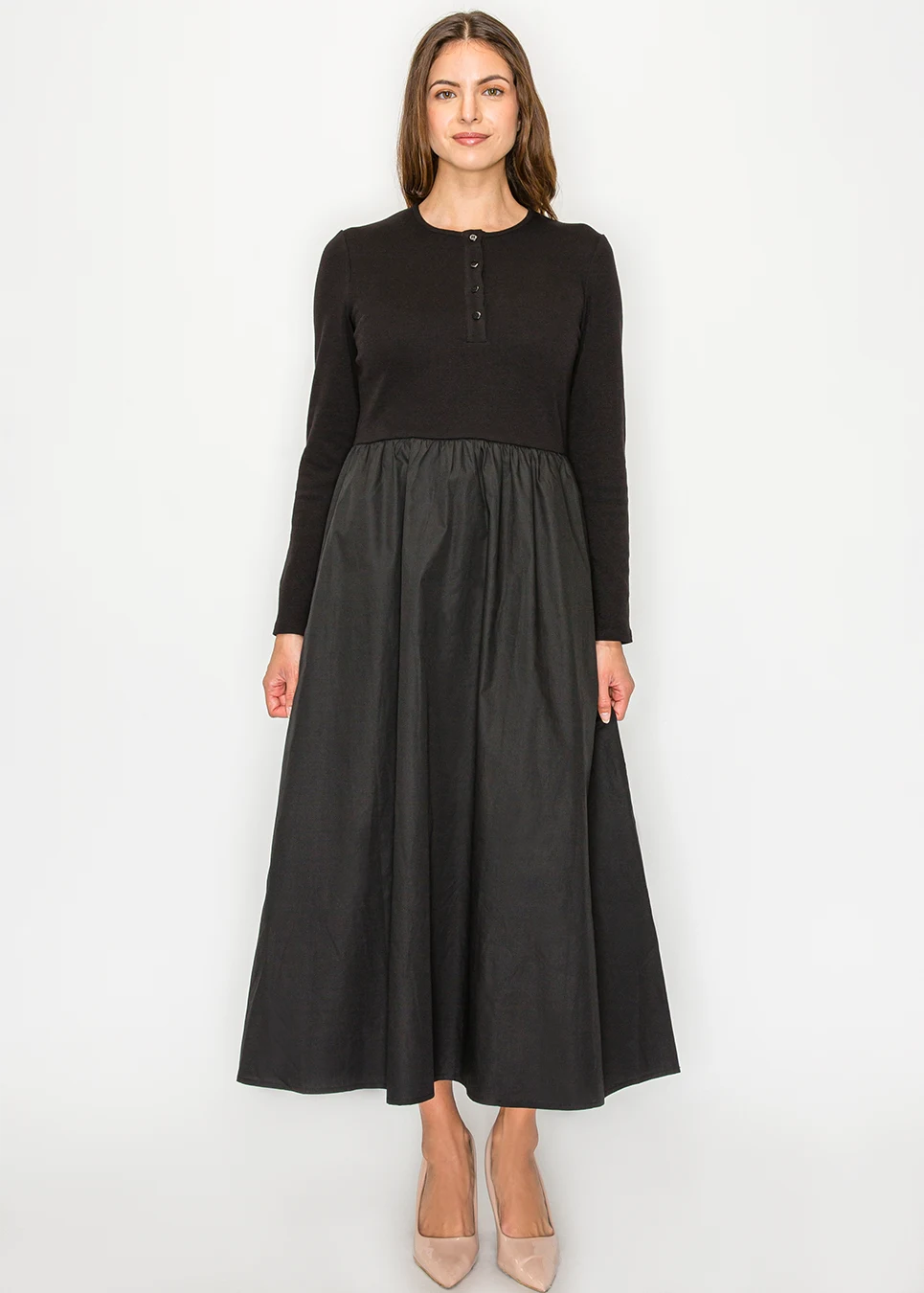 A clean henley neckline meets a voluminous skirt for a balanced, flattering shape. It feels effortless, but thoughtfully designed.