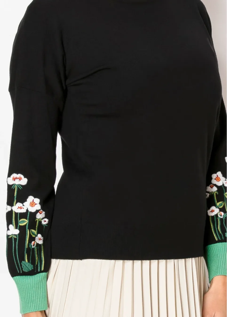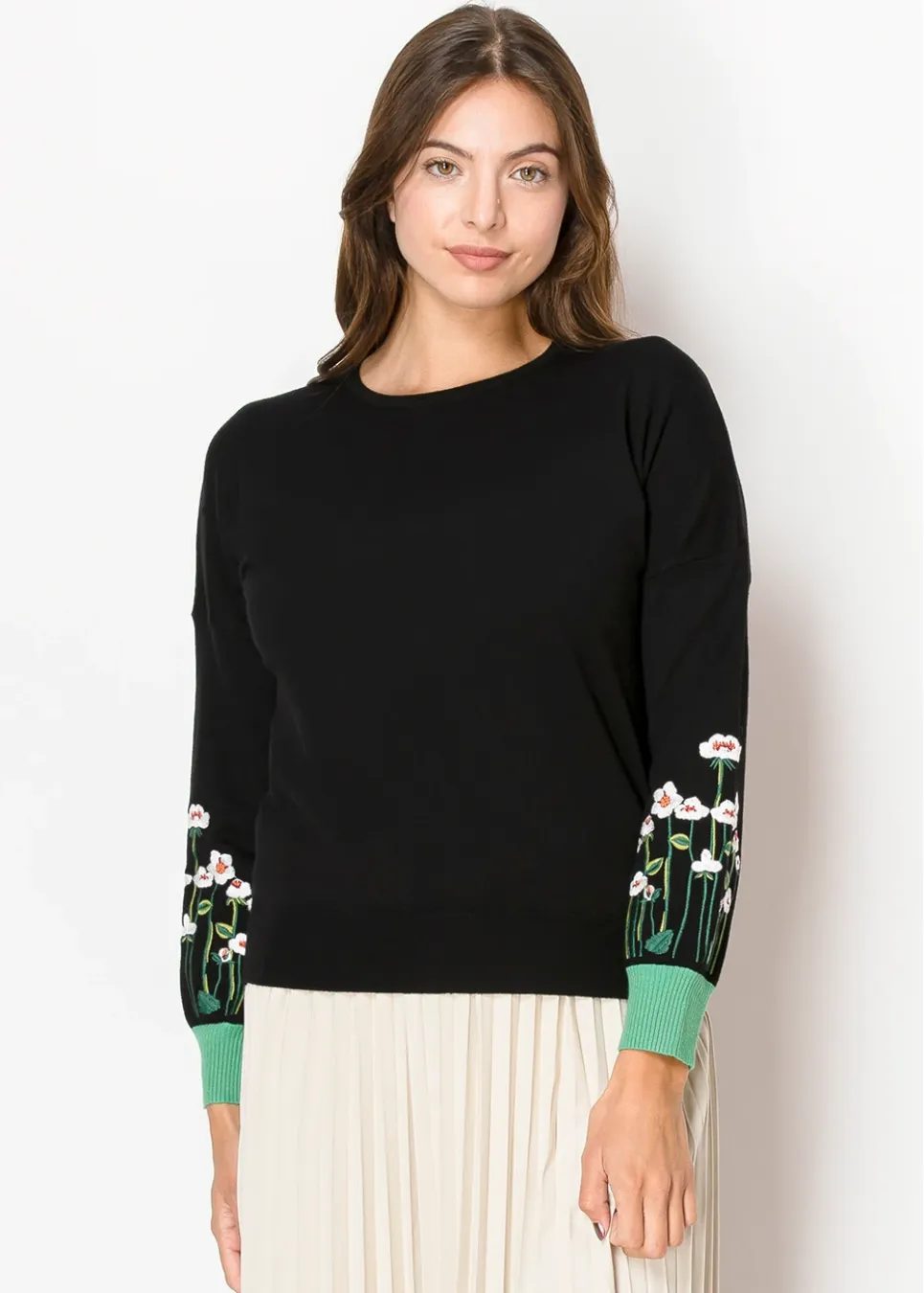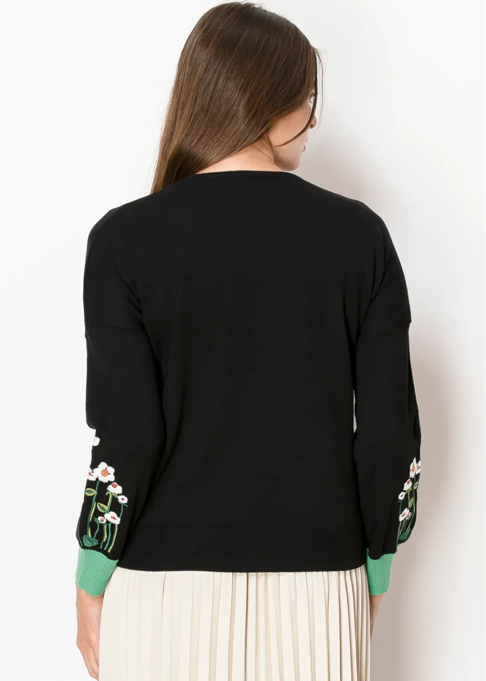 A cozy black sweater with a surprise—delicate white and green floral embroidery trailing up the sleeves. It’s understated but special, with a relaxed fit that keeps you comfortable all day. The ribbed cuffs add a fun contrast, making this piece feel polished yet relaxed.