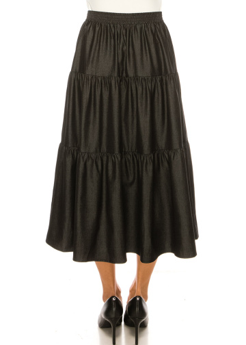 Don't miss out on the opportunity to elevate your style with this stylish and versatile skirt. The tiered design and button front create a fashionable and flattering silhouette, while the black denim color makes it a versatile and timeless piece. The midi length ensures appropriate coverage for any occasion, making it a practical addition to your wardrobe.