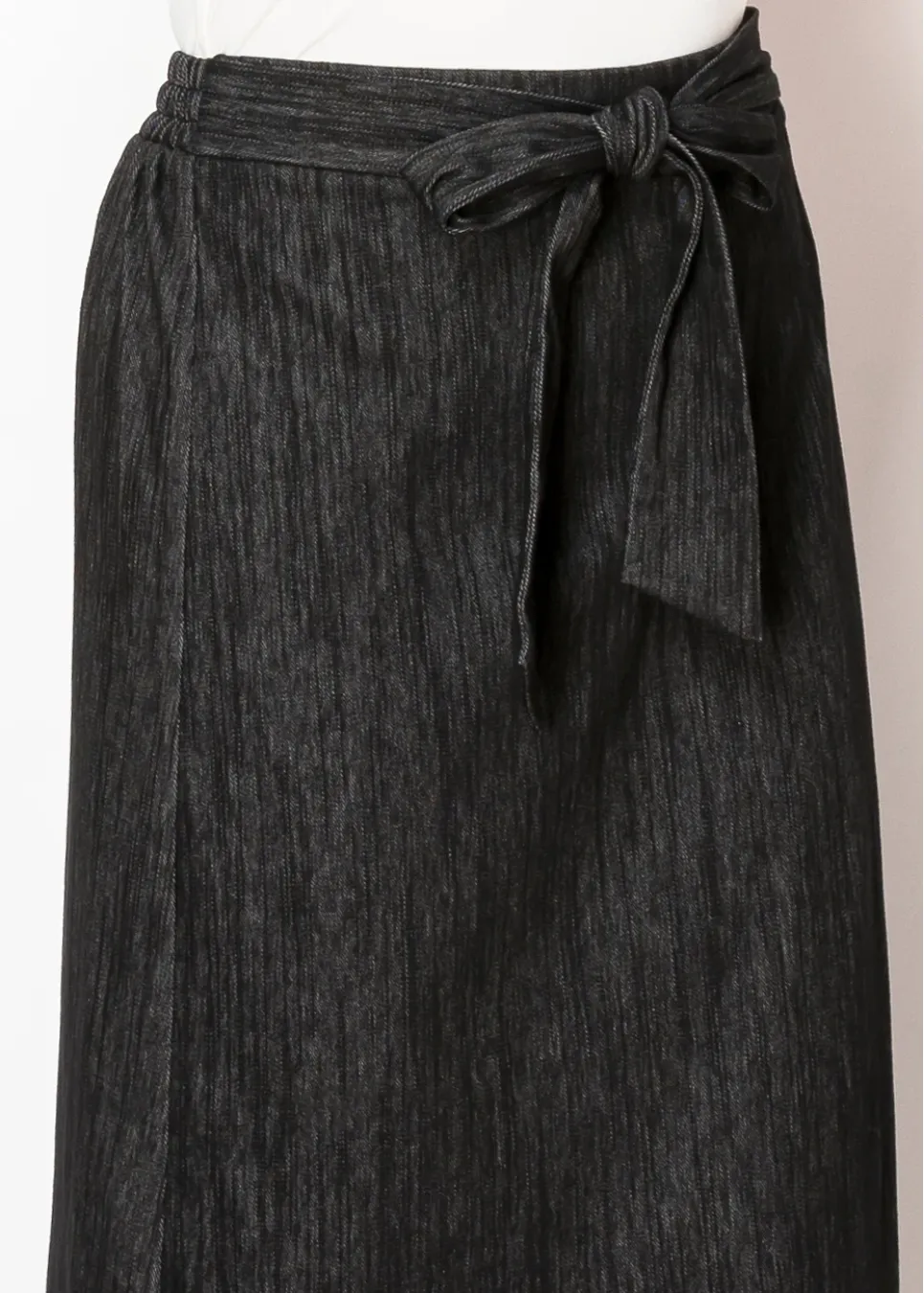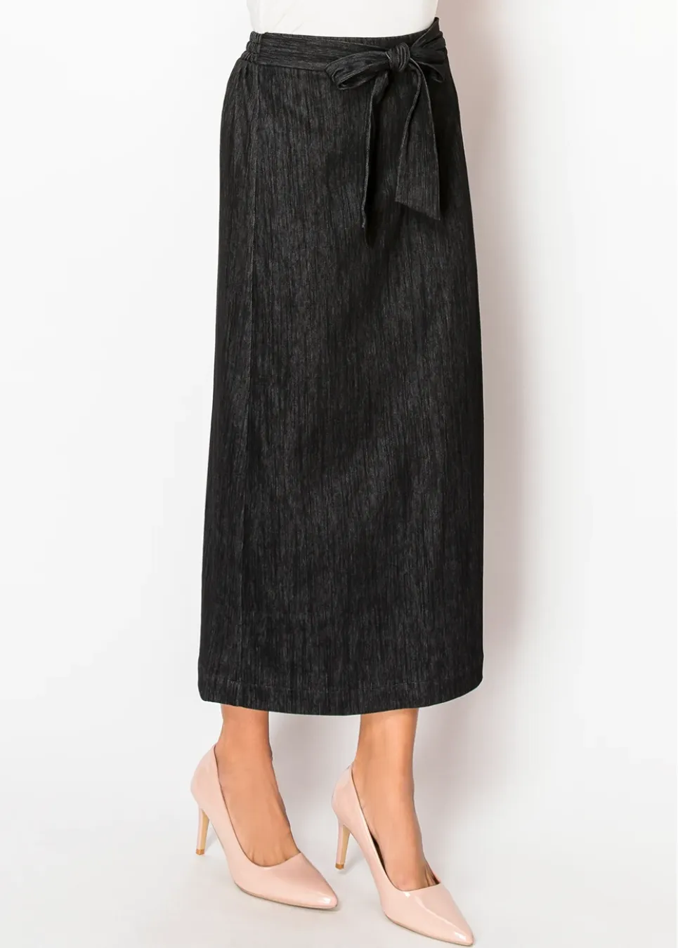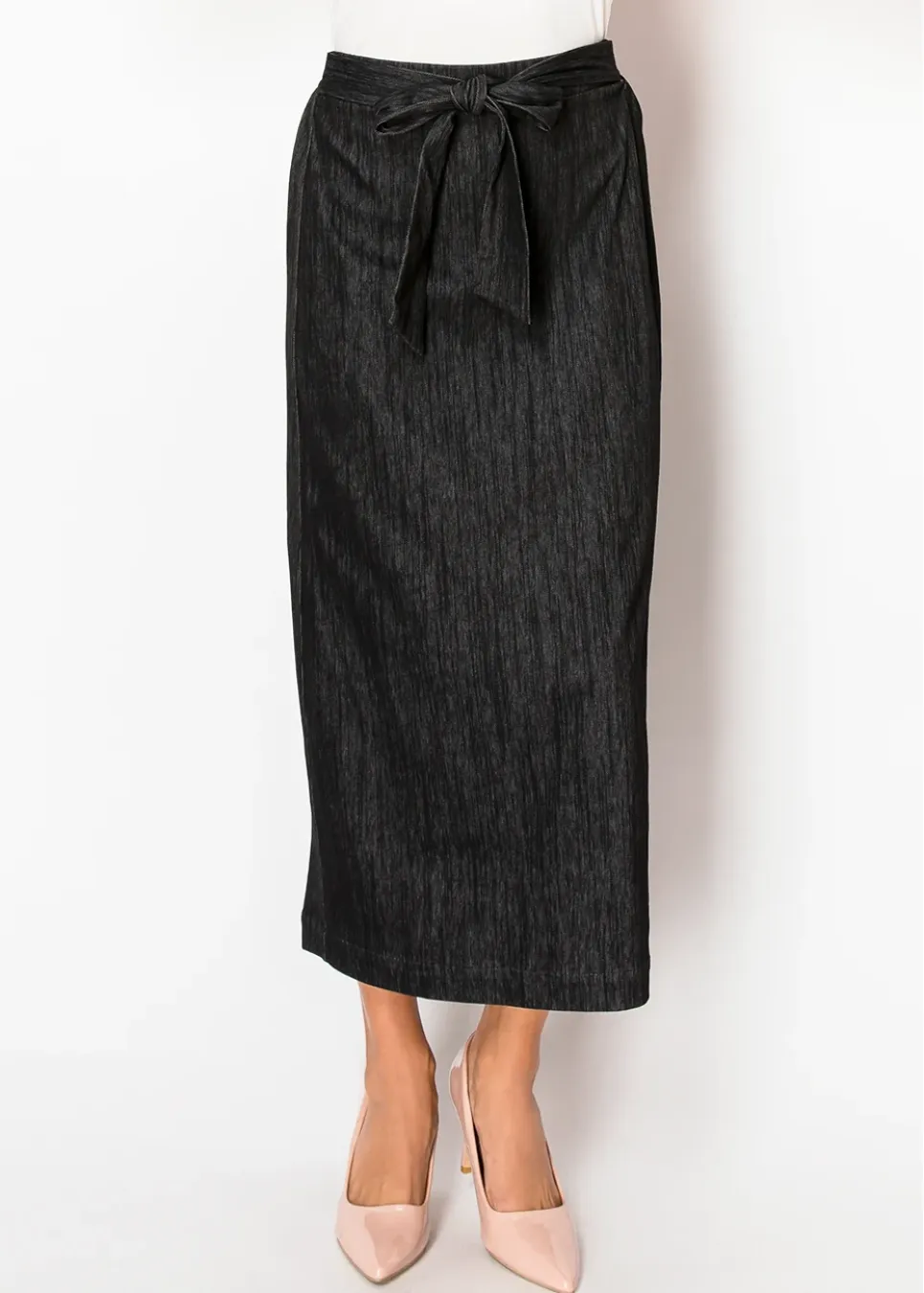 A classic with a twist. This black denim skirt has a wrap design with a soft tie at the waist, making it both flattering and adjustable. The subtle texture adds depth, while the midi length keeps it timeless and easy to style.