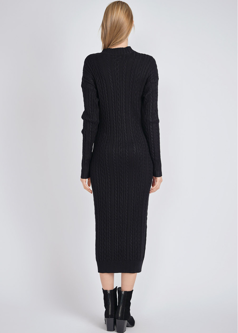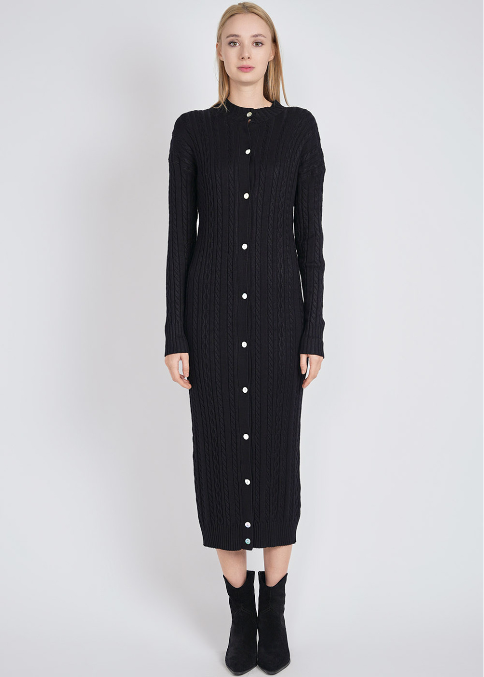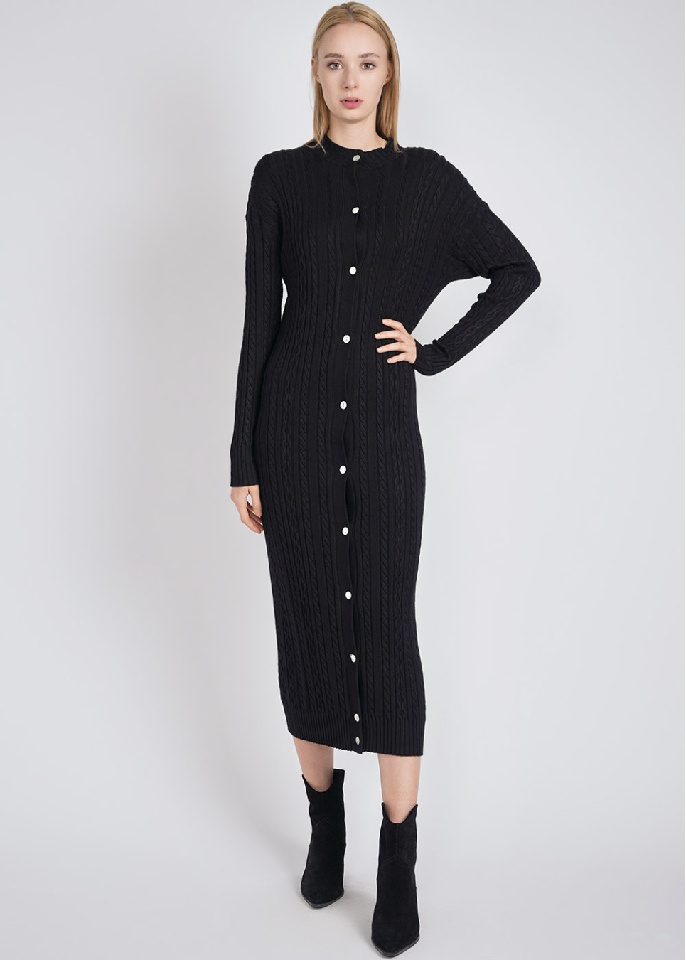 Black Dress Delight: Cable Knit Texture & Buttons