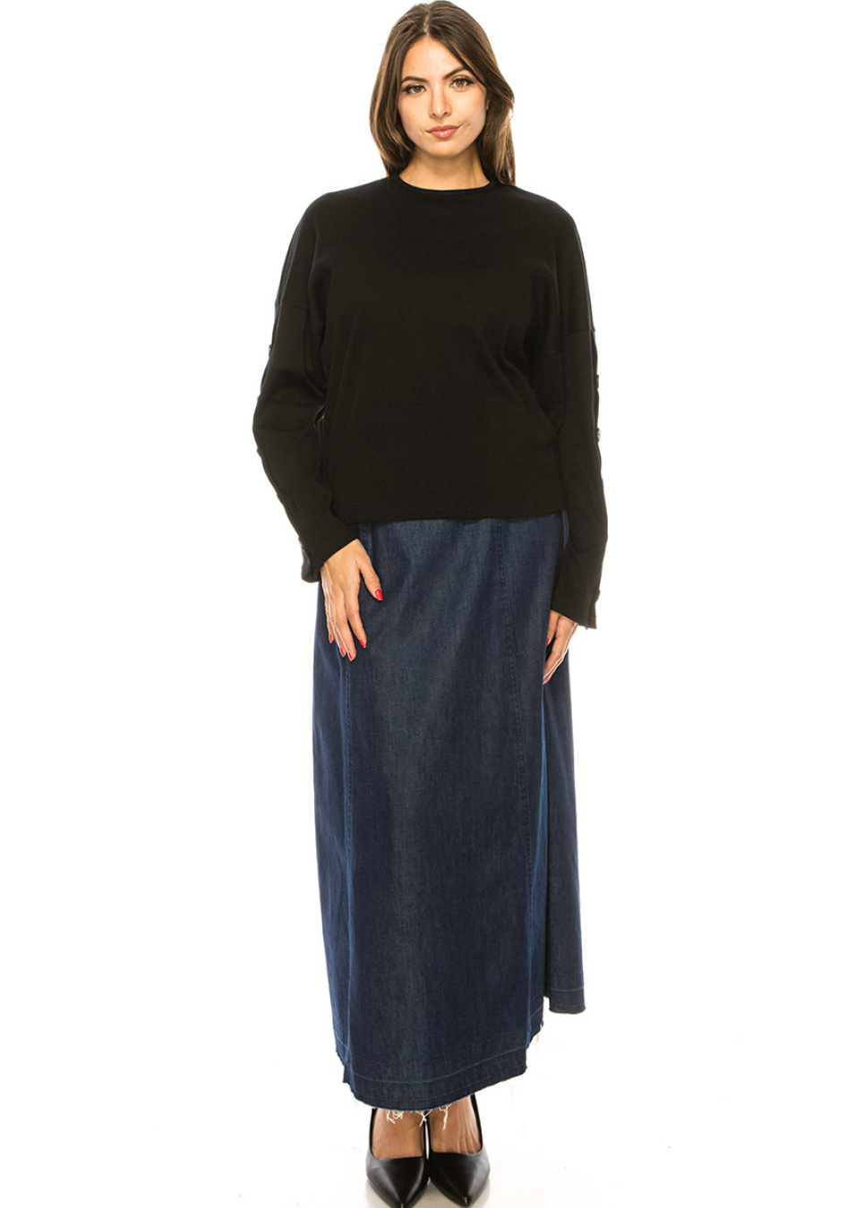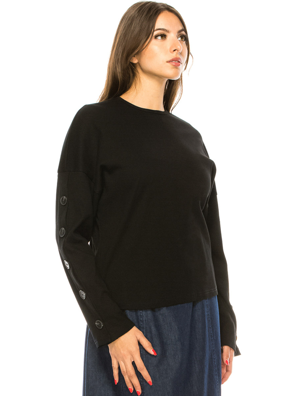 This modest long sleeve t-shirt is the perfect blend of comfort and style. Its dropped shoulder and decorative buttons on the sleeves create a unique and sophisticated look that's perfect for any modest fashionista.