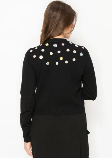 Simple, sweet, and just a little fun. This black knit cardigan is scattered with colorful embroidered flowers, giving it a light, feminine feel. A great layering piece when you want something classic with a twist.