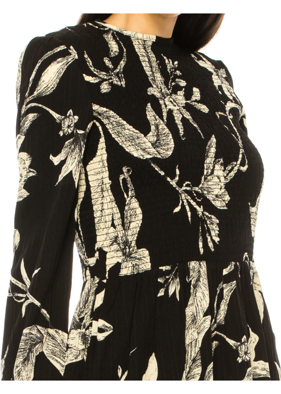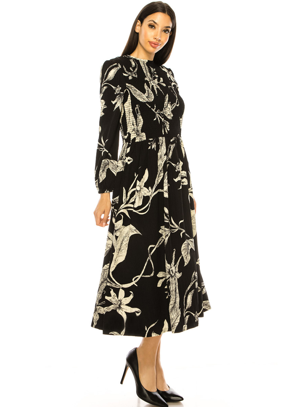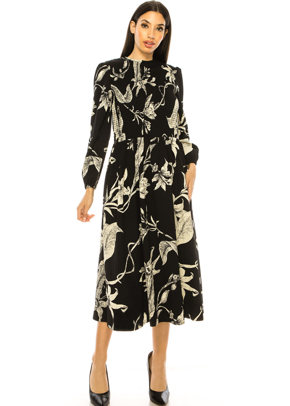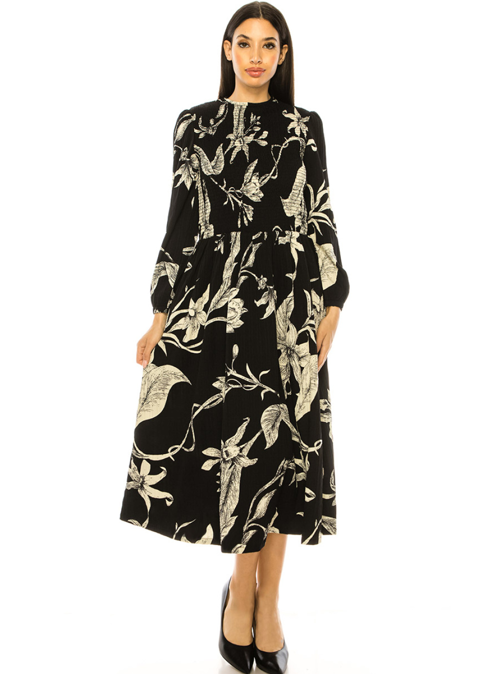 Bring some magic to your wardrobe with this enchanting black midi dress. The whimsical floral print is both charming and captivating, while the smocked bodice and A-line skirt provide a flattering fit. The crew neck and long sleeves create a modest yet alluring look that is perfect for any event.