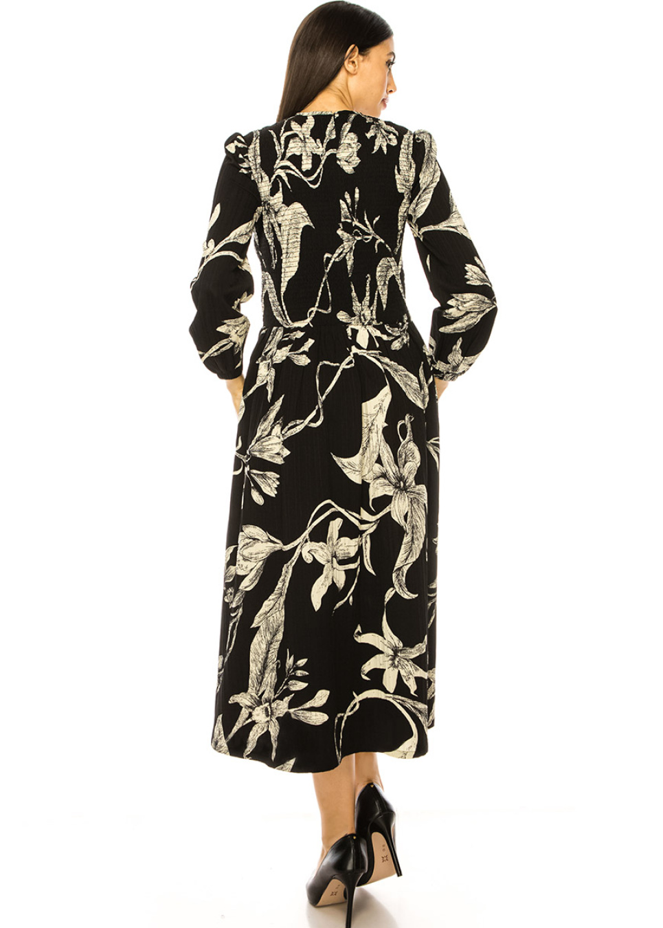 Black Floral Print Smocked Midi Dress