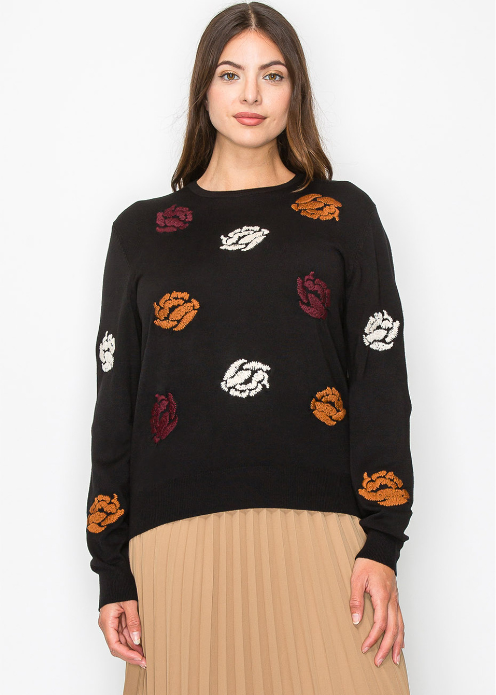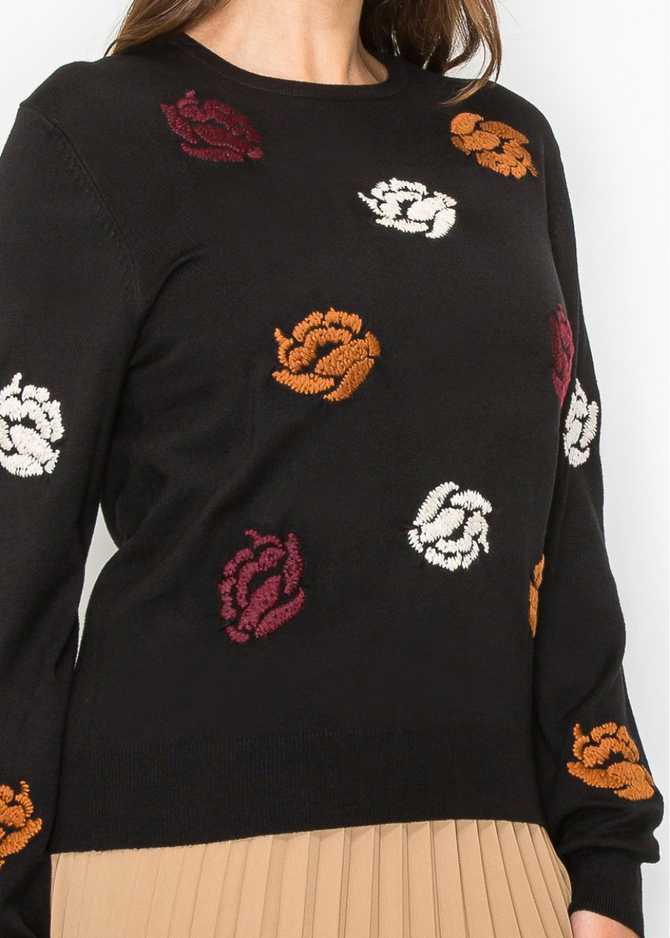 Bring the beauty of fall to your wardrobe with this black sweater, scattered with warm floral embroidery in shades of burgundy, cream, and rust. Perfect for adding a bit of color while staying modest and comfortable.