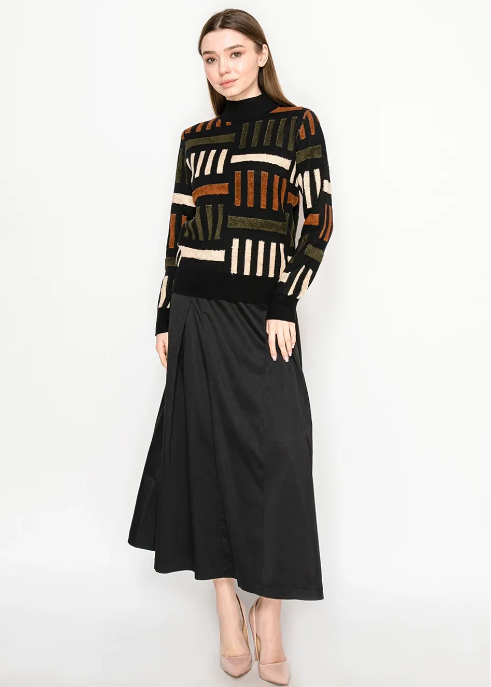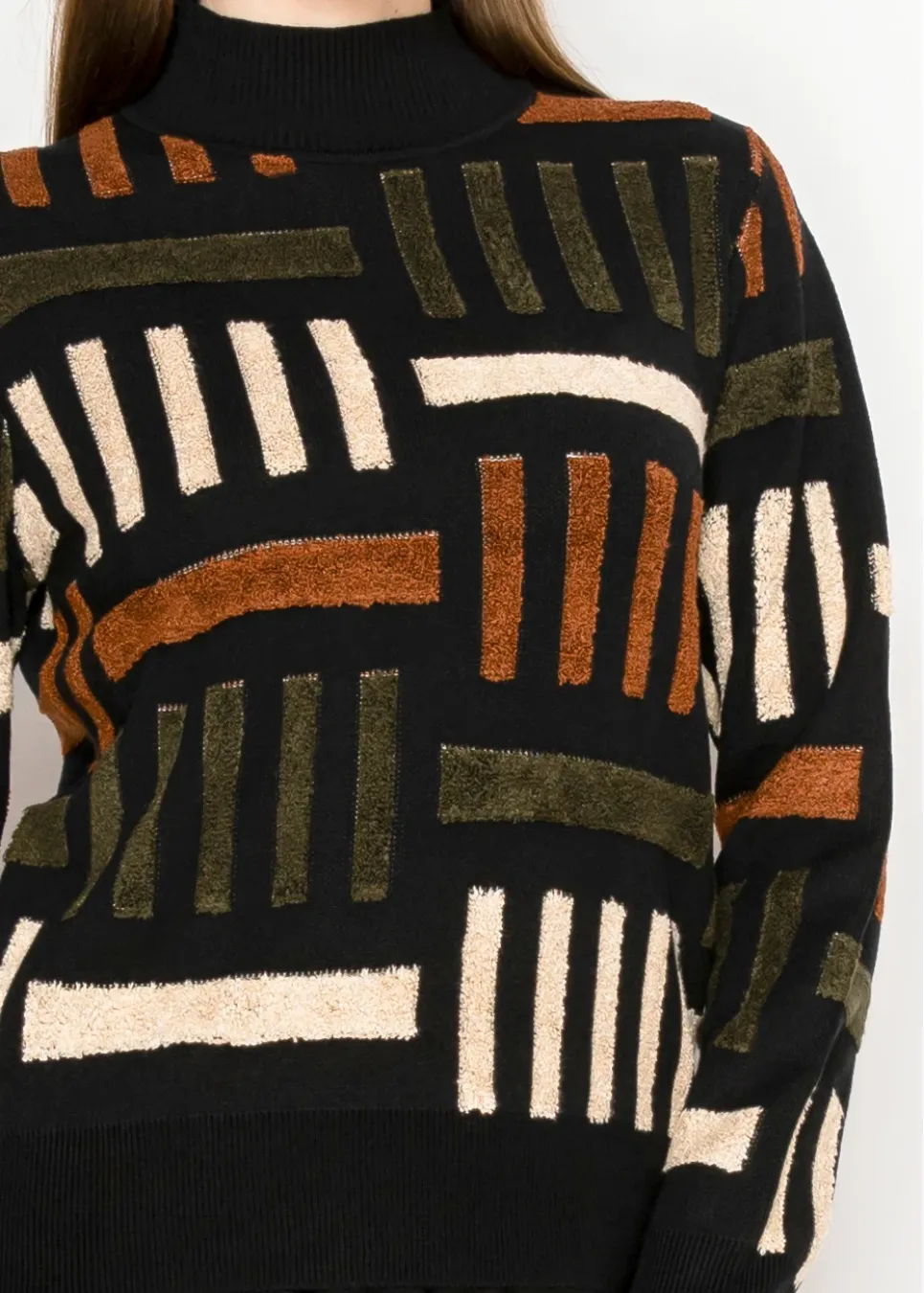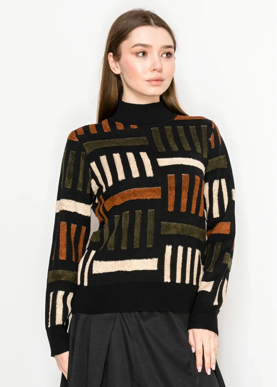 Graphic lines and colorblocked textures give this knit a bold, fashion-forward edge. A statement sweater ready for the spotlight.