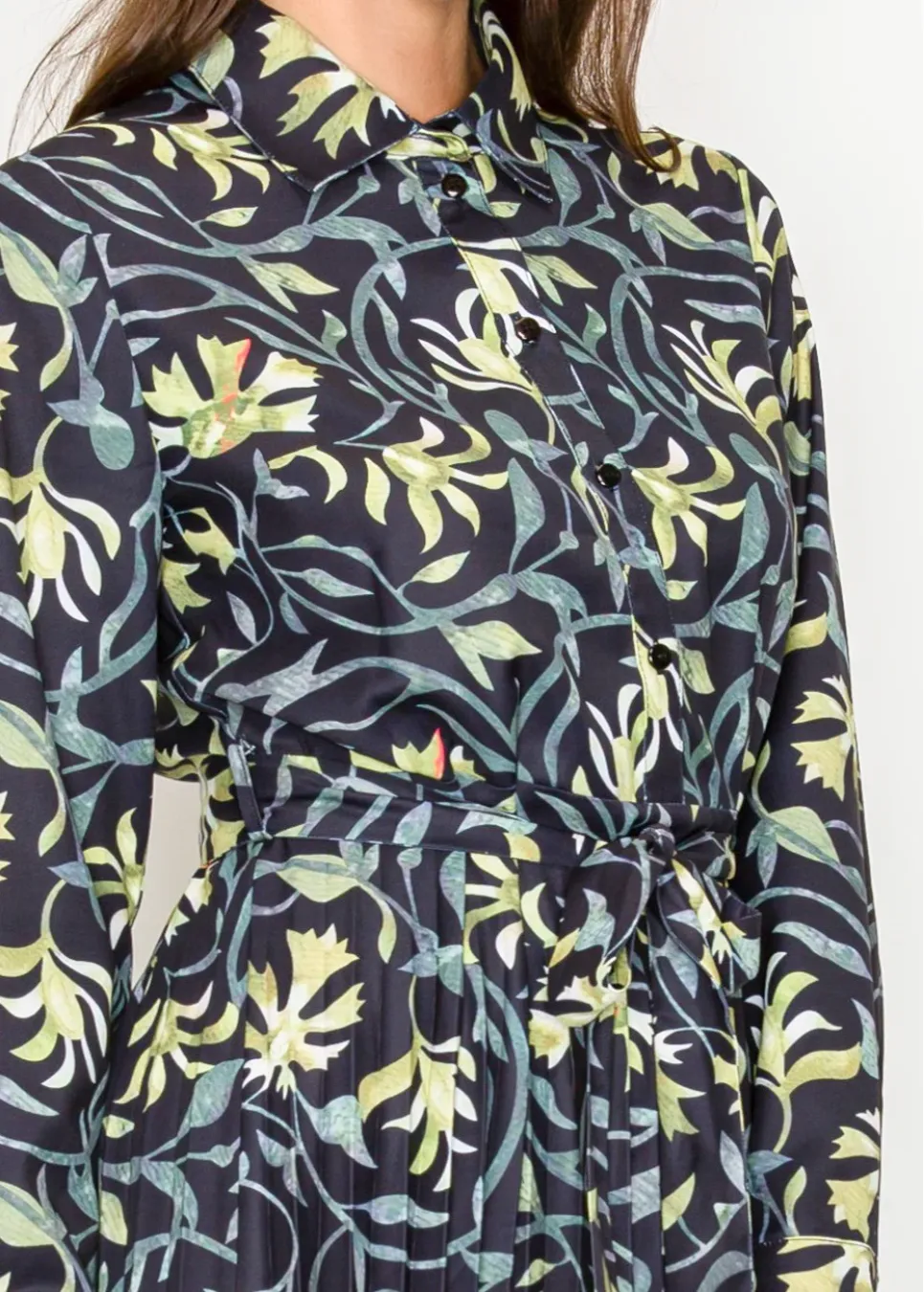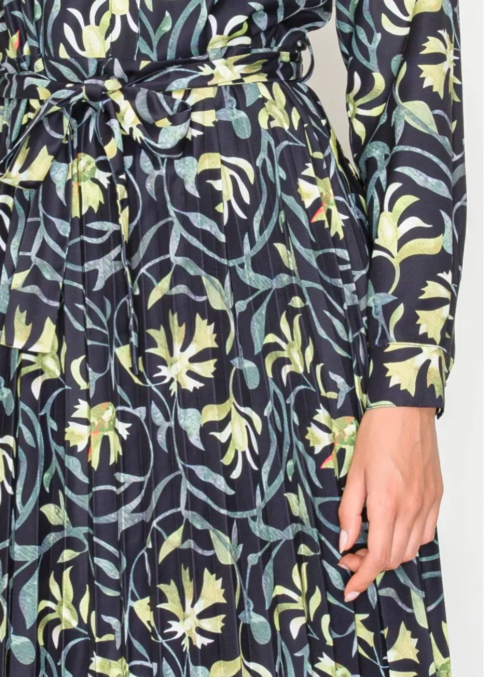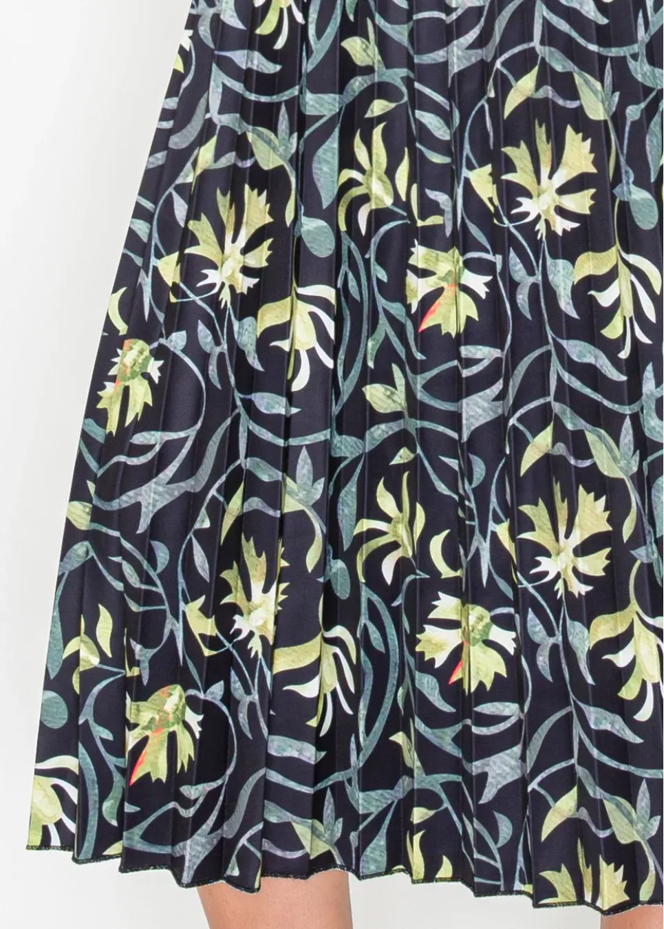 A refined floral midi in deep black, scattered with painterly green blooms. The pleated skirt and tie waist create a graceful, feminine finish.