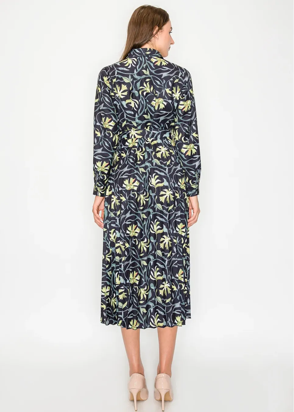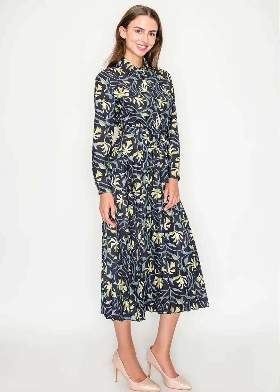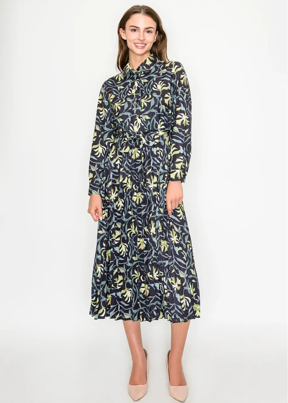 A refined floral midi in deep black, scattered with painterly green blooms. The pleated skirt and tie waist create a graceful, feminine finish.