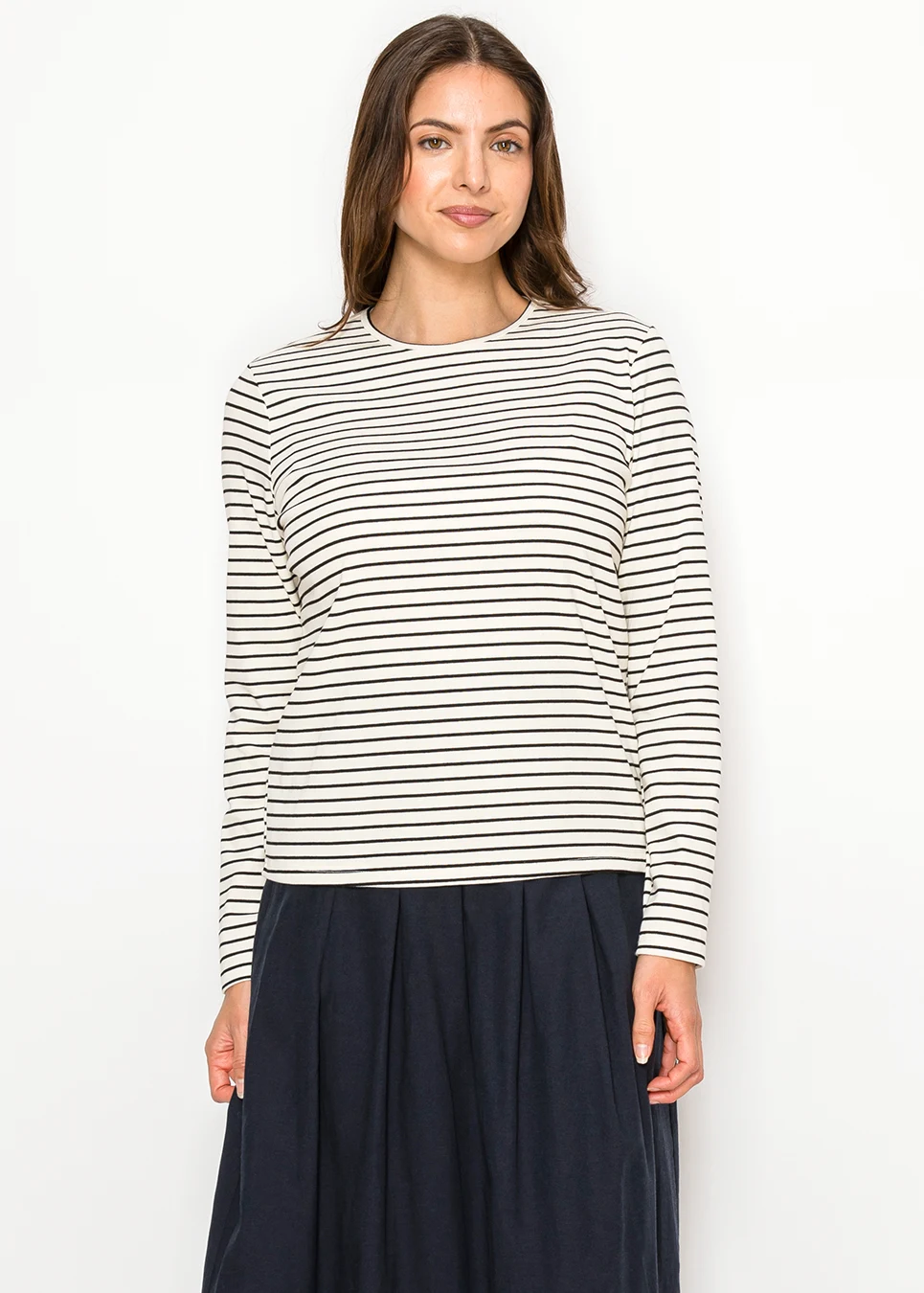 An easy base layer with a polished look, this striped knit has a relaxed straight silhouette that works beautifully tucked or untucked. The fabric feels smooth and flexible, offering enough stretch to stay comfortable while keeping its shape.