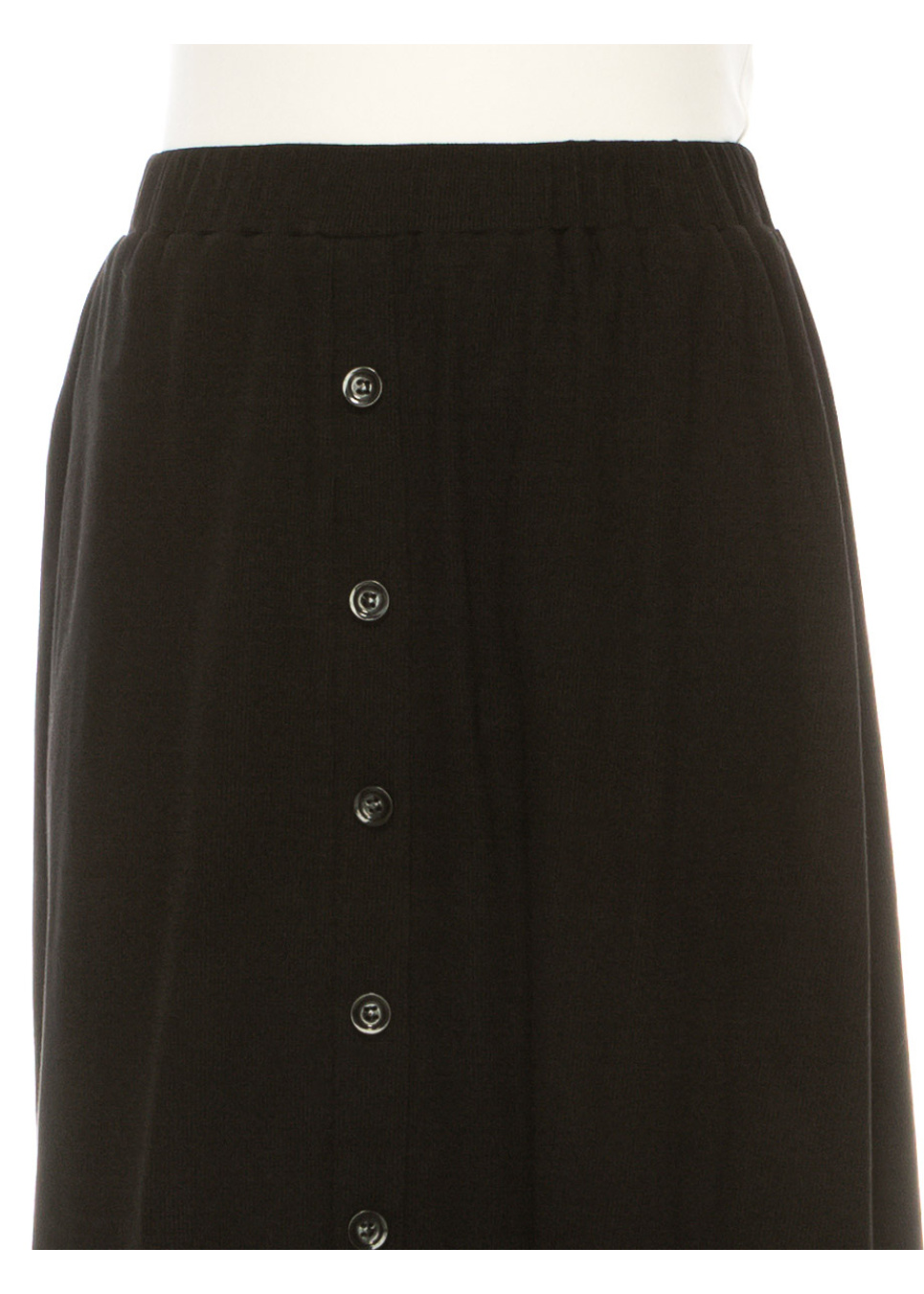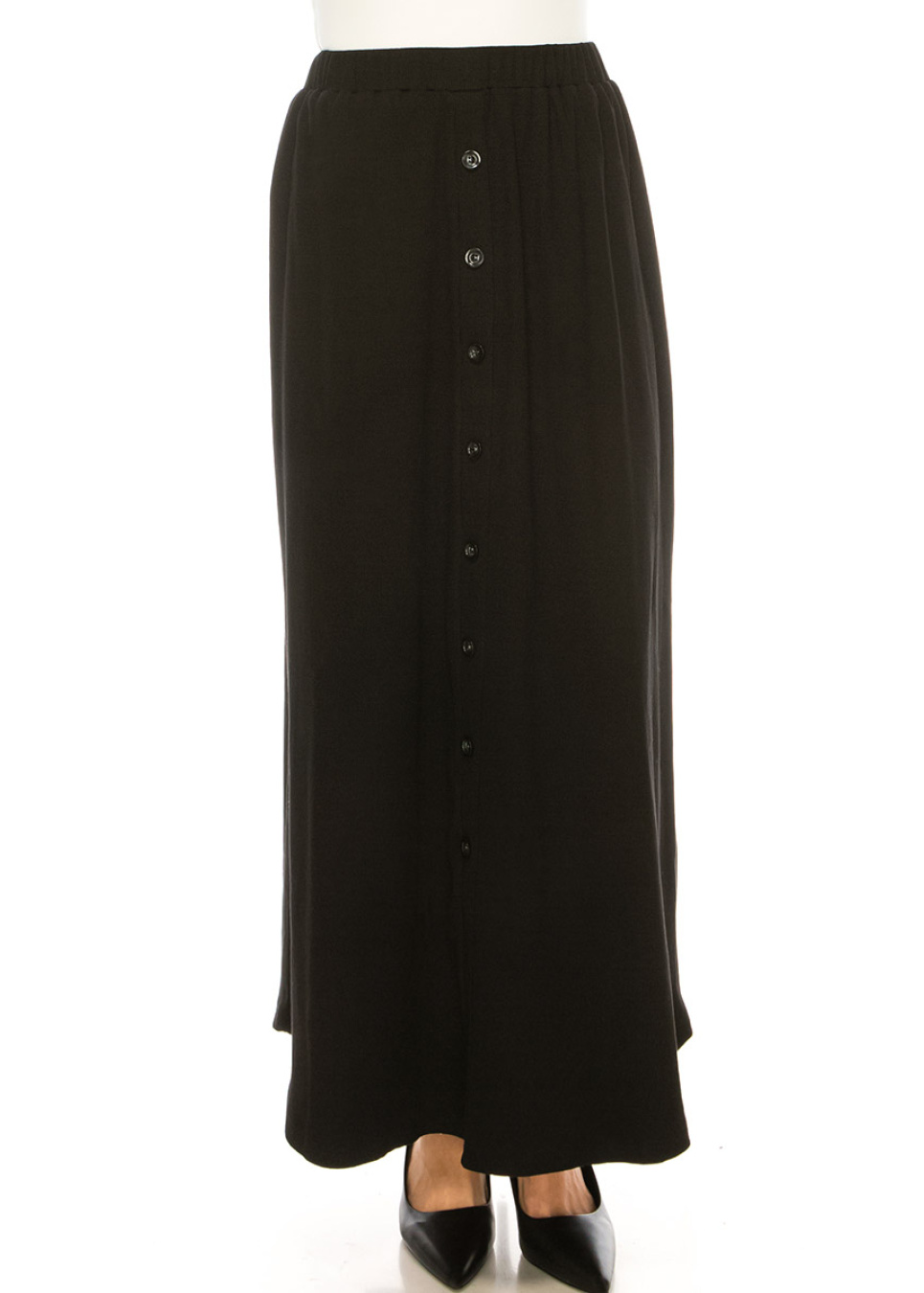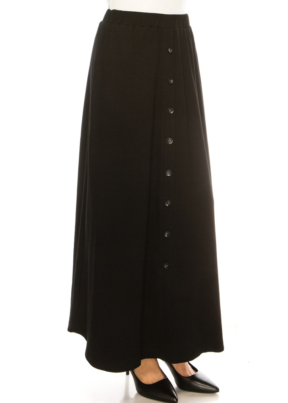 With its striking black color and unique knit texture, this maxi skirt is sure to turn heads. The decorative buttons in the front add a touch of timeless charm, while the modest length makes it suitable for a variety of occasions.