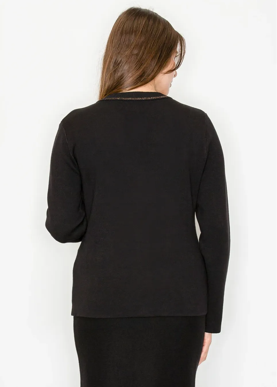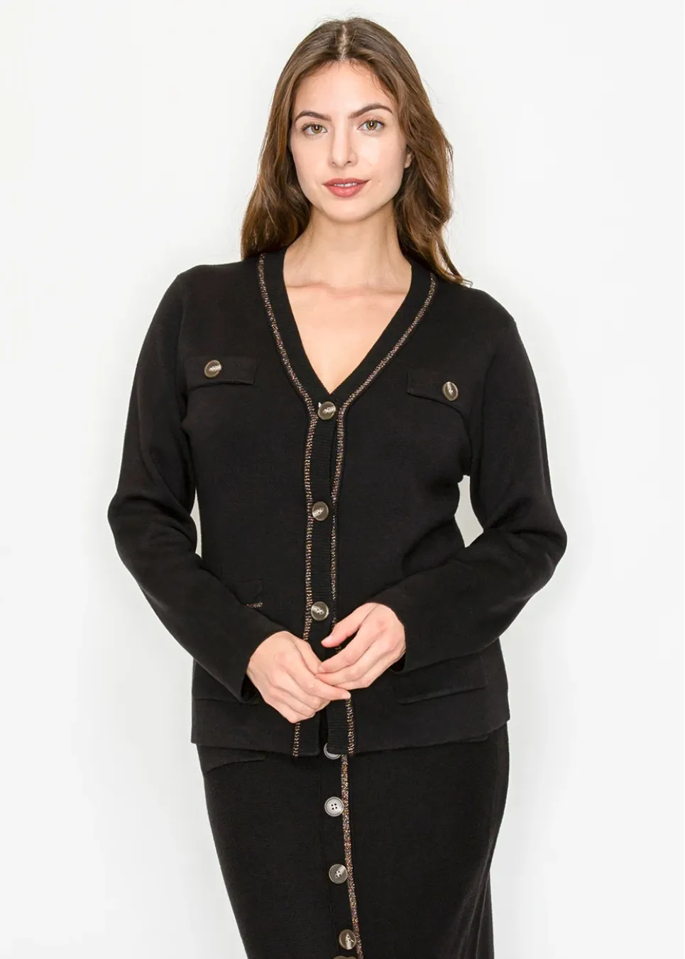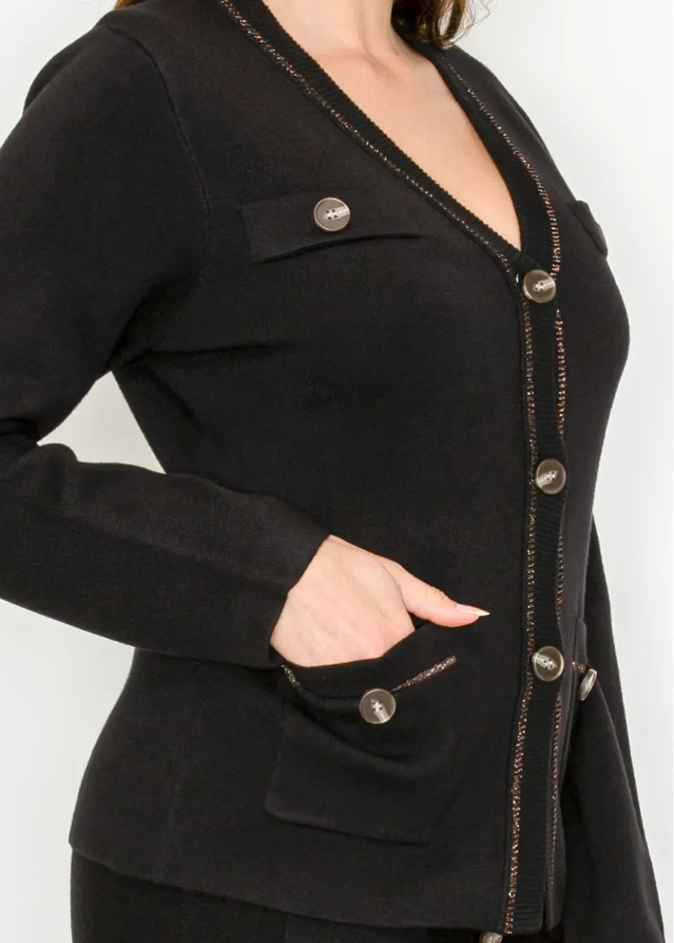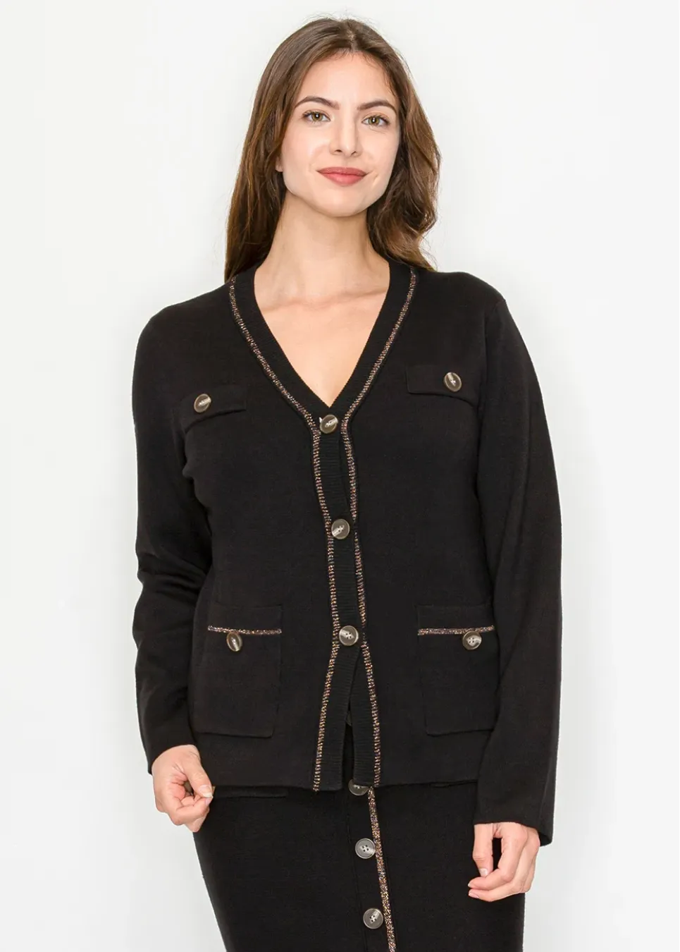 The cardigan you’ll want on repeat — soft knit, handy pockets, and a touch of shimmer at the trim. It feels polished but still easygoing.