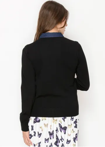 Black Polo Sweater with Denim Detail