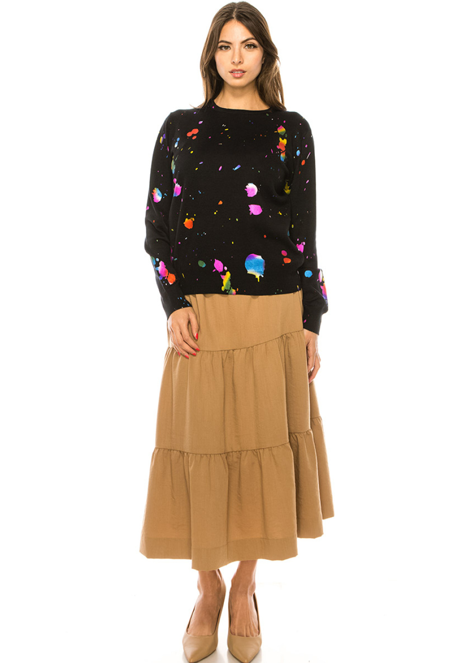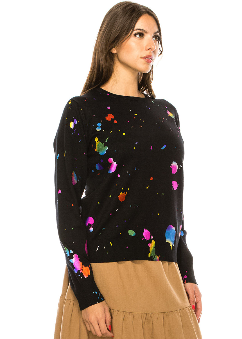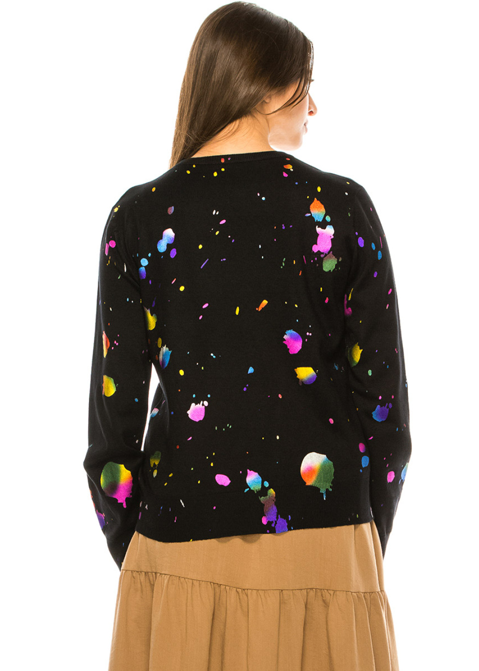 Make a bold fashion statement with our black crew neck sweater featuring eye-catching multicolored spots. The luxurious fabric and flattering silhouette will keep you comfortable and stylish, while the vibrant spots will ensure you stand out from the crowd.