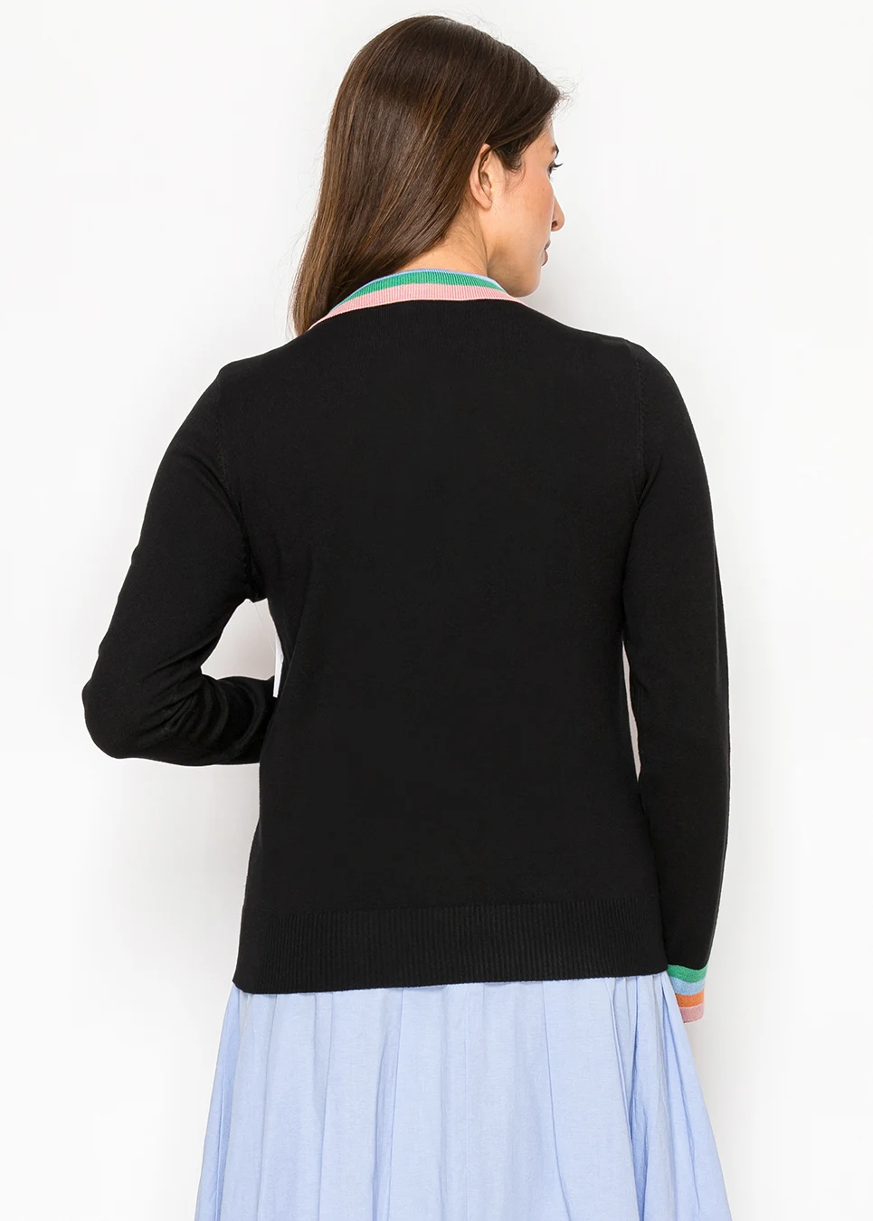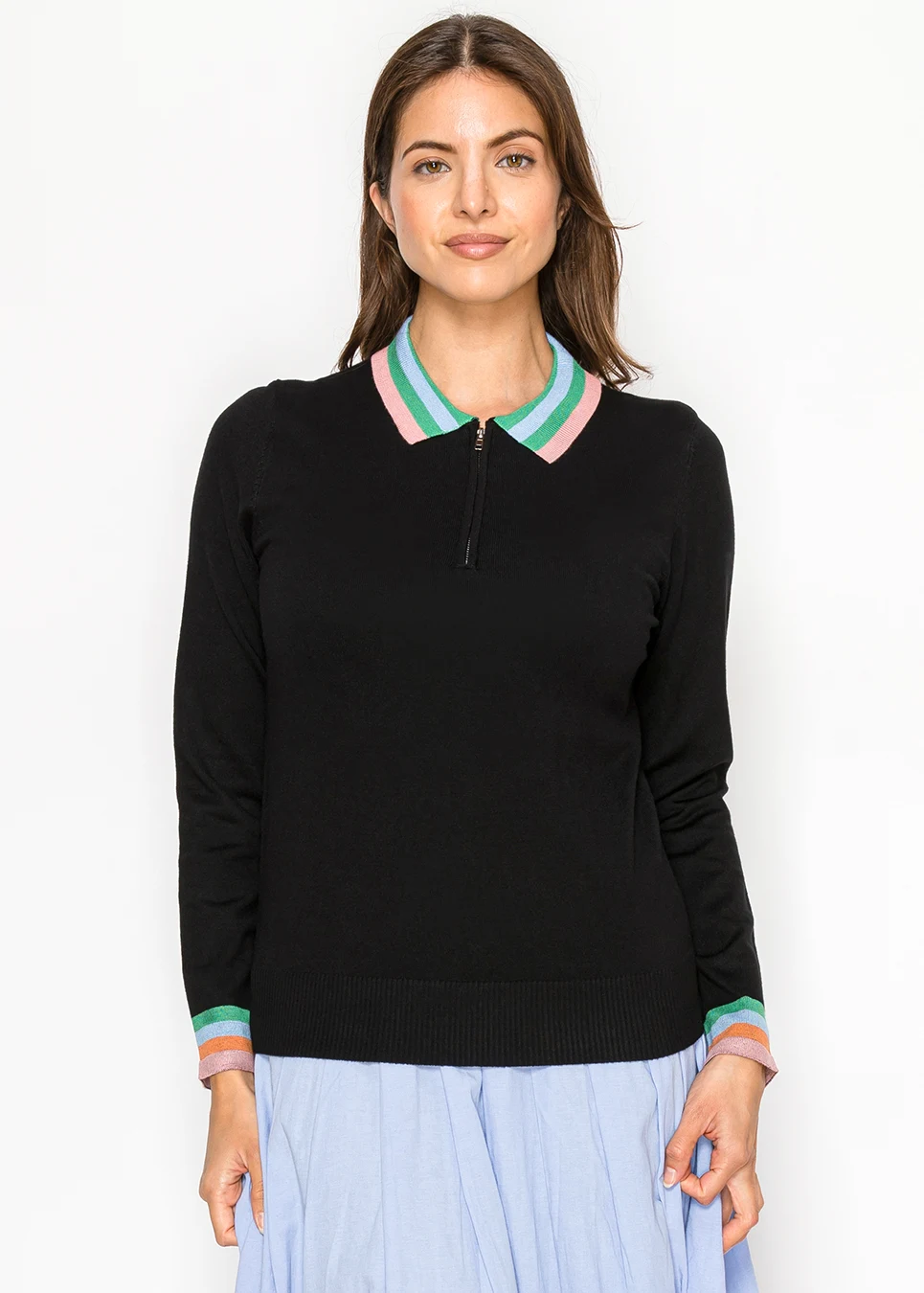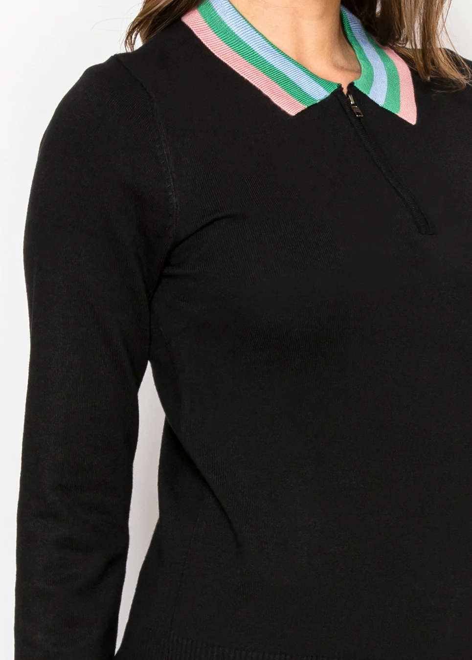 Black Knit Top with Striped Collar and Zip