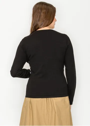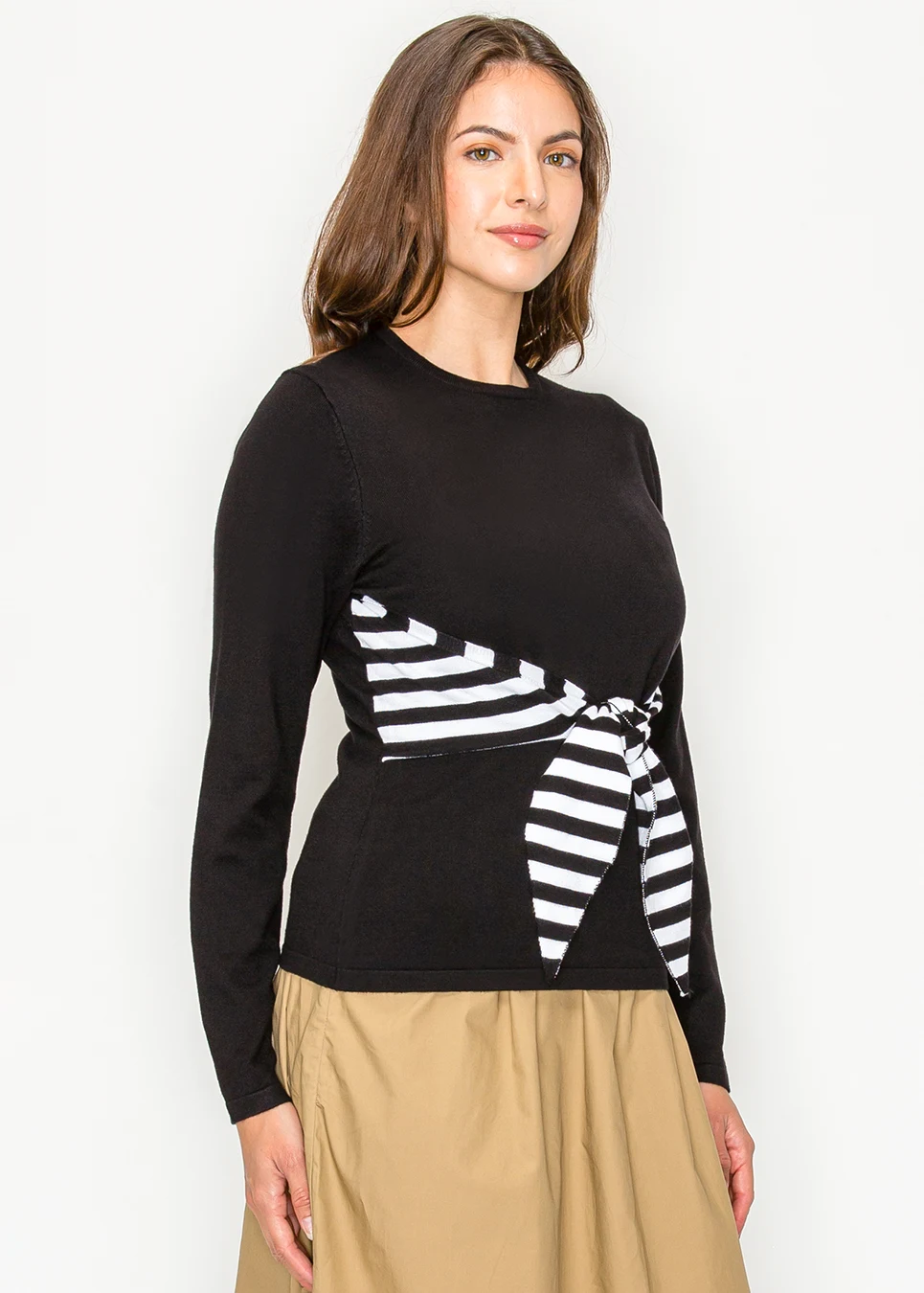 An understated knit elevated by architectural contrast at the waist. The fluid fabric and graphic detailing create a refined, confident silhouette.