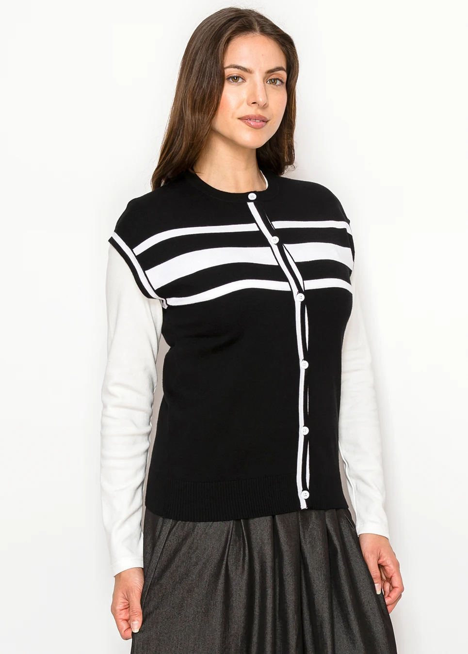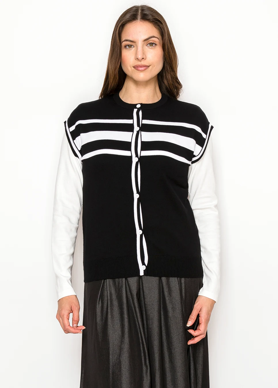 Structured enough to anchor an outfit, simple enough to layer daily. The black knit body is smooth and lightweight; the white stripe panel at the chest adds the visual interest. Button-front close allows easy on and off over any long-sleeve layer.