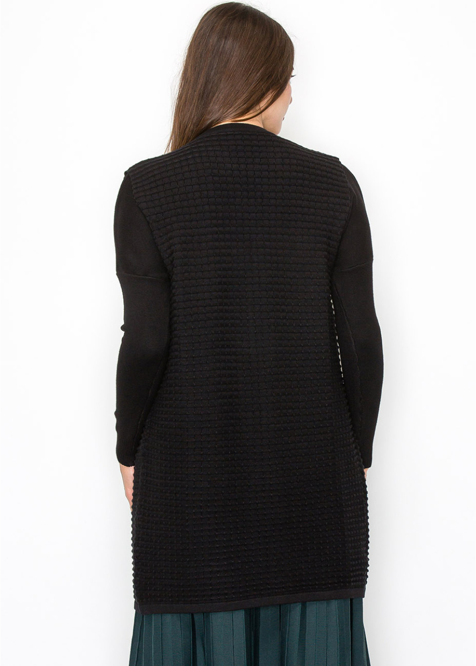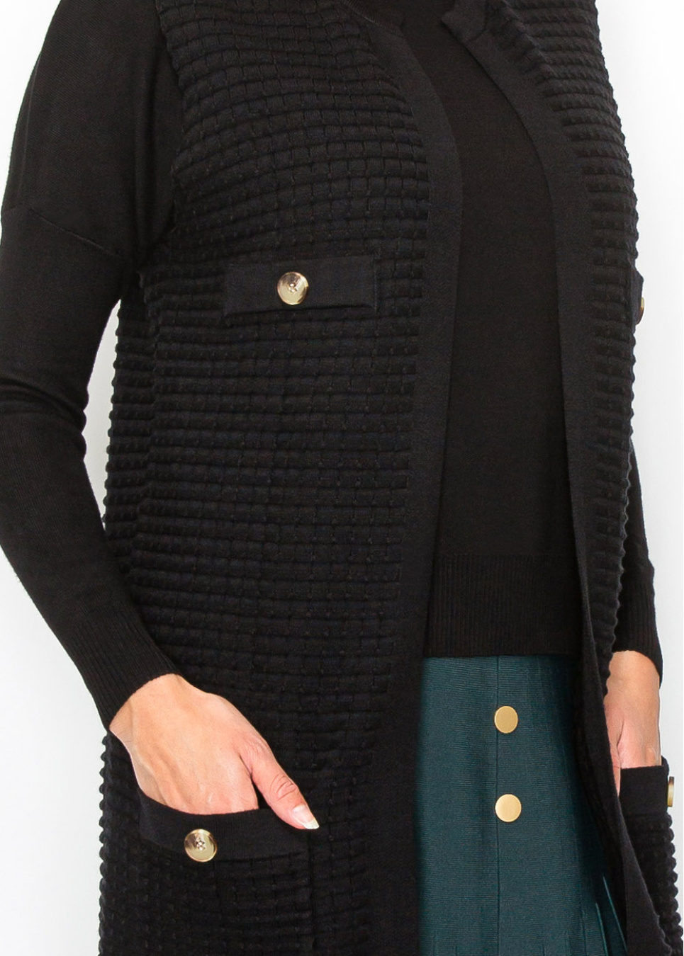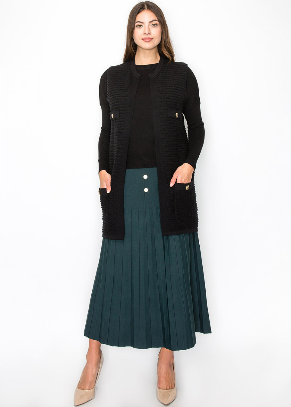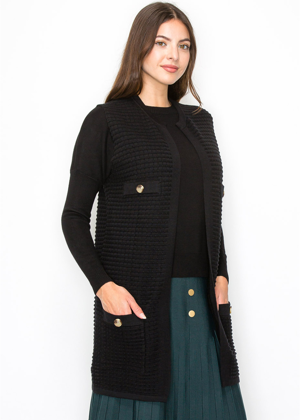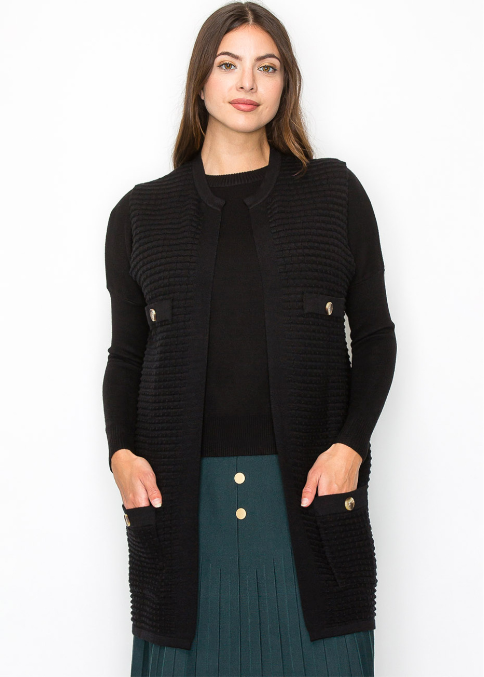 Made from a high-quality knit fabric, this black vest features a unique square texture that gives it depth and character. The gold-buttoned pockets add a touch of luxury, making this vest a versatile piece for layering over long-sleeve tops for a modest yet polished look.