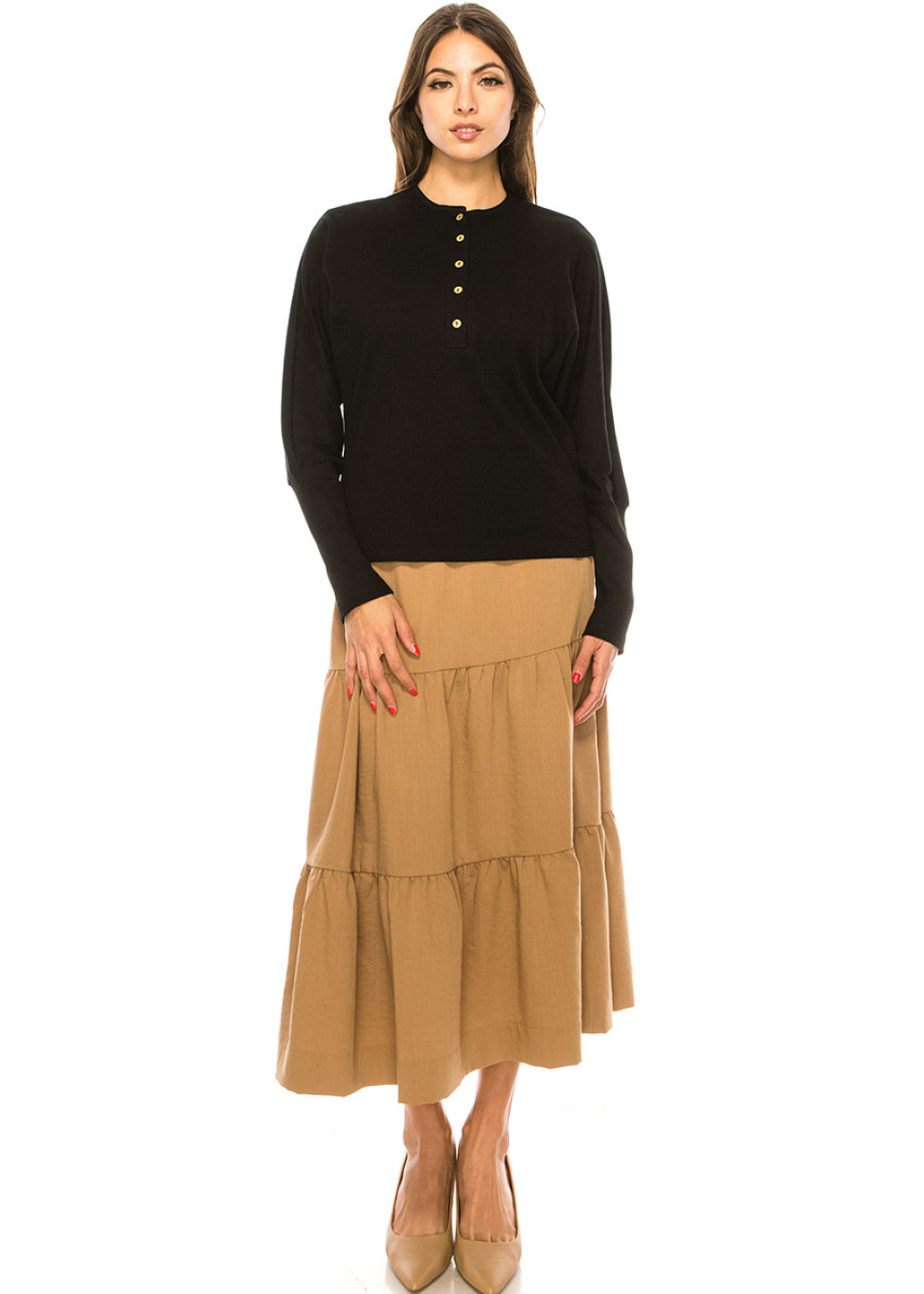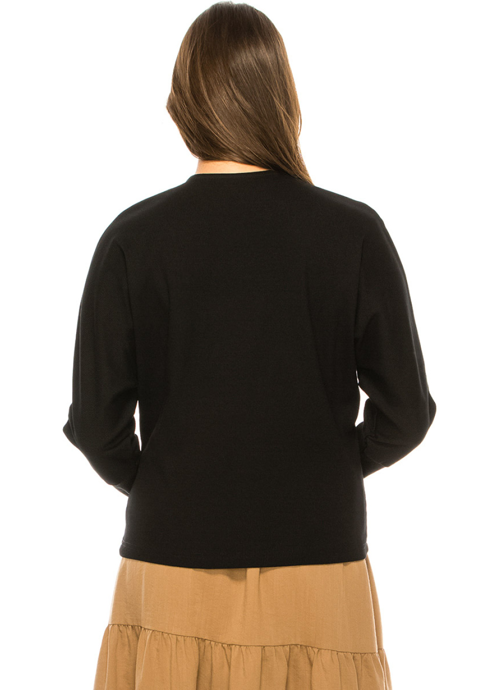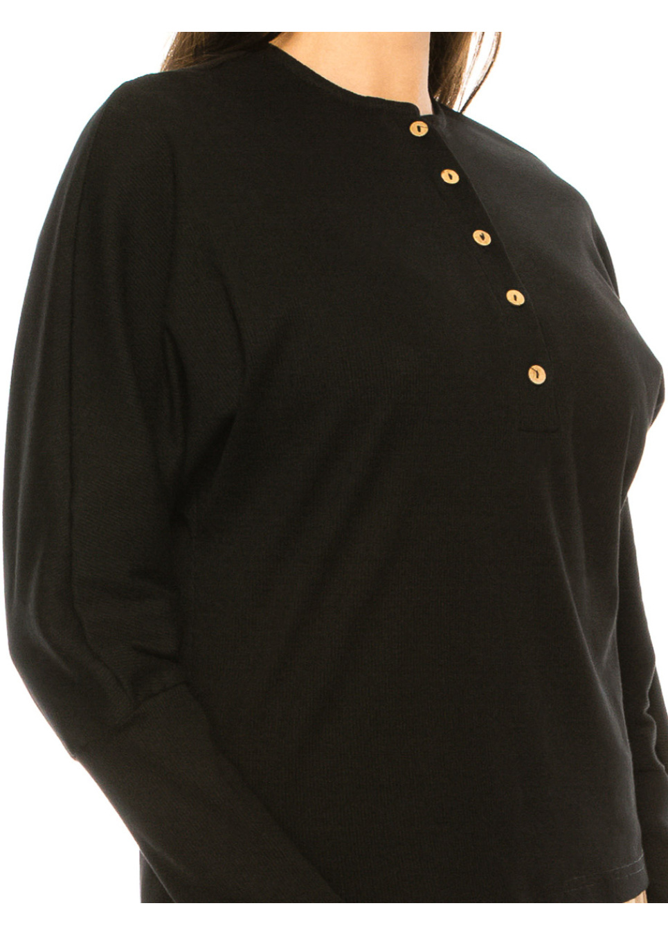 Experience both comfort and style with this beautiful black long sleeve t-shirt. The leg of mutton sleeves add a touch of refinement to the classic color, while the quarter button neckline is both elegant and sophisticated. The soft fabric provides a luxurious feel, making it an essential piece in your modest wardrobe.