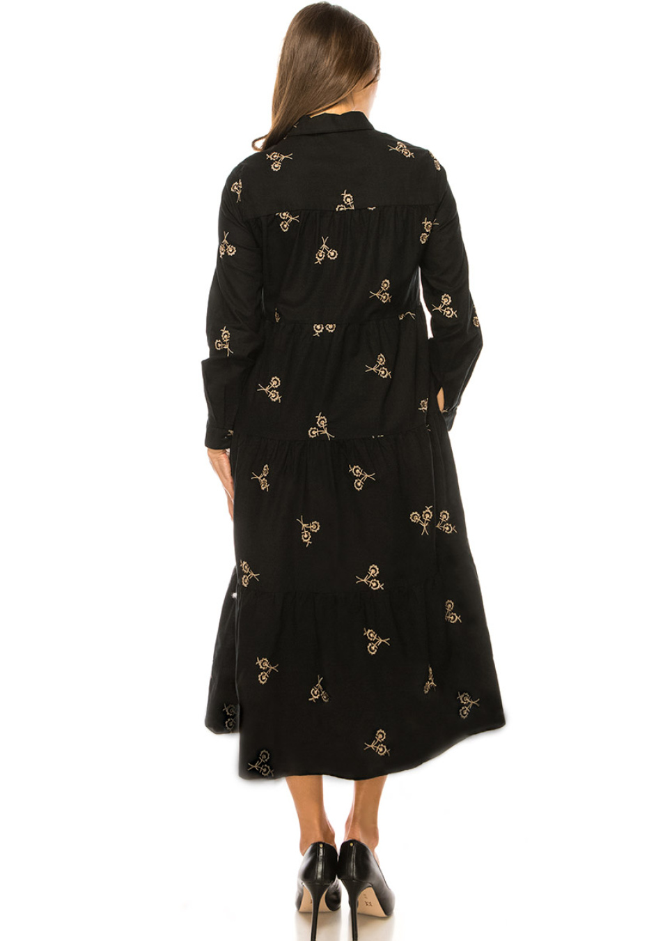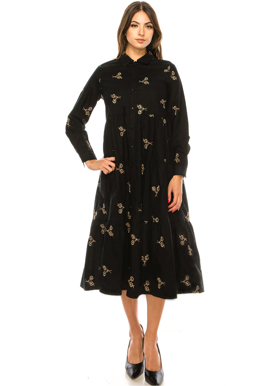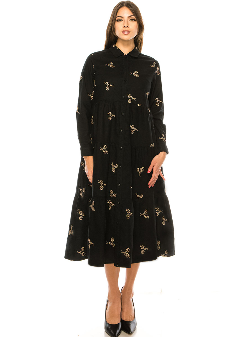 Style meets sophistication in this black linen midi dress. The shirt collar and button-down front add a touch of classic elegance, while the A-line silhouette flatters your figure with a chic and modern look. The long sleeves provide coverage and warmth, making it perfect for any season. This dress is a must-have addition to your wardrobe for a polished and refined look that never goes out of style.