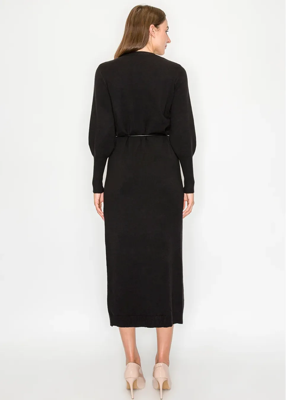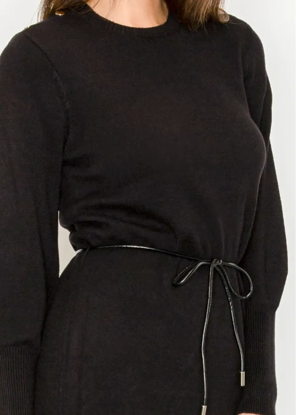 A soft knit dress in timeless black, finished with ribbed cuffs, a crew neckline, and a slim belt for a flattering fit.