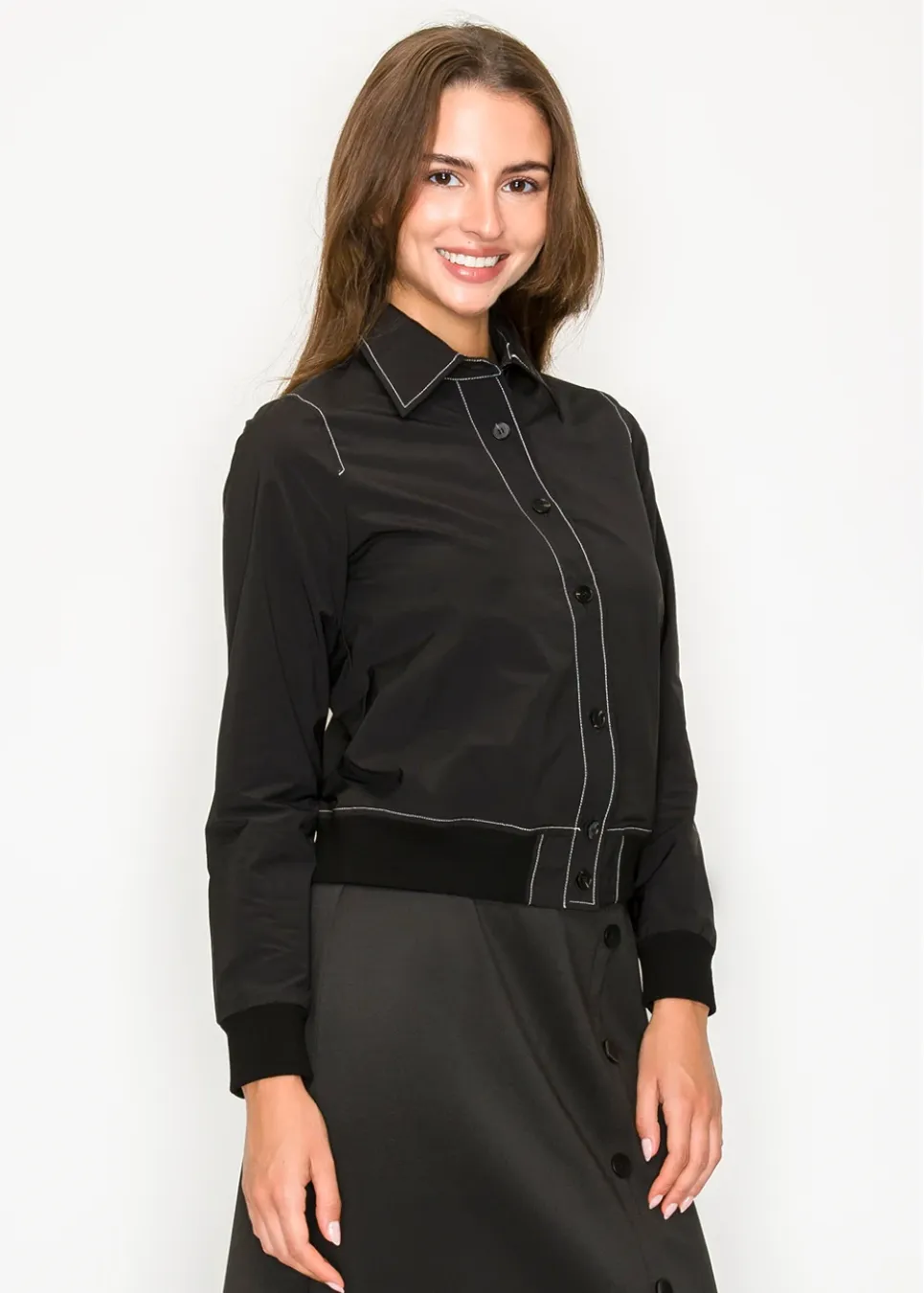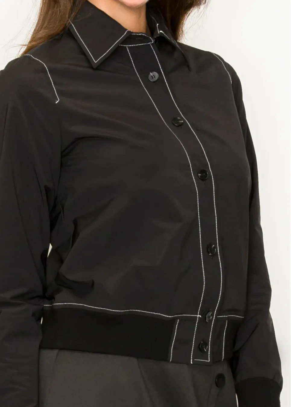 Not your average button-up — this one’s got a cool elastic hem and bold stitching that make it easy to wear and hard to forget. Dress it up or keep it casual.