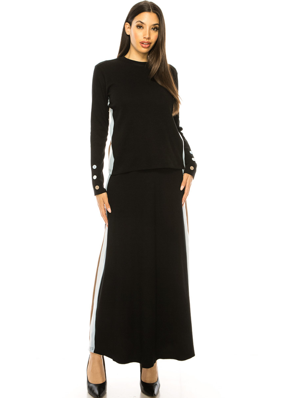 Express your unique style with this black long sleeve t-shirt. The colorful stripes on the sides and decorative buttons on the sleeves add a playful touch to this modern piece. Whether you're on the go or dressing up for a special occasion, this top is a versatile addition to your wardrobe. Get ready to make a statement with its comfortable fit and chic design.