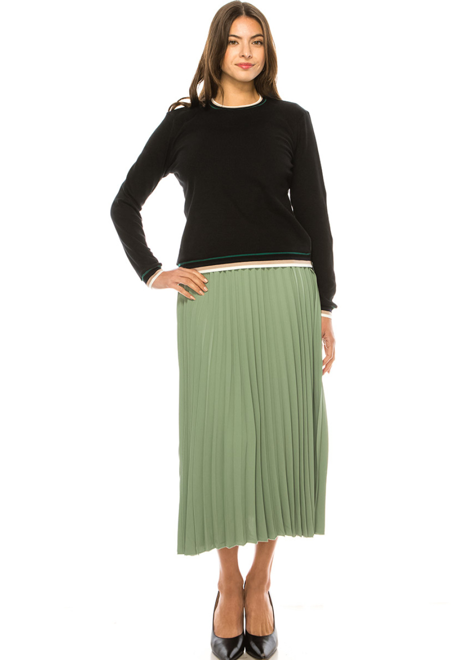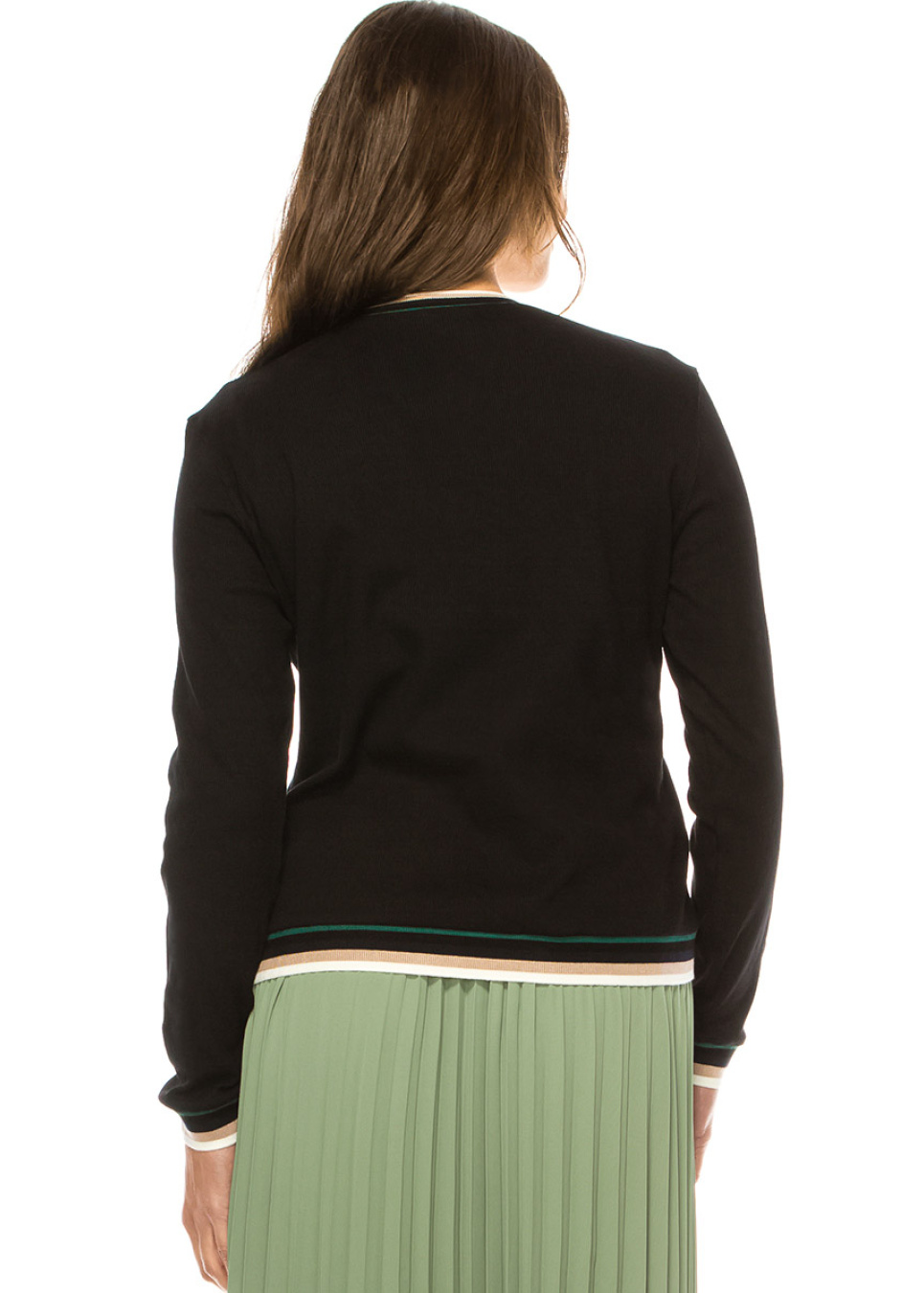 Bold and beautiful, this black long sleeve t-shirt is the perfect addition to your wardrobe. The striped elastic cuffs and hem add a touch of texture and design, while the side zipper creates a unique and unexpected detail that's sure to turn heads.