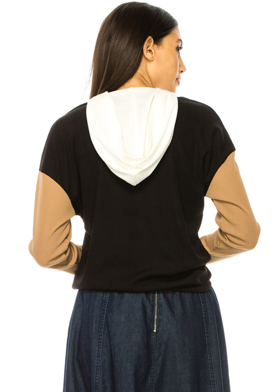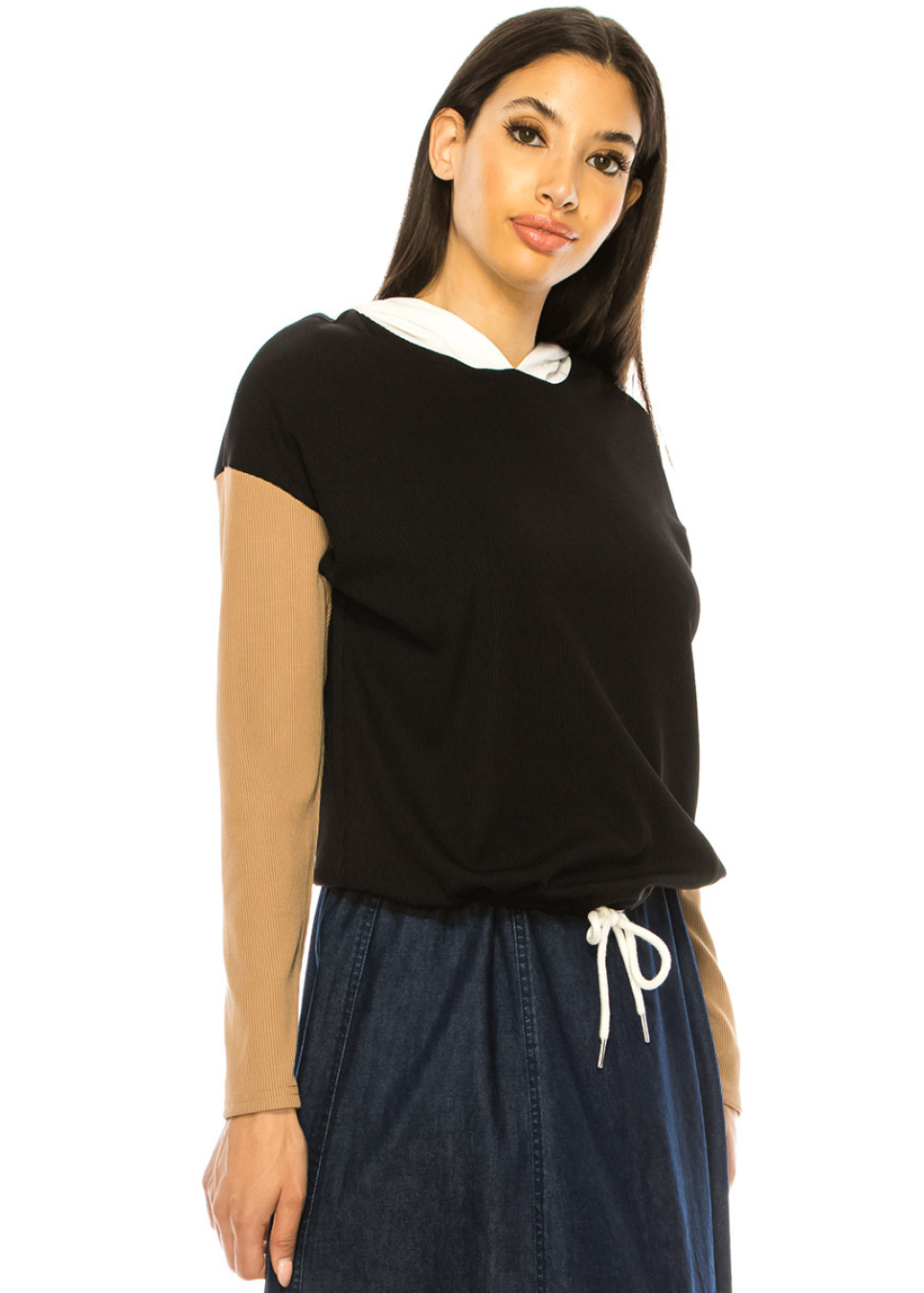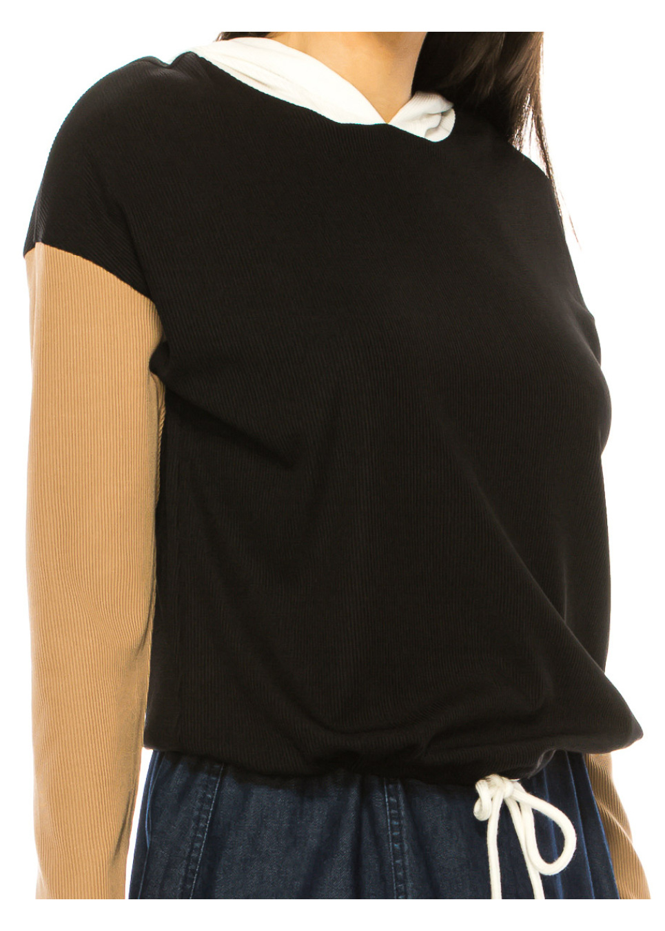 Stay comfortable and sporty with this YAL New York long sleeve t-shirt. The white hood and black body give it a casual and relaxed look, while the camel sleeves add a touch of warmth and style. The drawstring bottom and loose fit make it perfect for a workout or a casual day out.