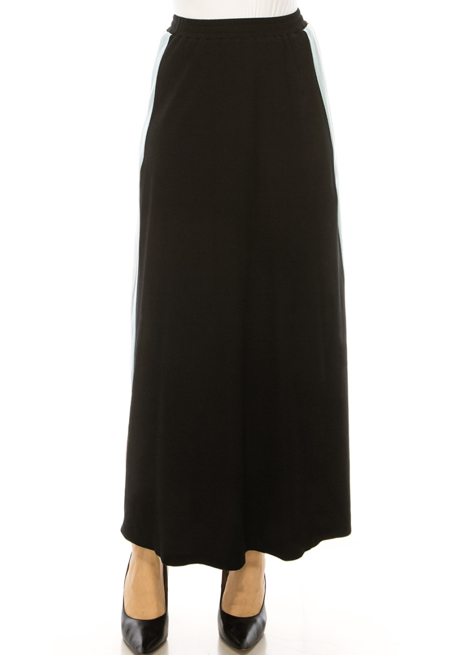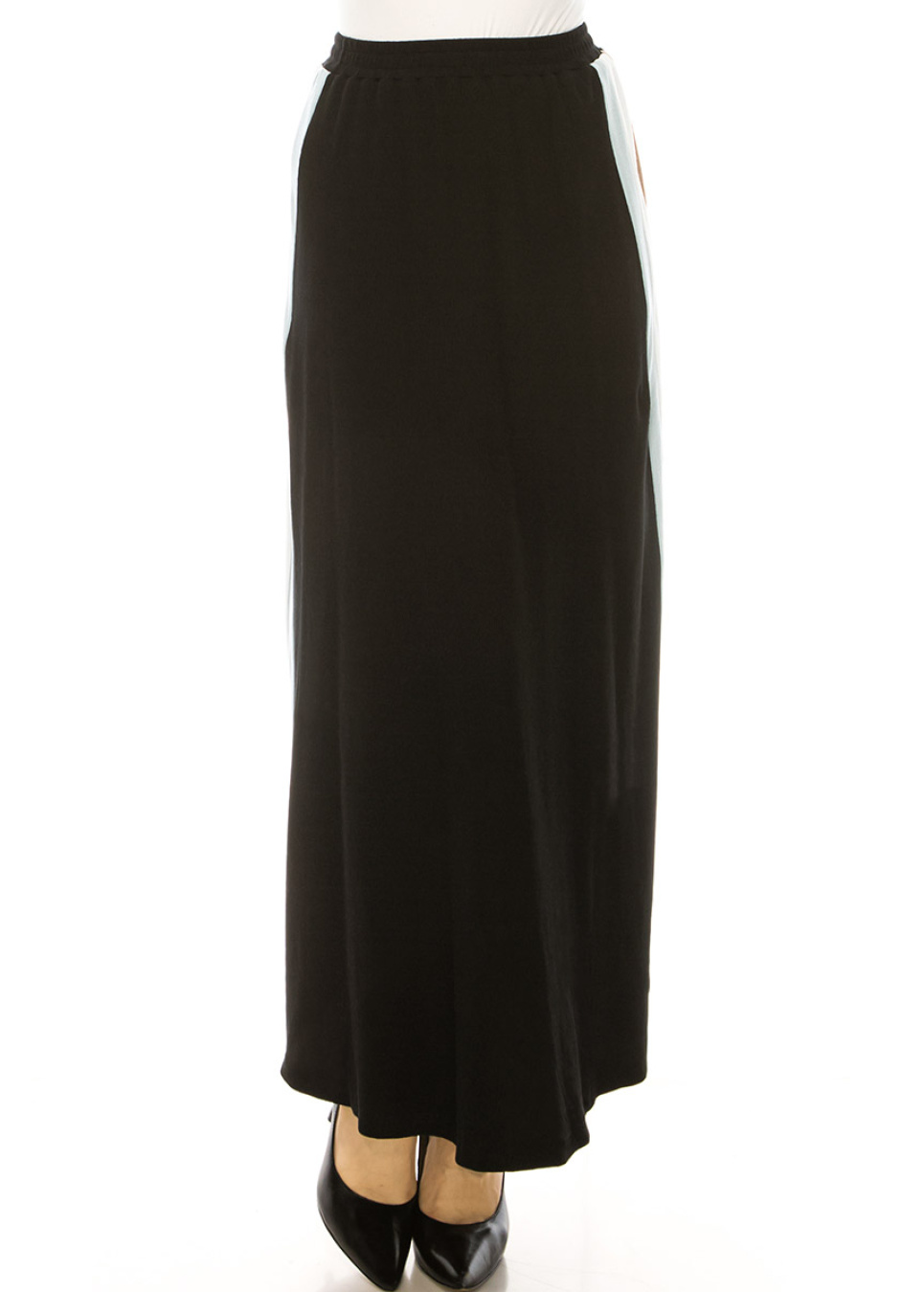In the perfect blend of practical and stylish, this black knit maxi skirt with colorful stripes along the sides is a must-have for any modest wardrobe. Dress it up or down for any occasion and show off your unique sense of style. Don't miss out on the chance to elevate your fashion game with this comfortable and fashionable skirt.